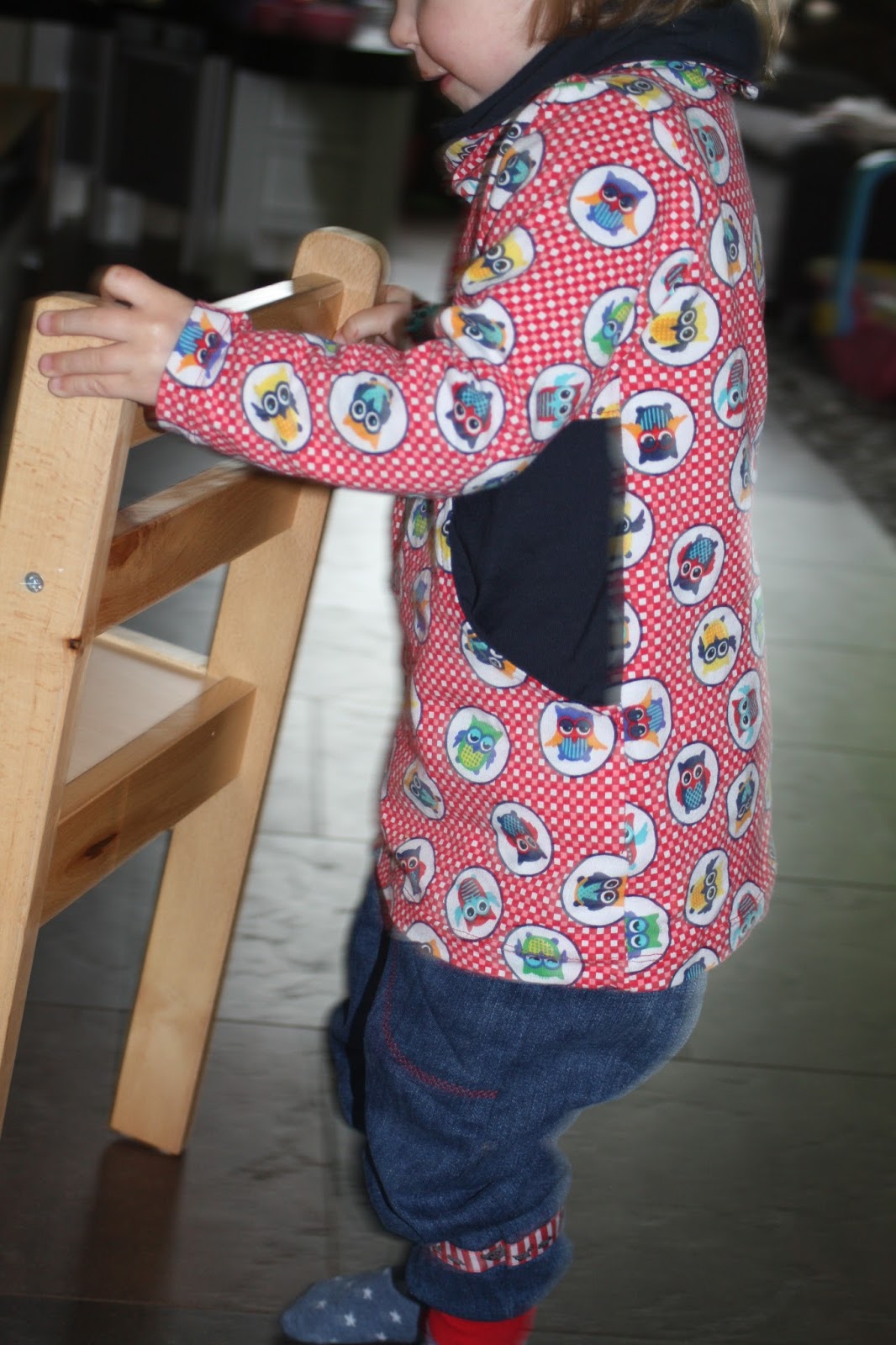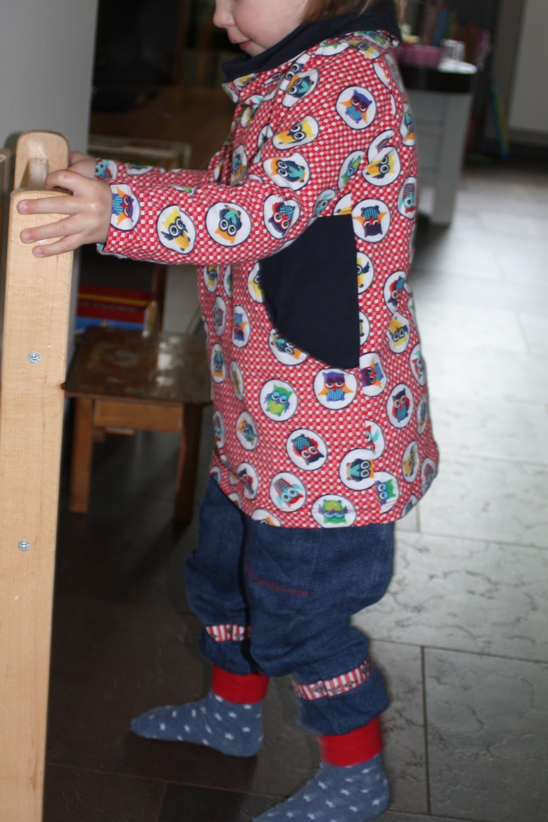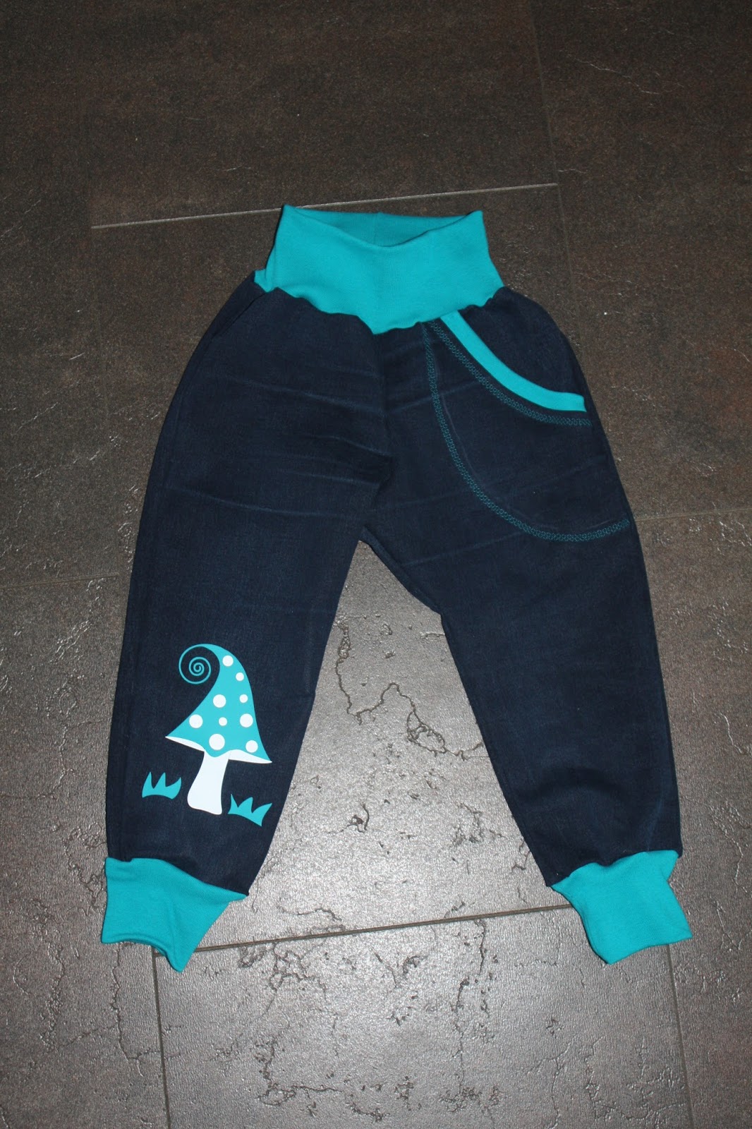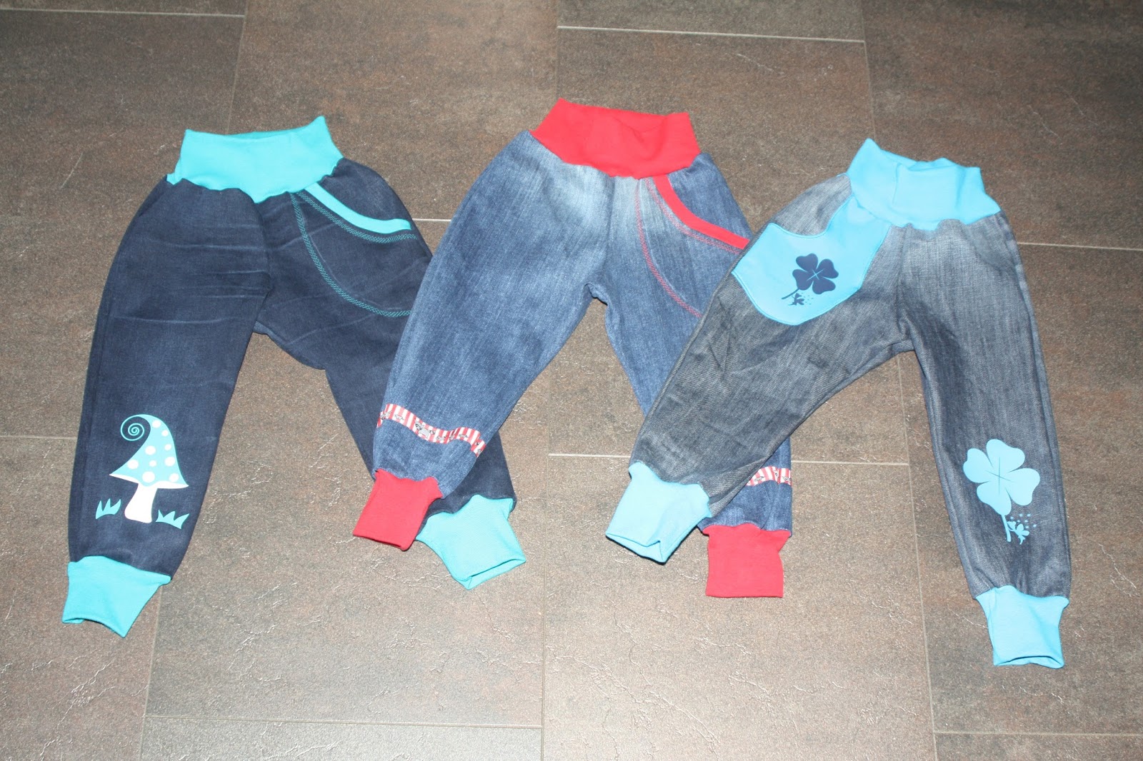 Ich habe von einigen Bekannten alte Jeans bekommen und so sind direkt drei neue Hosen für Madita in der nächsten Größe entstanden. Als Schnitt habe ich die coole Hose aus dem Buch „Nähen mit Jersey für Babys – Babyleicht“ von Pauline verwendet und zusätzlich Taschen dran gemacht. Zwei der Hosen sind mit einem Plottmotiv verziert und eine mit Webband.