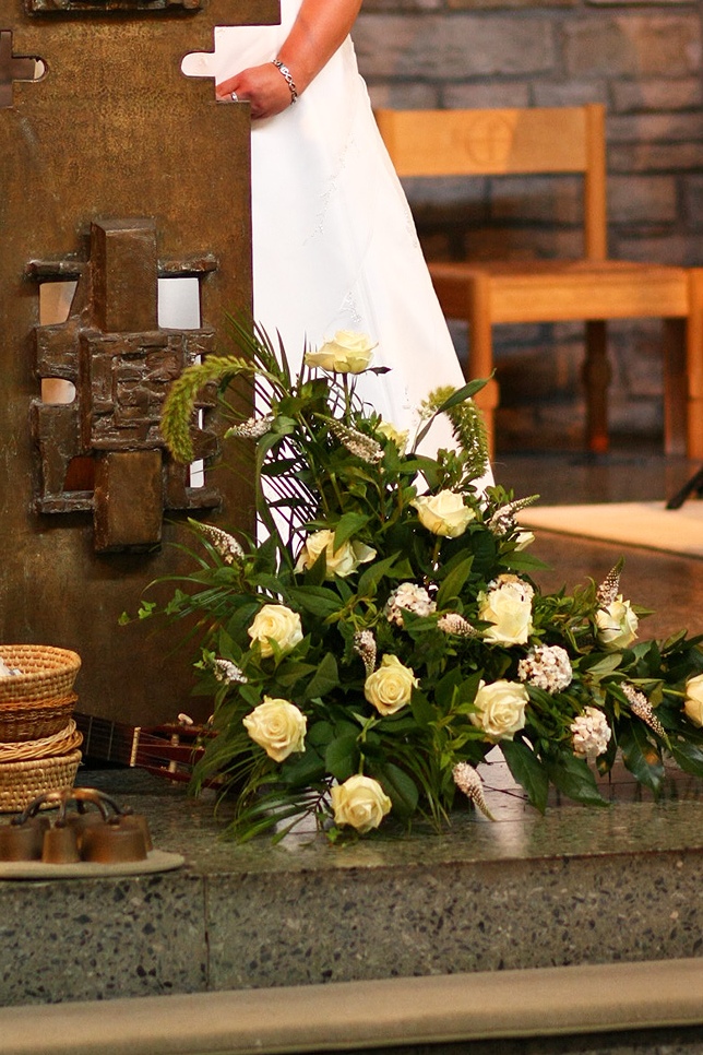 Die Gestecke für Altar und Ambo haben wir bei einem Blumenhändler vor Ort bestellt.