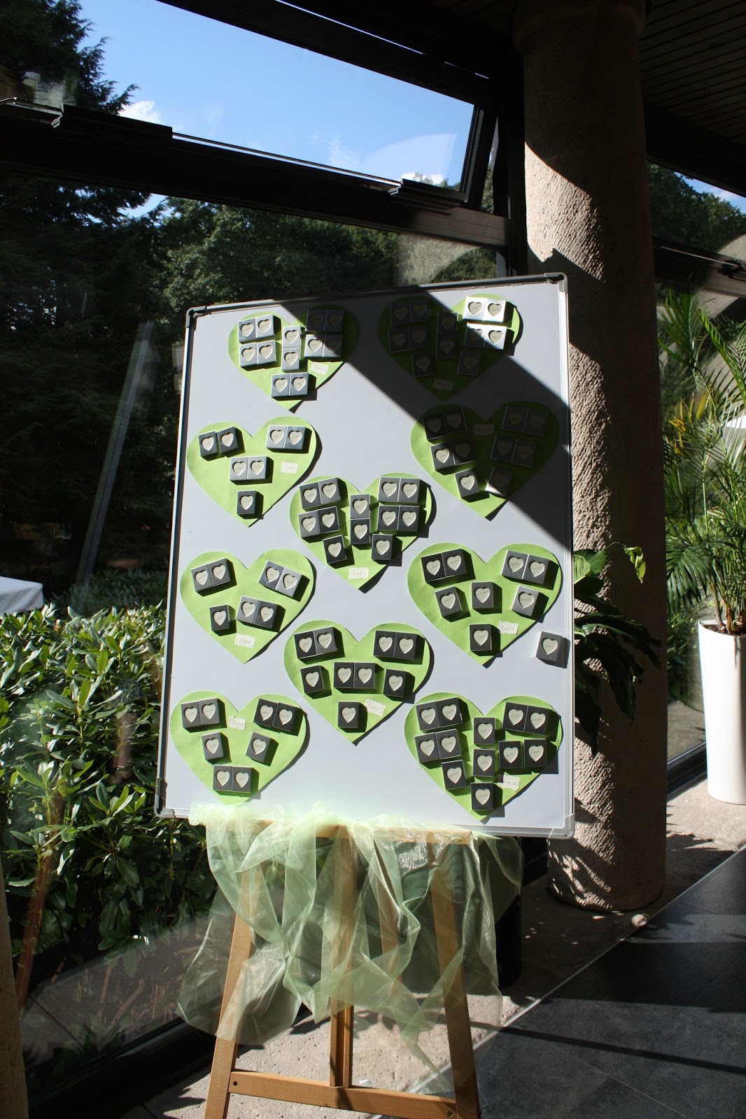 Wir haben uns entschieden den Gästen nur einen festen Tisch zuzuteilen, aber am Tisch dann den Platz selbst zu wählen. Für jeden Gast haben wir einen kleinen Magnetbilderahmen besorgt, indem statt eines Fotos ein Namensschild steckte. Auf einer großen Magnettafel hingen für jeden Tisch ein nummeriertes Herz auf dem dann jeweils die Magnetbilderrahmen angebracht waren.