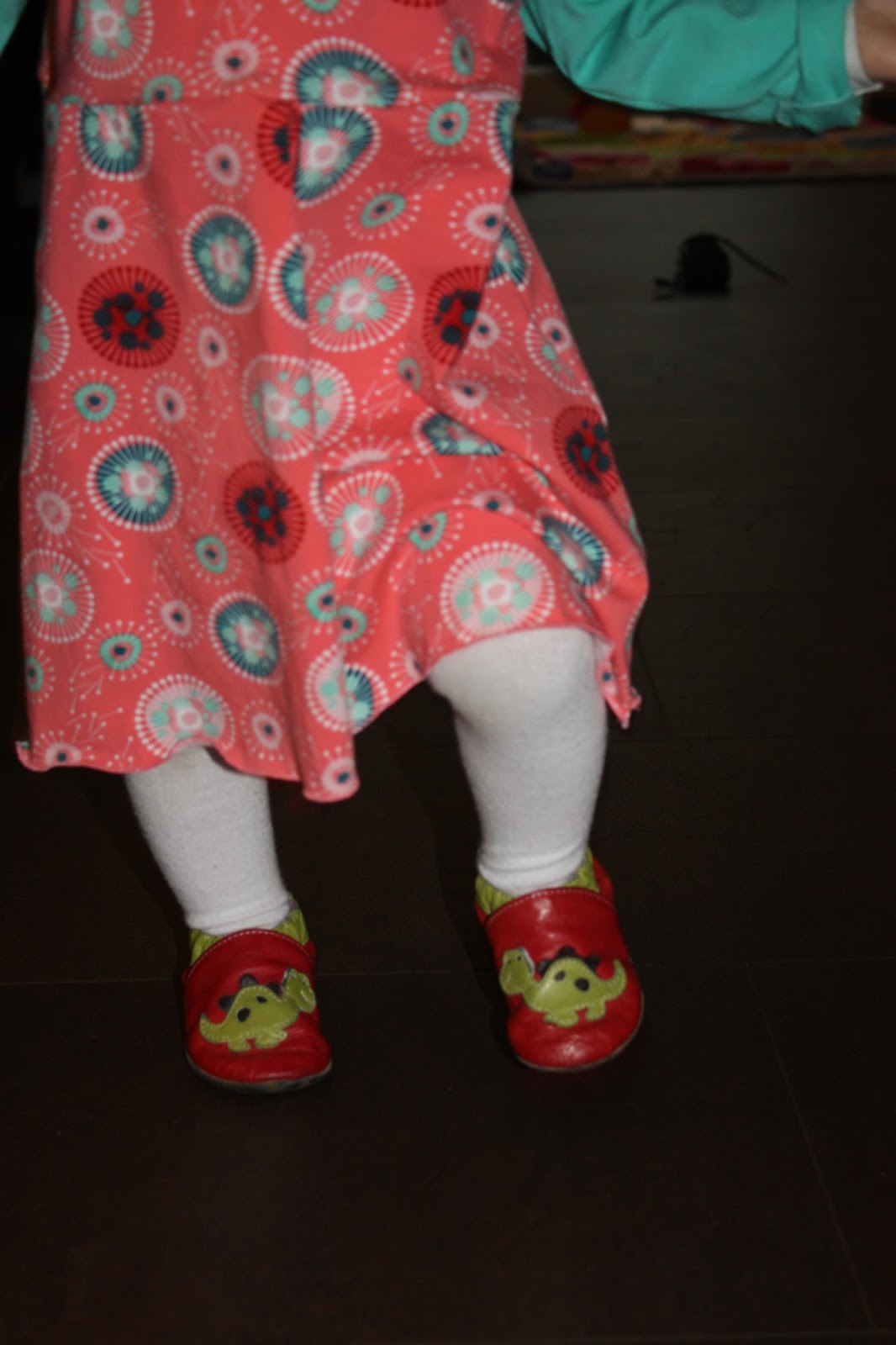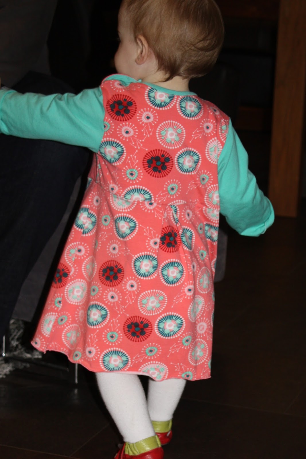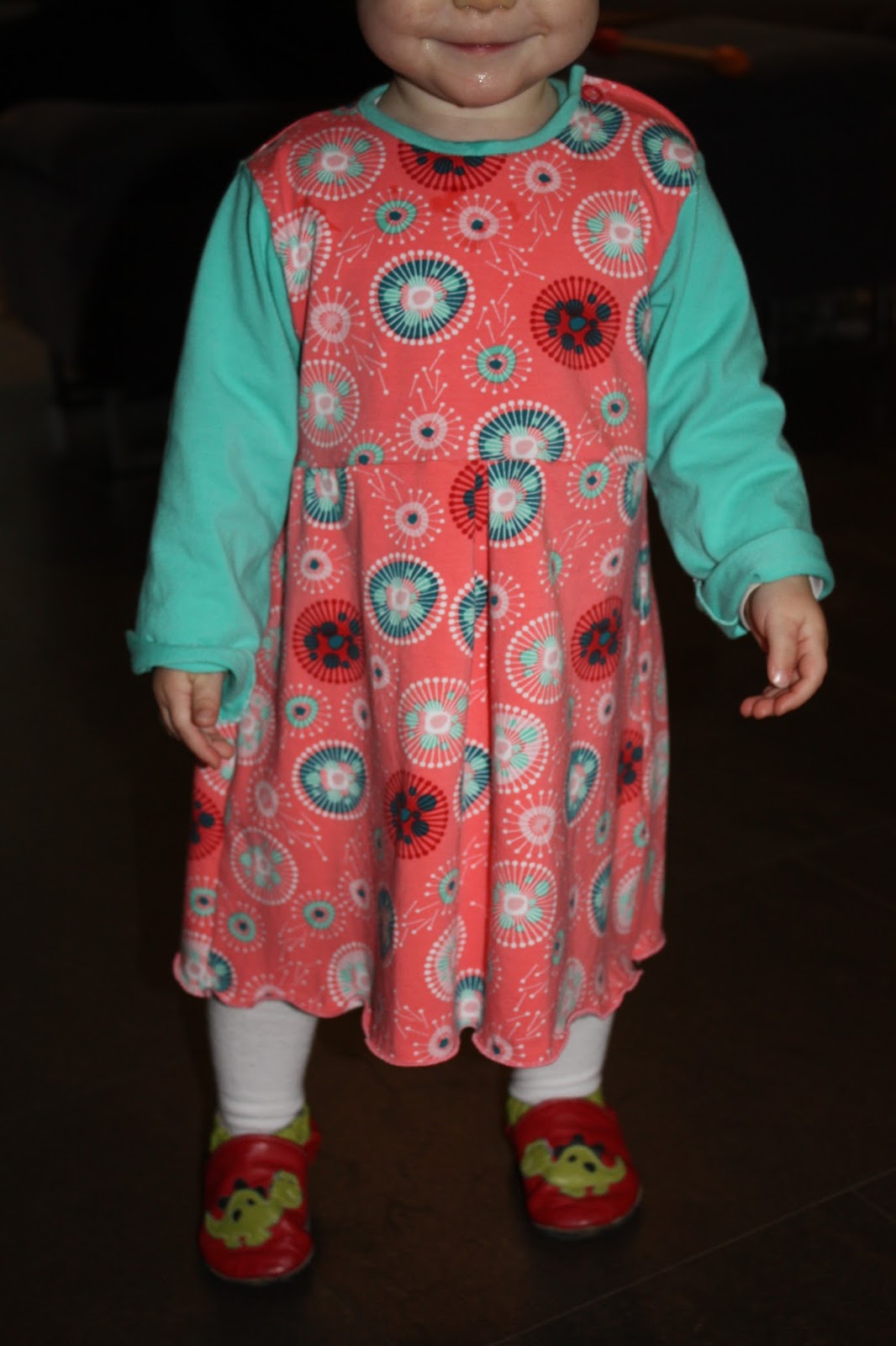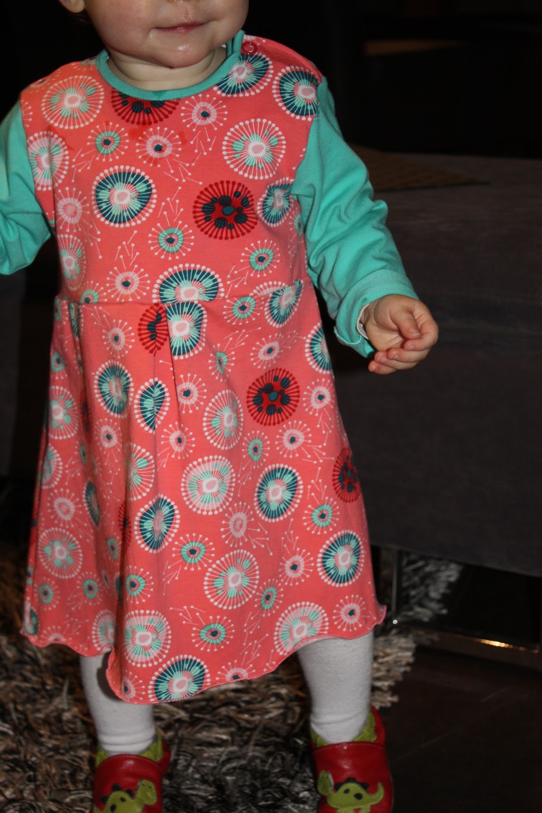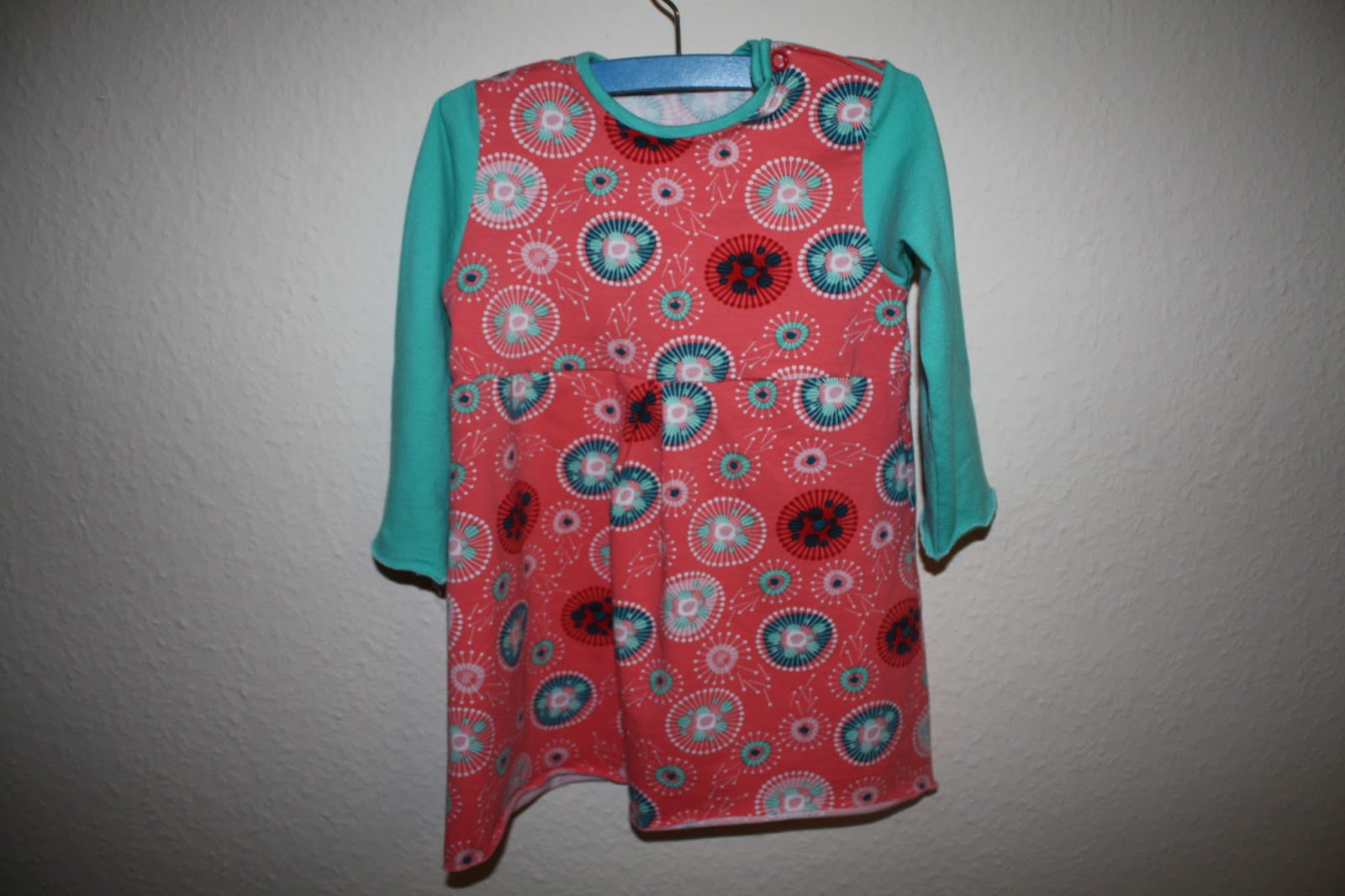 Da ich es ohne den Bodyeinsatz genäht habe, aber stattdessen ein extra Body drunter passen soll, habe ich mich für Größe 86 entschieden. Aber es fällt recht weit und lang aus, vor allem die Ärmel müssen noch mehrmals umgeschlagen werden. Aber lieber zu groß als zu klein, so kann Madita noch reinwachsen.