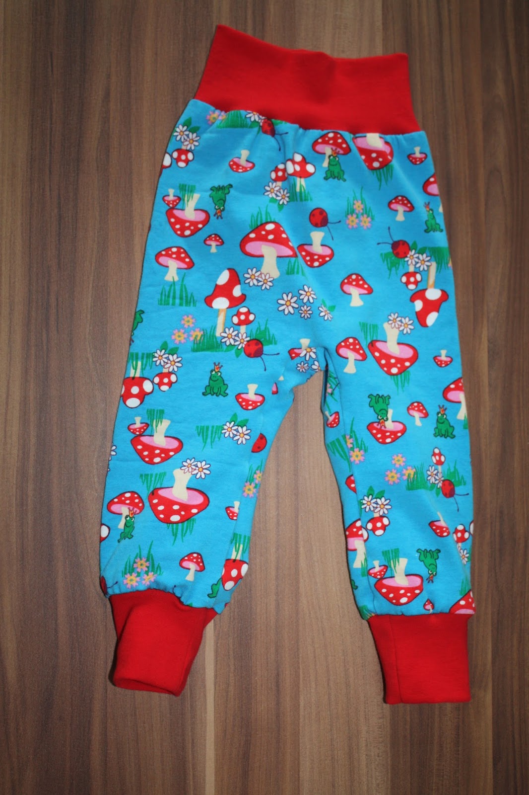 Den Pilz-Frosch-Stoff gab es zum tollem Angebotspreis beim Stoffladen hier vor Ort. Da war das passende Bündchen dazu pro Meter gerechnet mehr als doppelt so teuer :-O