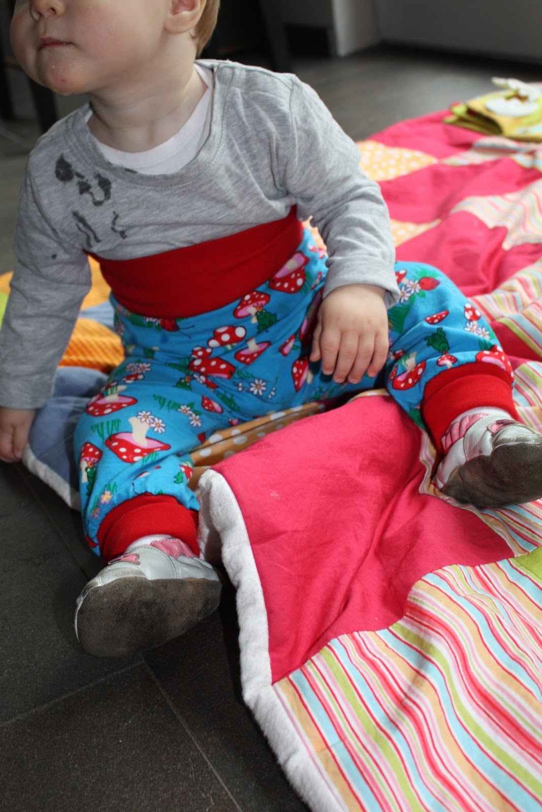 Und da mir noch mitten drin in Größe 74 stecken, denke ich, hat sich die Arbeit auch noch gelohnt. Die Pumphosen sind sogar noch so reichlich, dass sie einmal umgeschlagen werden müssen. Von daher wird Madita sie noch eine Weile tragen können, vorausgesetzt sie scheuert sie nicht auch durch 😉
