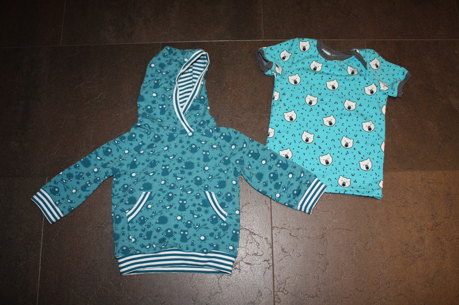Bereits im Mai waren wir zur Taufe bei der Verwandschaft in Friesland eingeladen. Die Eltern des Jungen hatten sich etwas selbst Genähtes gewünscht. Daher habe ich einen Raglan-Kapuzenpulli aus dem Buch „Nähen mit Jersey für Babys und Kids – Kinderleicht“ von Pauline Dohmen und ein schmales Shirt mit kurzen Ärmeln aus dem Buch „Nähen mit Jersey für Babys – Babyleicht“ von Pauline Dohmen genäht.
