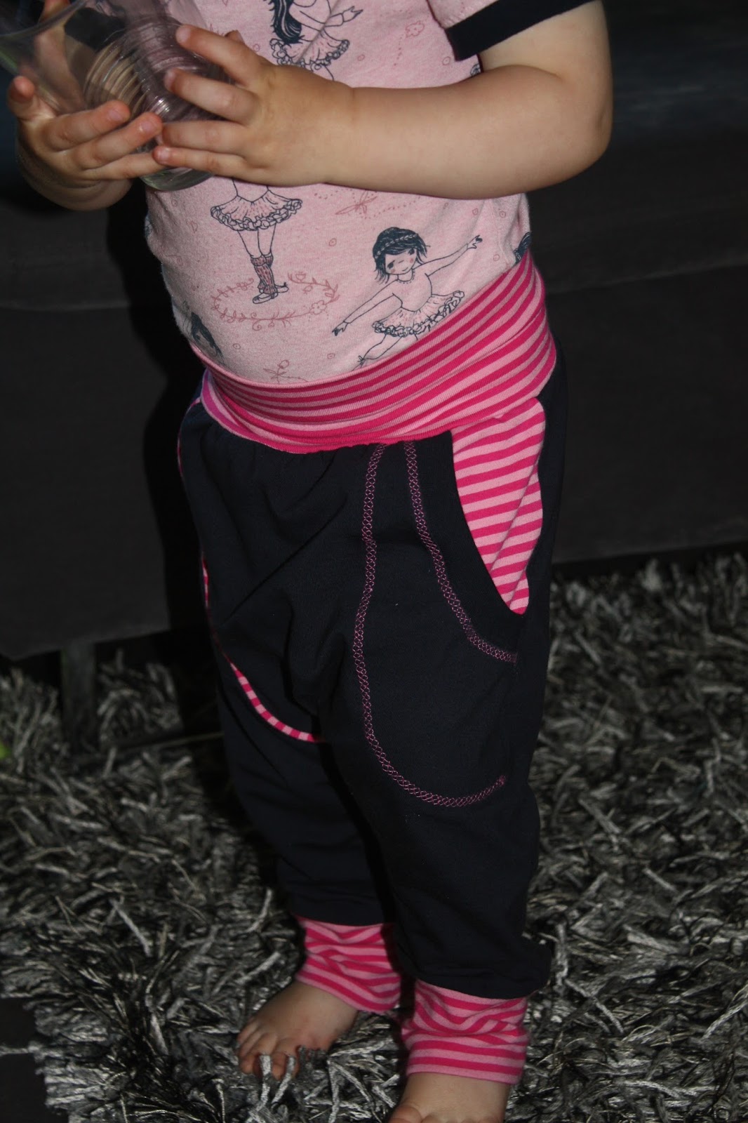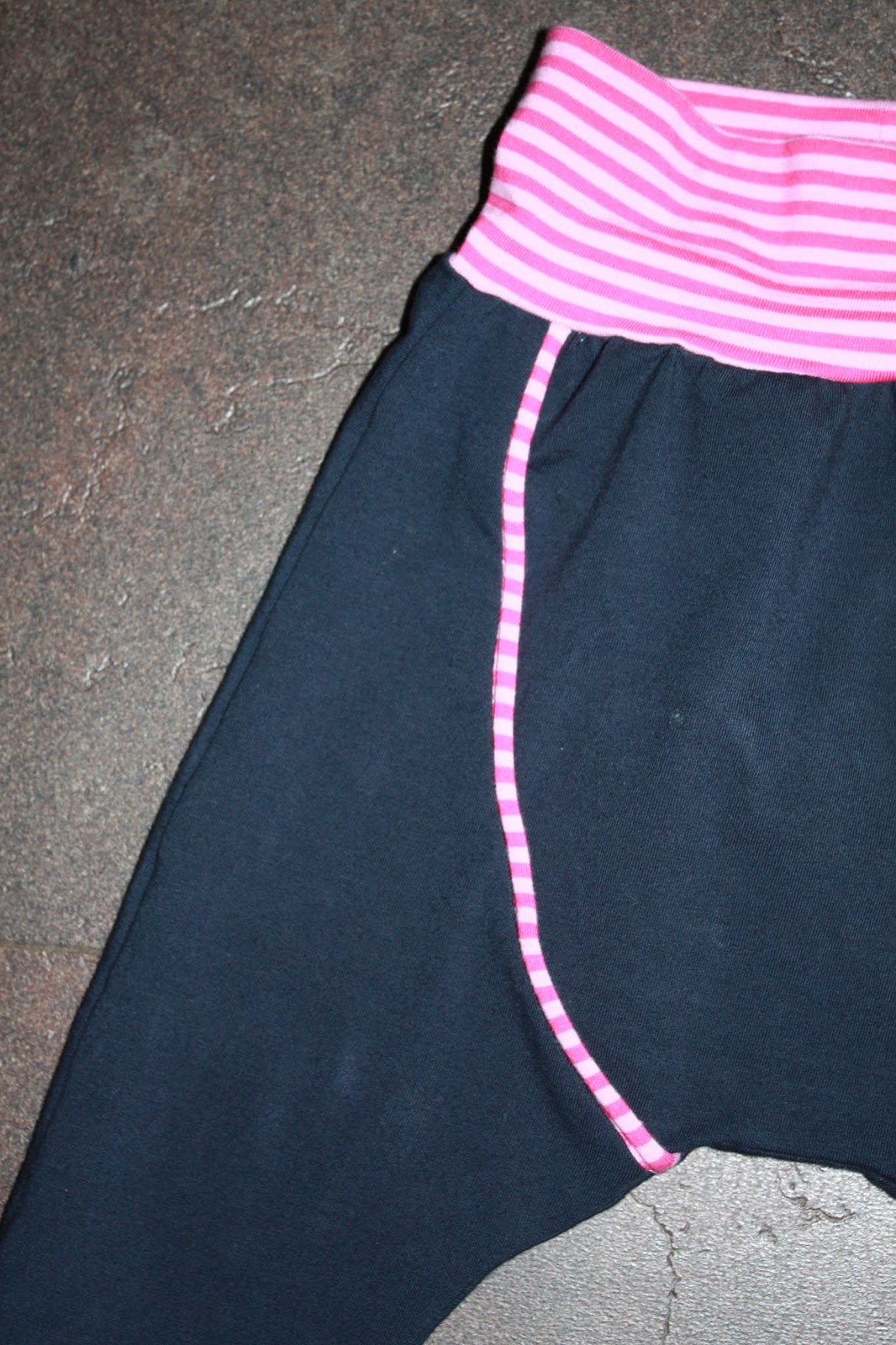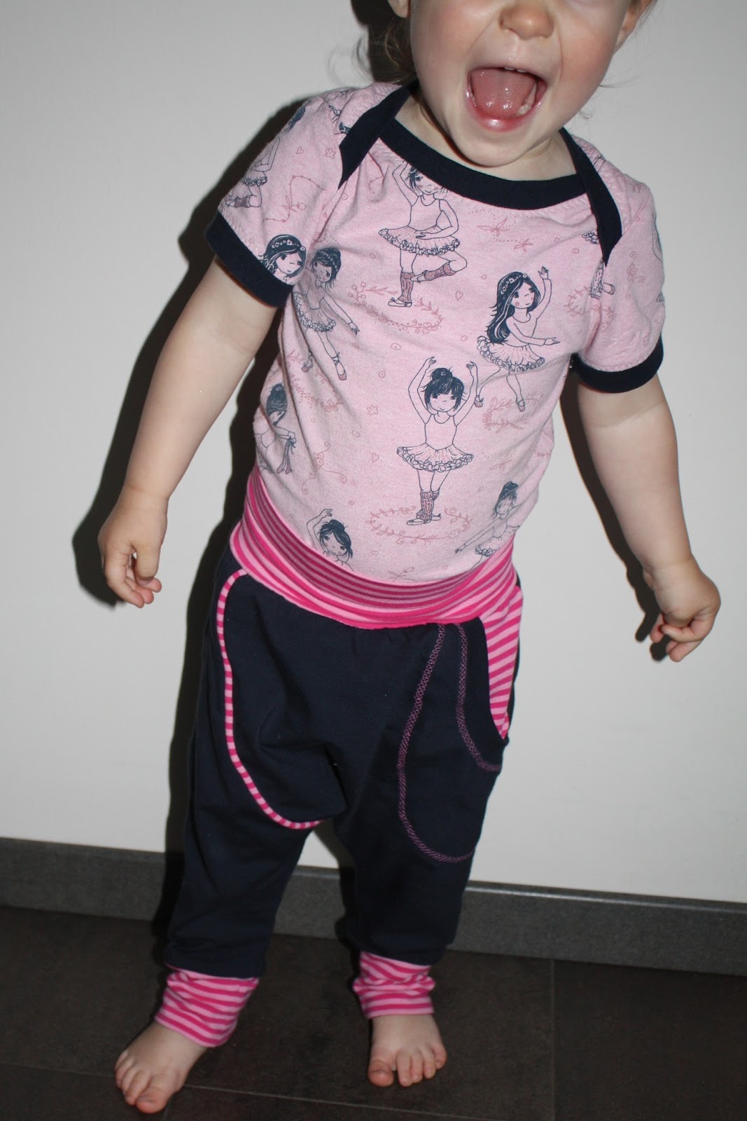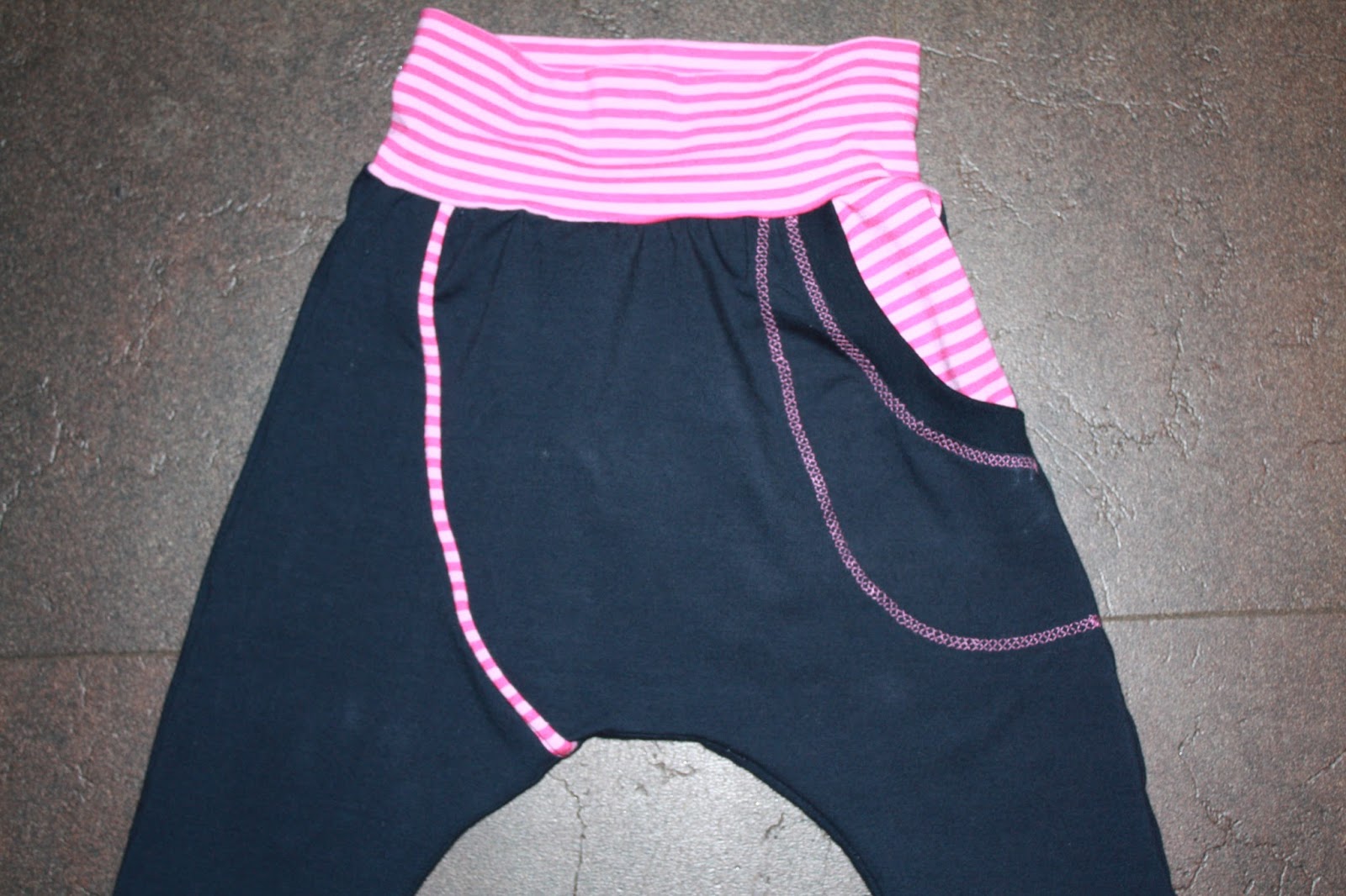 Madita hat sehr viele gemusterte Oberteile. Nun habe ich aber festgestellt, dass wir keine passenden dünnen Hosen dazu haben, wenn es für Jeans zu warm ist. Also habe ich eine Hose nach dem Schnitt Knopfknirps aus einfarbigen Jersey genäht. Damit es aber nicht zu schlicht ist, gab es Bündchen aus Streifenjersey, eine Tasche mit Ziernähten und eine Paspel dazu. Die Paspel habe ich aus einer Kordel und dem Streifenjersey selbst hergestellt.