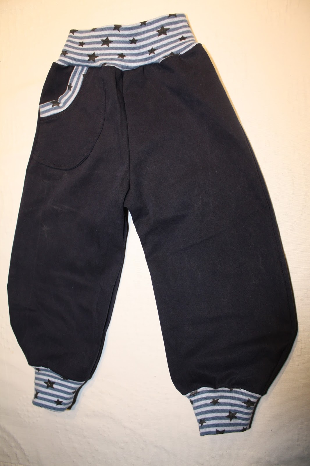 Es gab eine Pumphose „Frida“ mit einer Tasche auf der Vorderseite. Anders als in der Anleitung angegeben habe ich zum ersten Mal versucht an den den Tascheneingriff ein Bündchen zu nähen. Es steht noch leicht ab, so dass ich es nächstes Mal noch mehr dehnen muss, aber sonst gefällt mir die Bündchen-Variante gut. Der dunkelblaue Stoff war mal eine Hose der Cousine meines Mannes, das Bündchen stammt vom holländischen Stoffmarkt in Essen.