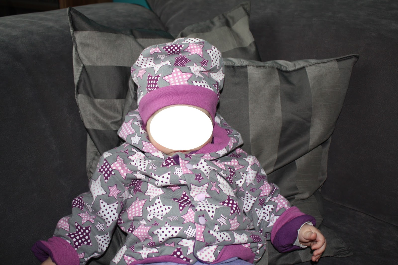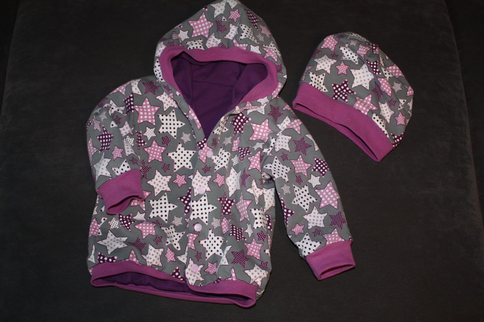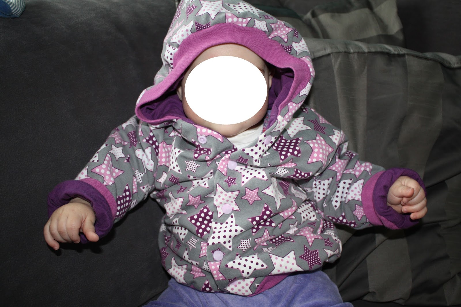 Nach der Winter-Version war jetzt eine Jacke für Frühjahr/Herbst fällig. Als Schnitt habe ich wieder den Blouson Carli von Farbenmix gewählt. Der Außenstoff ist wieder ein Sweat, diesmal die wunderbaren Tupfen-Sterne. Statt Baumwoll-Fleece gab es aber nur einen Jersey als Futter. Außerdem habe ich die Jacke eine Nummer größer in 74/80 genäht, schließlich soll sie auch noch im Herbst passen.