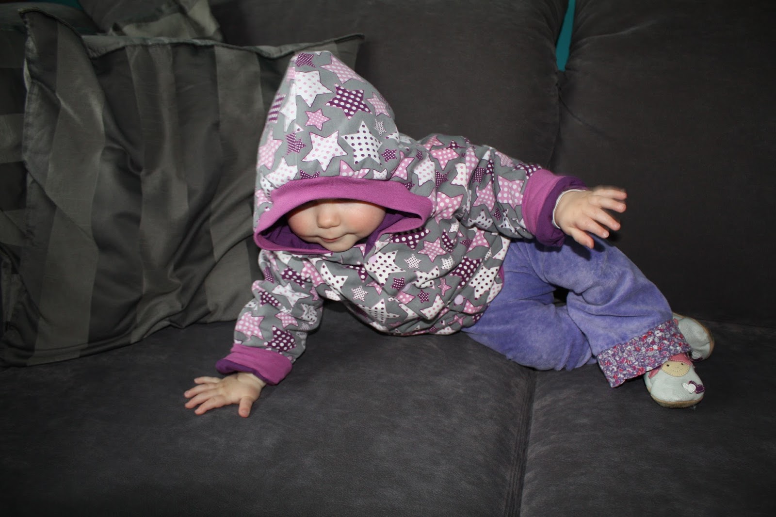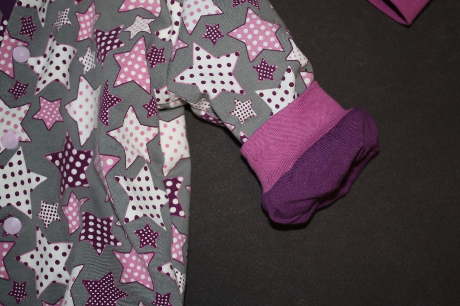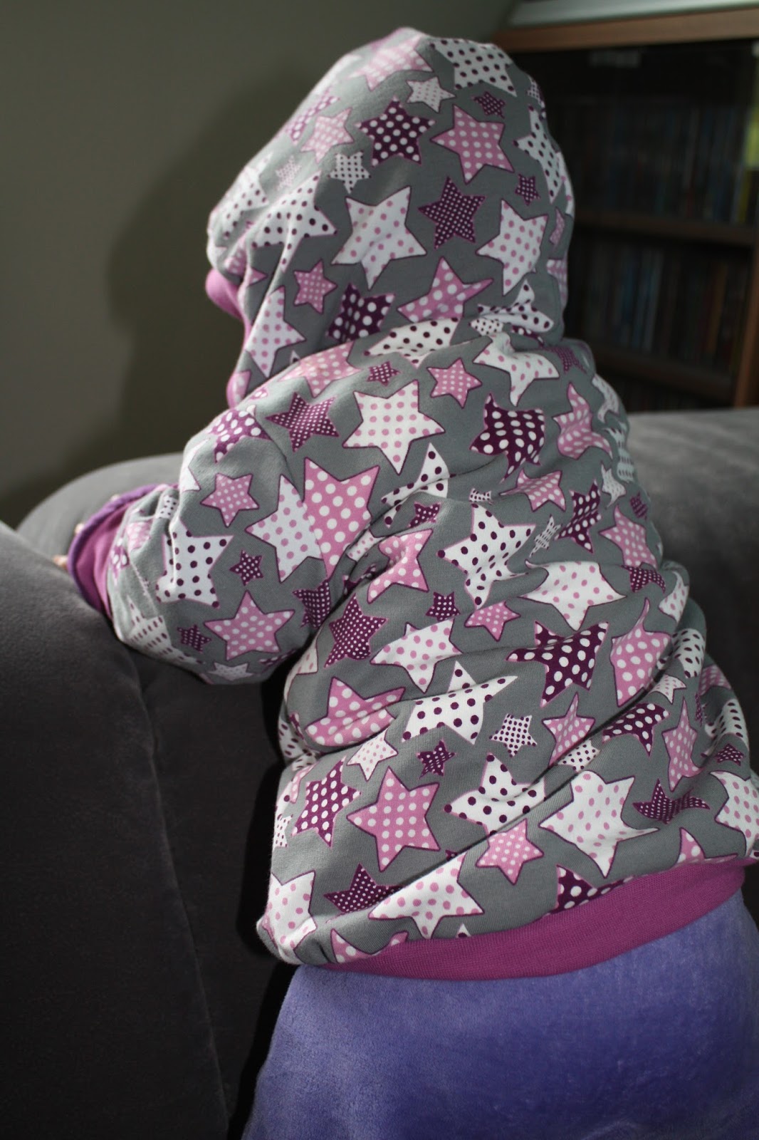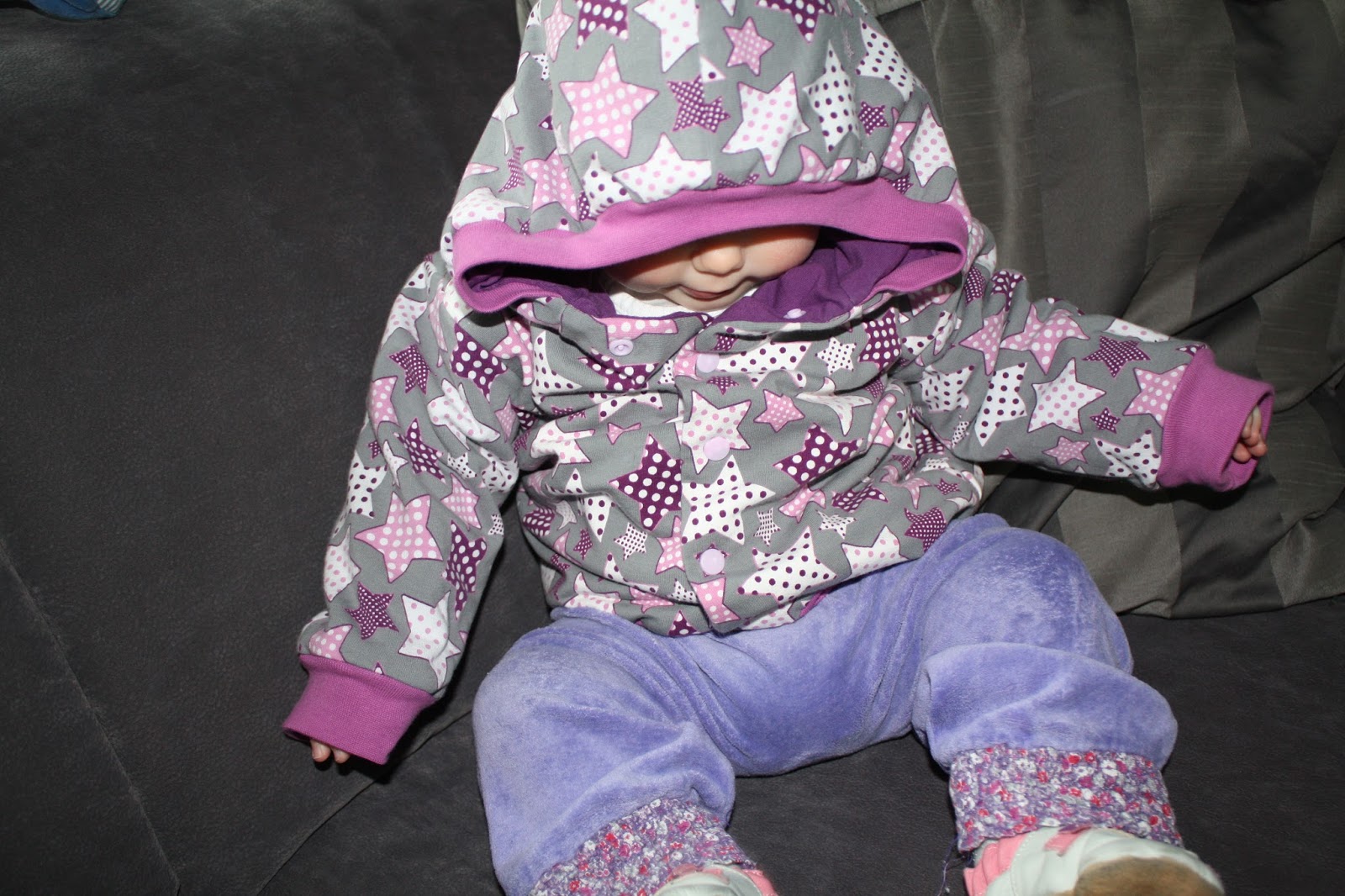Nach der Winter-Version war jetzt eine Jacke für Frühjahr/Herbst fällig. Als Schnitt habe ich wieder den Blouson Carli von Farbenmix gewählt. Der Außenstoff ist wieder ein Sweat, diesmal die wunderbaren Tupfen-Sterne. Statt Baumwoll-Fleece gab es aber nur einen Jersey als Futter. Außerdem habe ich die Jacke eine Nummer größer in 74/80 genäht, schließlich soll sie auch noch im Herbst passen.