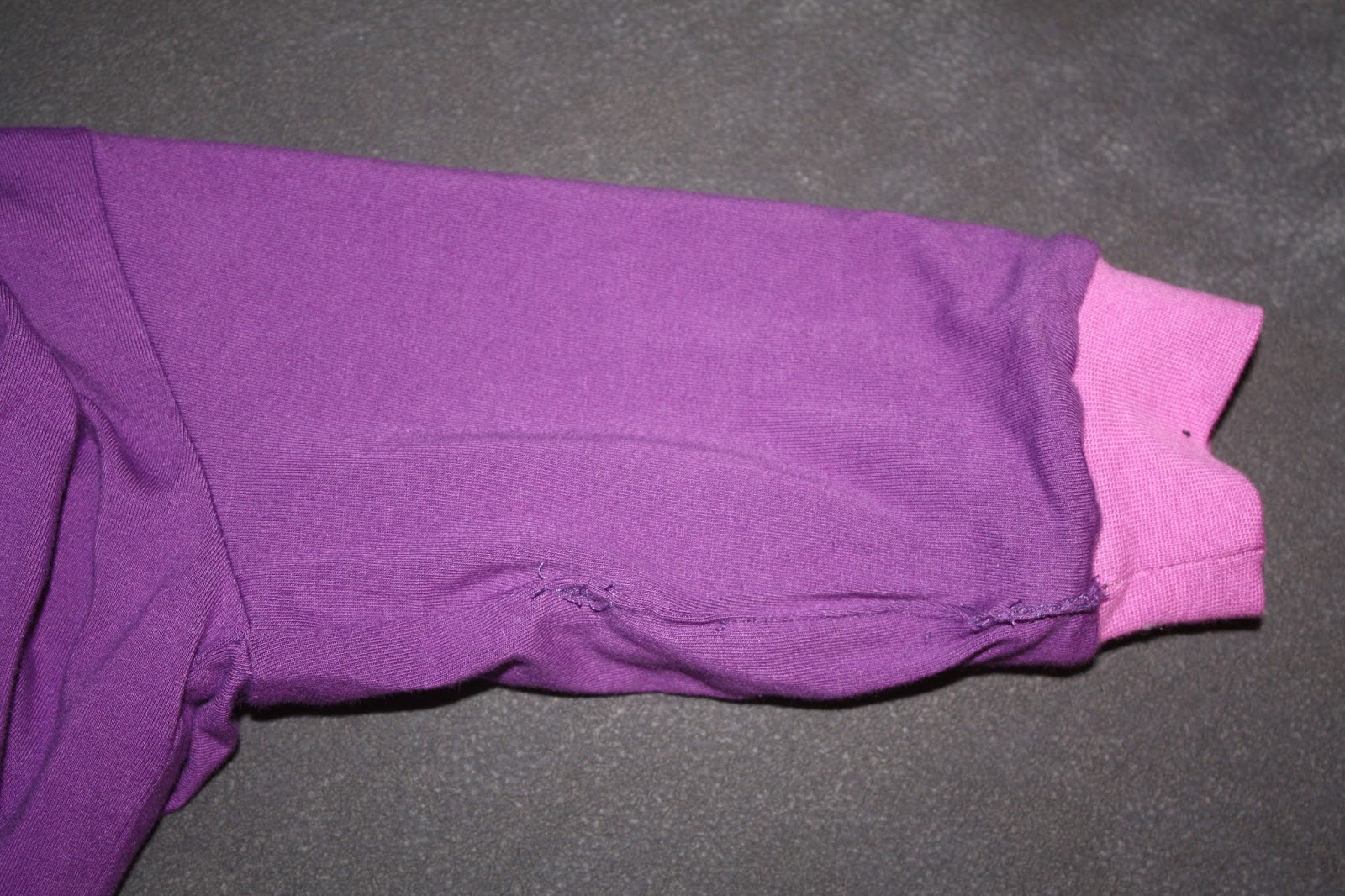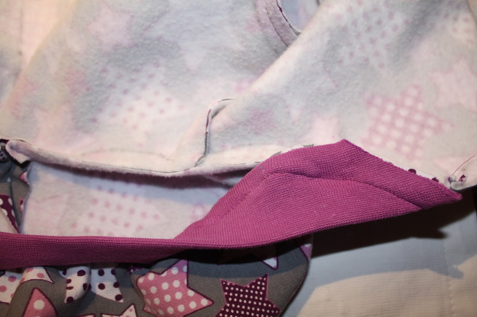 Dann habe ich weder wie in der Anleitung angegeben die Wendeöffnung vorne gemacht noch wie bei der ersten Jacke durch den Ärmel gewendet, sondern an der seitlichen Armnaht im Futter. Das hat einmal den Vorteil, dass ich die Jacke nicht noch mal zum Schluss absteppen um die Wendeöffnung zu schließen. Und zweitens kann ich das Bündchen an den Ärmeln zwischen Futter und Außenstoff fassen, so dass ich bei meinem schon oft angemerkten Ärmelumkrempeln eine schöne Variante hab. Dazu habe ich übrigens das Armbündchen zunächst ganz normal an die Außenjacke genäht und dann nach der Rüsselkussmethode von Klimperklein Futter- und Außenärmel aneinander genäht.