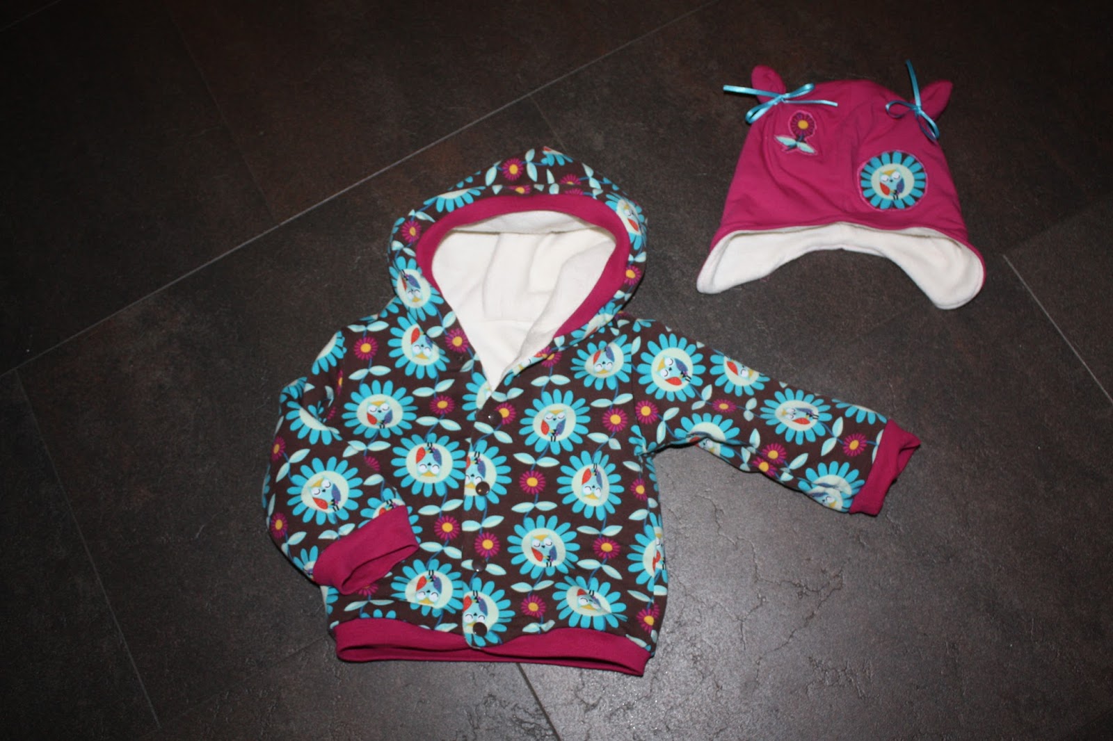 Bevor ich mich aber an meine guten Stoffe machte, nähte ich die Jacke zunächst aus zwei Jerseys Probe. Lediglich beim schrägen Auslaufenlassen des Bündchens hatte ich etwas Schwierigkeiten. Dazu fand ich dann bei Schnabelinas JaWePu eine Anleitung, wo das Bündchen nicht „schräg genäht“, sondern bereits vorher schräg am Ende abgeschnitten wurde, das klang wesentlich einfacher und so probierte es einfach bei meiner Jacke aus. Und das klappte wirklich besser und sah direkt schöner aus. Außerdem habe ich die Jacke anders als in der Anleitung angegeben durch den Ärmel gewendet, so brauchte ich keine Wendeöffnung lassen und die Jacke hinterher noch mal absteppen. Aus den tollen Stoffen ist so wirklich eine schöne warme Jacke entstanden und ich bin schon ein bisschen stolz auf meinen ersten Versuch 😉 Die Ärmel fallen sehr lang aus, aber ansonsten passt die Jacke in Größe 62/68 Madita prima. Nach dem Nähen meiner Probejacke hatte ich erst überlegt die Ärmel zu kürzen, aber grade bei kalten Temperaturen ist das eigentlich sehr praktisch, so gehen sie über die Hände und man braucht keine Handschuhe, und wenn Madita doch mal mit ihren Händen spielen möchte, werden sie einfach umgeschlagen, auch wenn das dann nicht mehr ganz so hübsch aussieht.