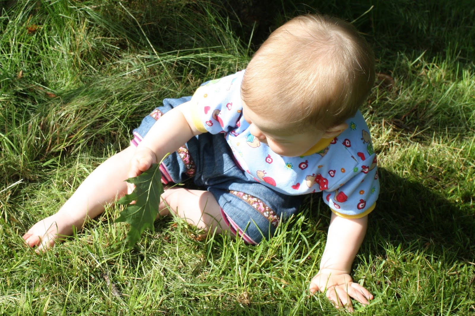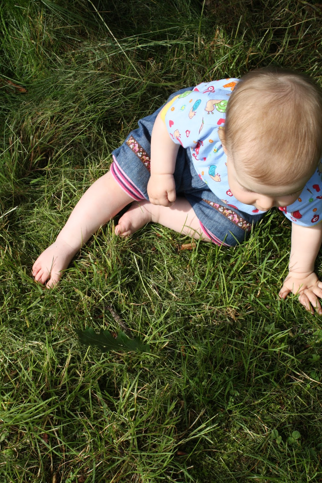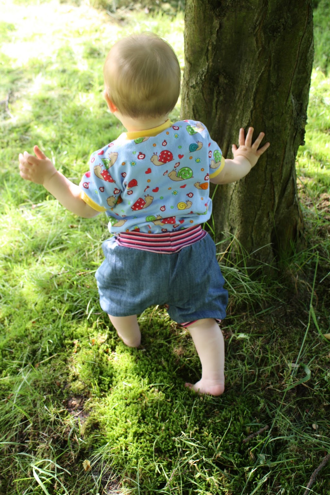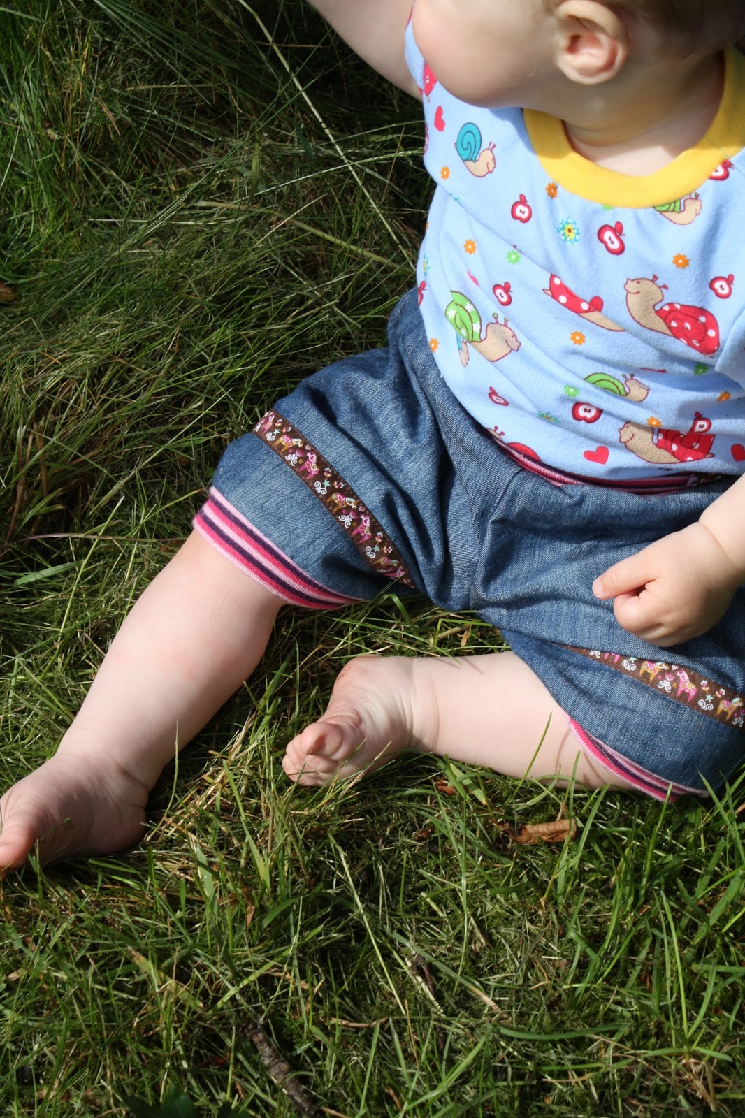 Genäht ist die kurze Hose in Größe 80, was wie das Meiste bereits anziehbar ist, aber auch noch Platz zum Wachsen lässt. Nun muss ich noch schauen, was der Praxistest zeigen wird. Die Marina Hose ist kürzer als meine bisher genähten Hosen aus dem Klimperklein-Buch. Ich könnte mir vorstellen, dass fürs Krabbeln etwas mehr Länge von Vorteil ist, damit die Knie bedeckt sind. Aber es wird auf jeden Fall trotzdem noch eine Marina-Hosen Variante mit Tasche folgen, denn spätestens wenn Madita laufen kann, zählt dieses Argument nicht mehr.