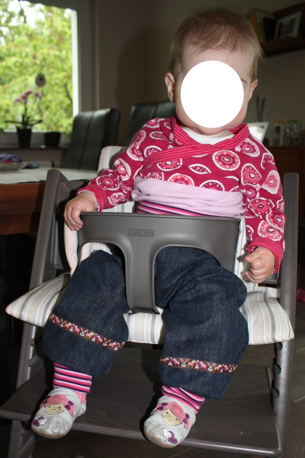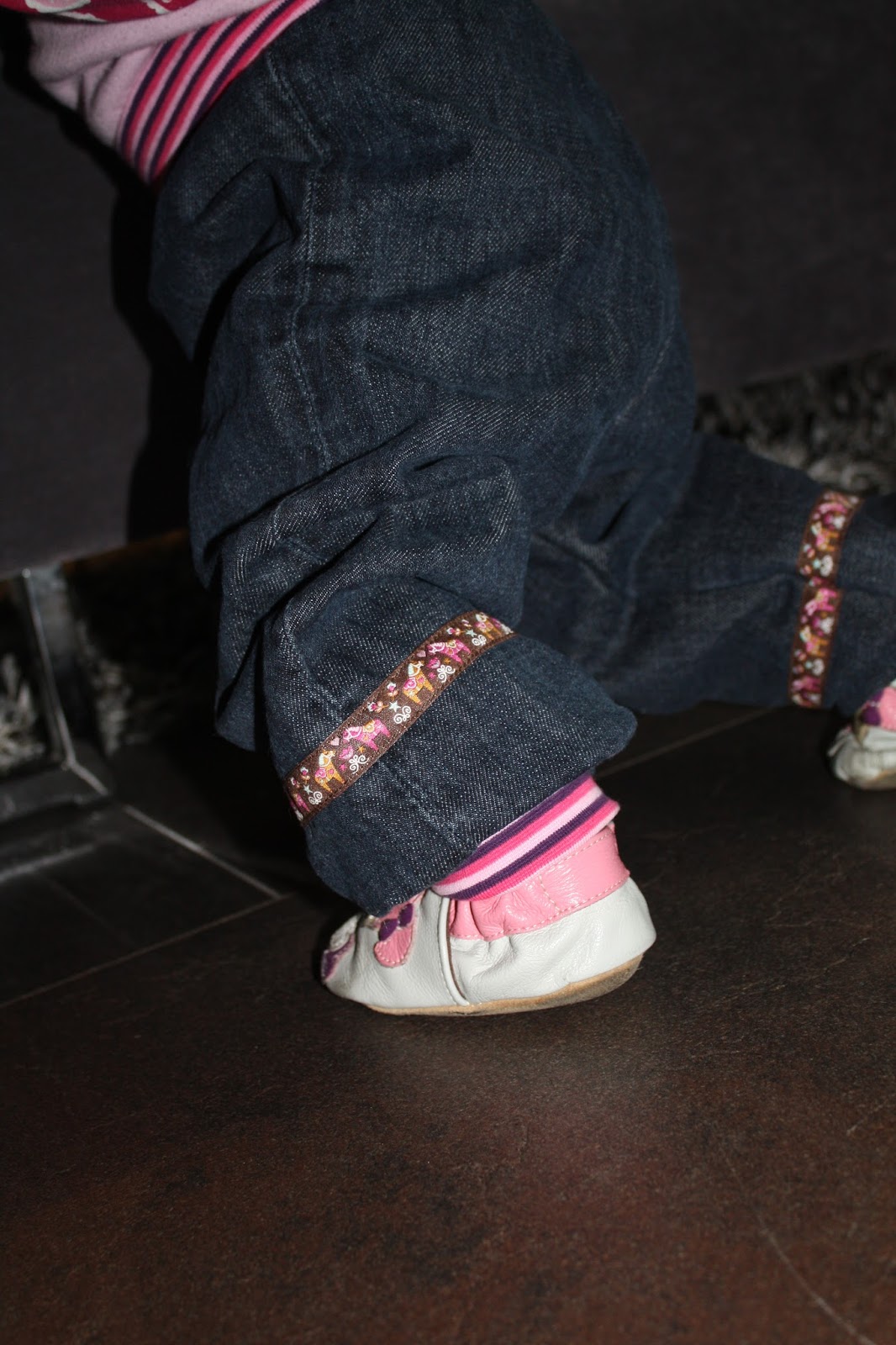 Genäht habe ich beide Hosen bereits auf Vorrat in Größe 80, was dementsprechend zur Zeit noch ziemlich weit und lang ist. So sieht man angezogen die Beinbündchen fast gar nicht. Aber trotzdem kann Madita die Hose schon tragen ohne das sie zu sehr rutscht. Das ist einfach das Geniale an den Pumphosen, die wachsen mindestens über drei Größen mit. So trägt Madita immer noch ihre Pumphosen in Größe 62 und 68, aber auch 74 passt bereits gut und sogar 80 geht schon.