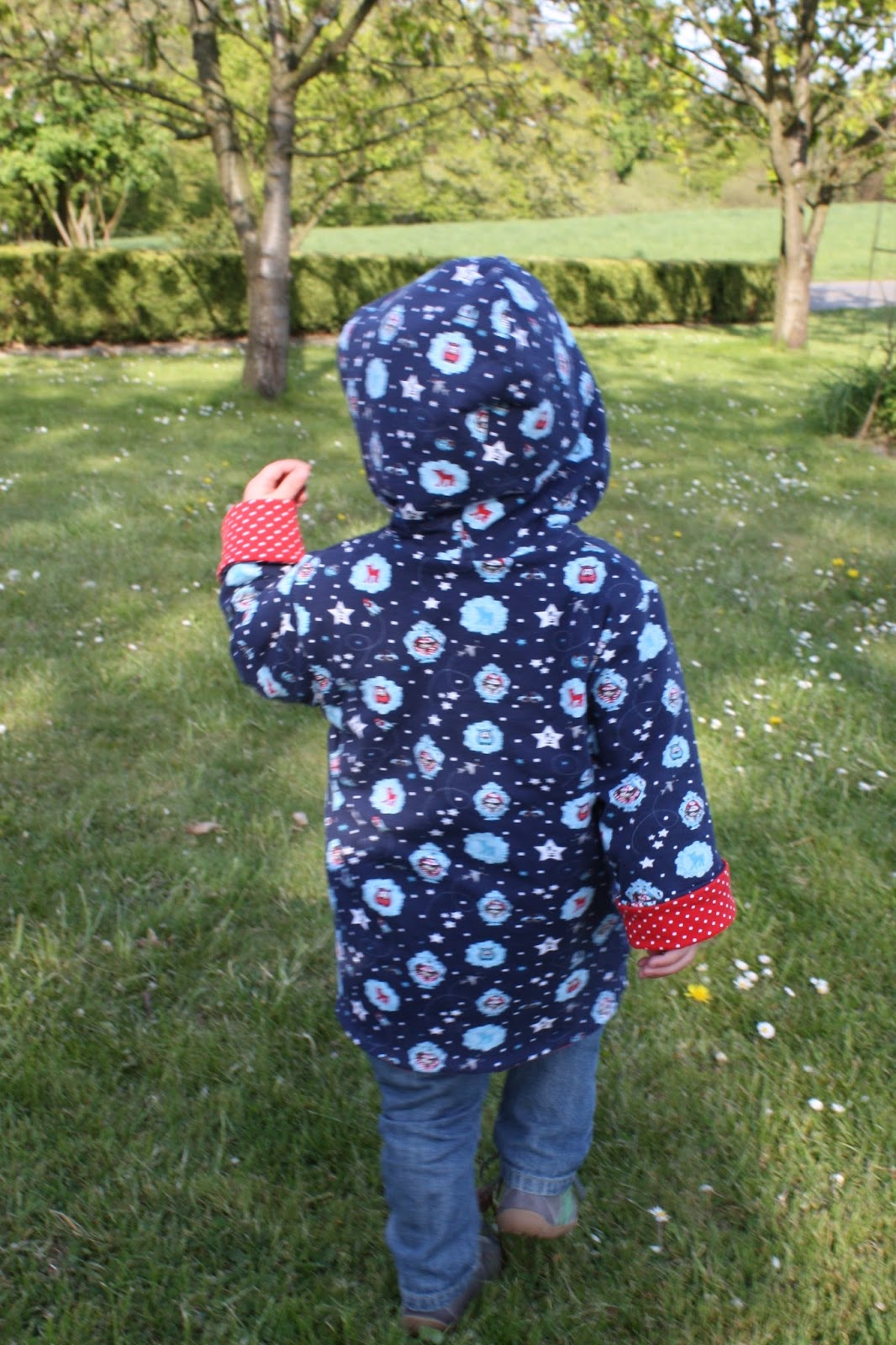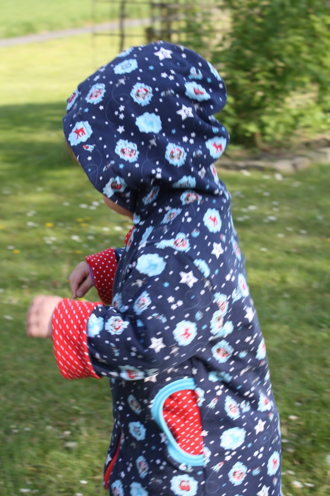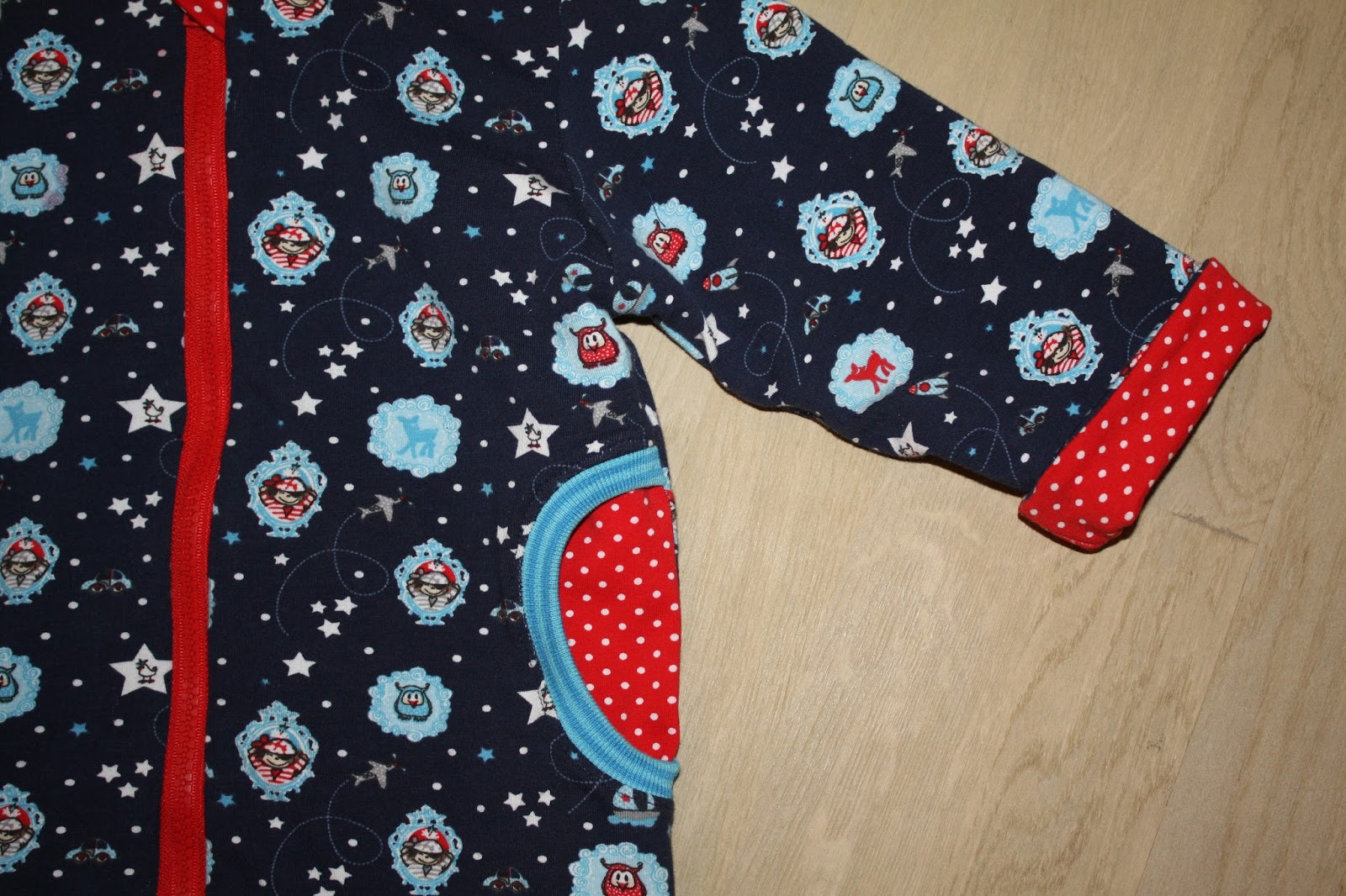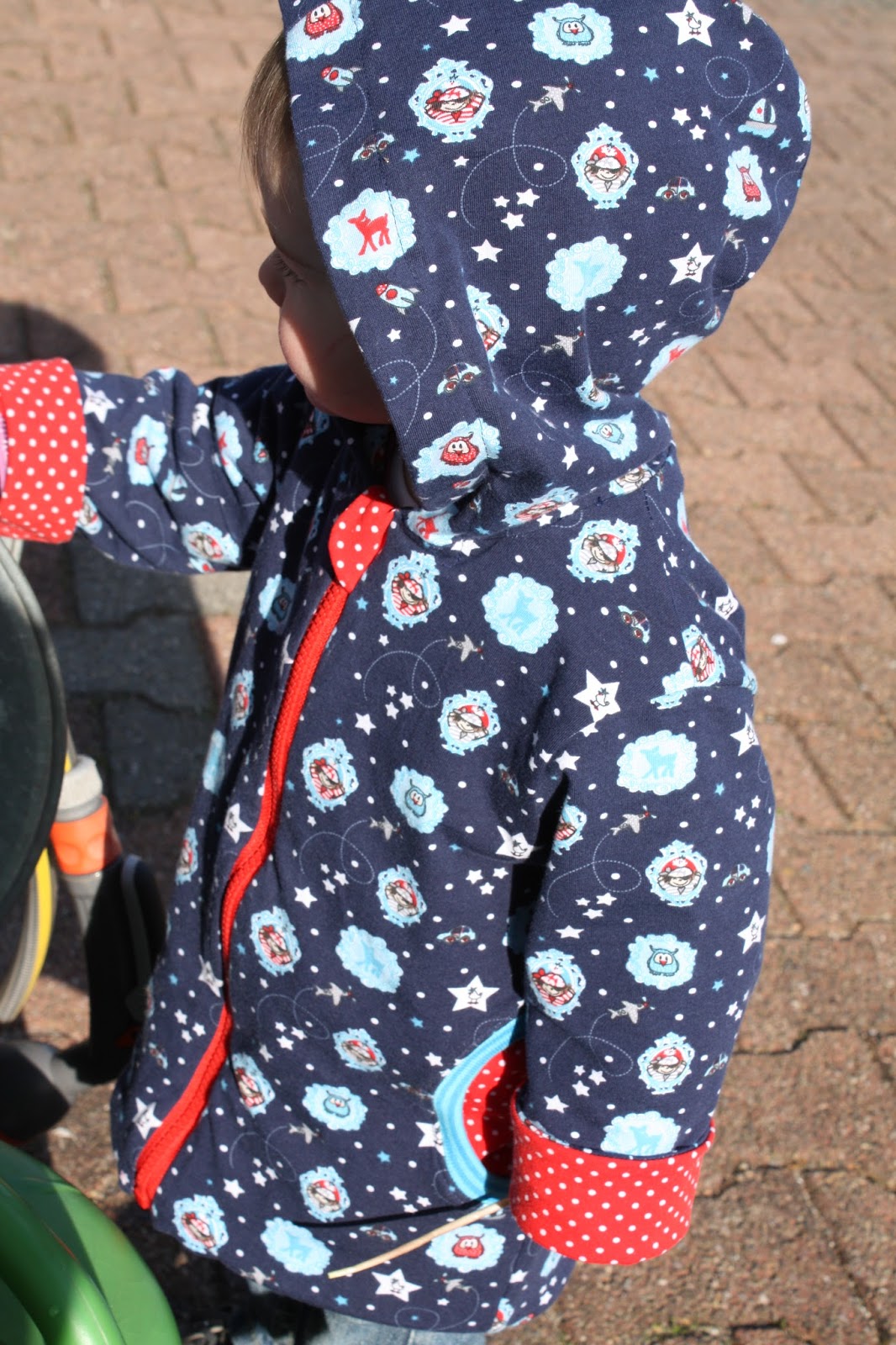 Zum ersten Mal habe ich einen Stoff, den ich bereits schon einmal vernäht habe, noch mal nachgekauft. Aus dem gemusterten dunkelblauen Jersey hatte ich schon mal eine Wendejacke genäht, allerdings habe ich mich da in der Größe vertan und sie passte nicht sehr lange. Da sie mir aber so gut gefiel und ich zufällig auf dem Stoffmarkt den gleichen Stoff nochmal entdeckte, gibt es daraus nun eine weitere Jacke. Aber ganz gleich sollte es dann doch nicht sein und so habe ich für diese den Schnitt E-Book Jacke von Klimperklein verwendet. Außerdem hat sie eine Kapuze, Taschen und statt Druckknöpfen einen Reißverschluß. Diesmal ist sie auch nicht zum Wenden, hat aber ein Futter aus rot weiß gepunteten Jersey.