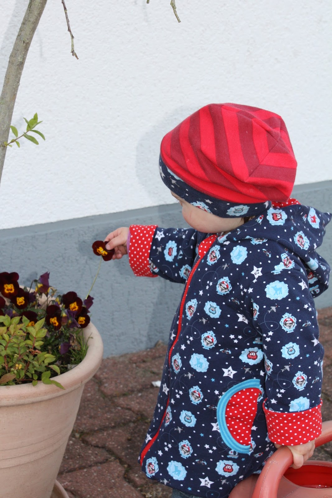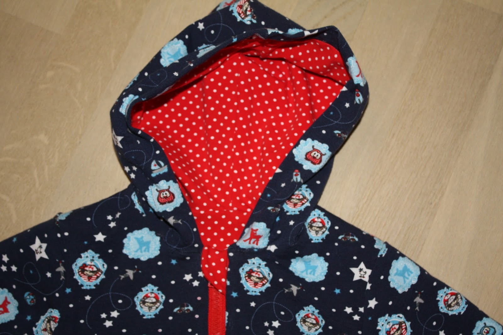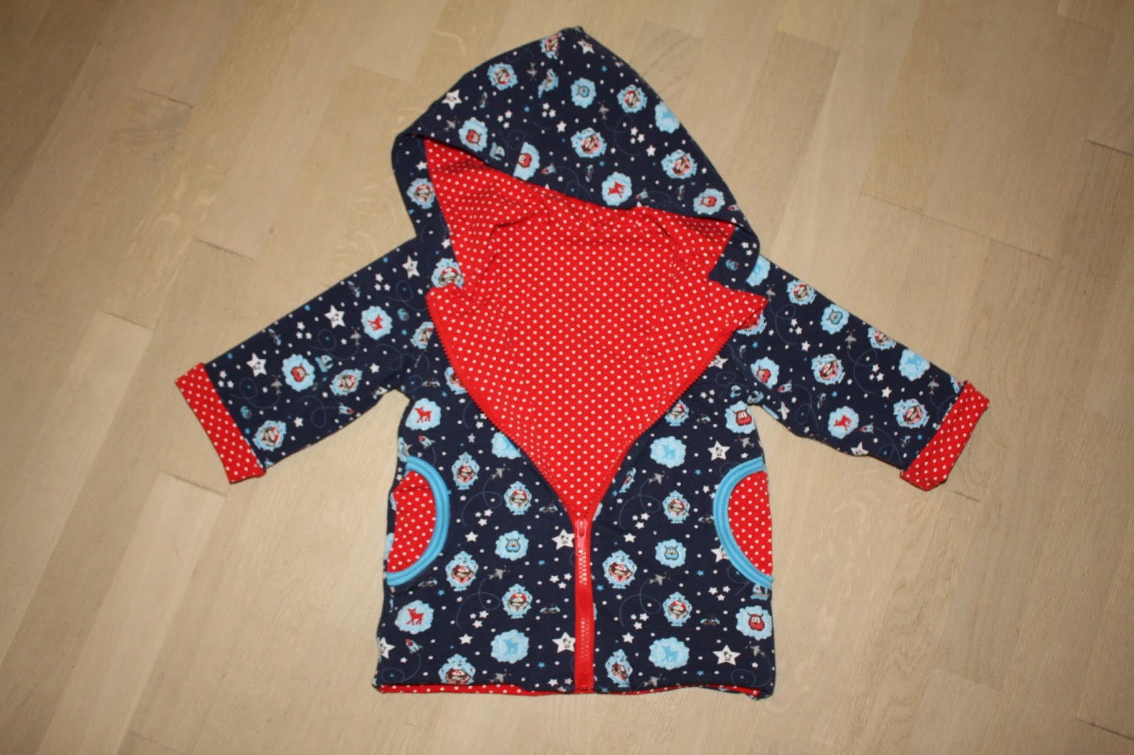 Zum ersten Mal habe ich einen Stoff, den ich bereits schon einmal vernäht habe, noch mal nachgekauft. Aus dem gemusterten dunkelblauen Jersey hatte ich schon mal eine Wendejacke genäht, allerdings habe ich mich da in der Größe vertan und sie passte nicht sehr lange. Da sie mir aber so gut gefiel und ich zufällig auf dem Stoffmarkt den gleichen Stoff nochmal entdeckte, gibt es daraus nun eine weitere Jacke. Aber ganz gleich sollte es dann doch nicht sein und so habe ich für diese den Schnitt E-Book Jacke von Klimperklein verwendet. Außerdem hat sie eine Kapuze, Taschen und statt Druckknöpfen einen Reißverschluß. Diesmal ist sie auch nicht zum Wenden, hat aber ein Futter aus rot weiß gepunteten Jersey.