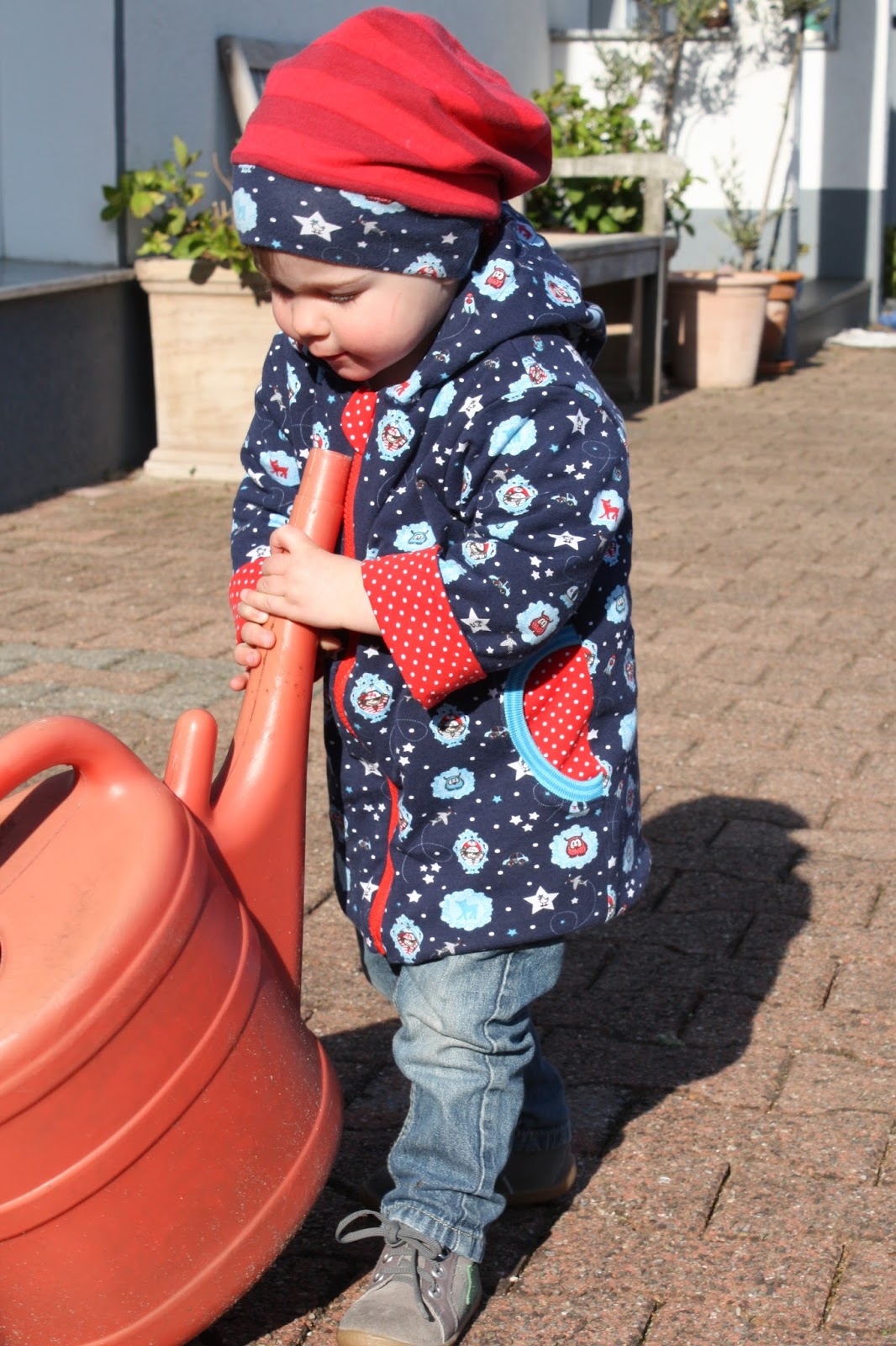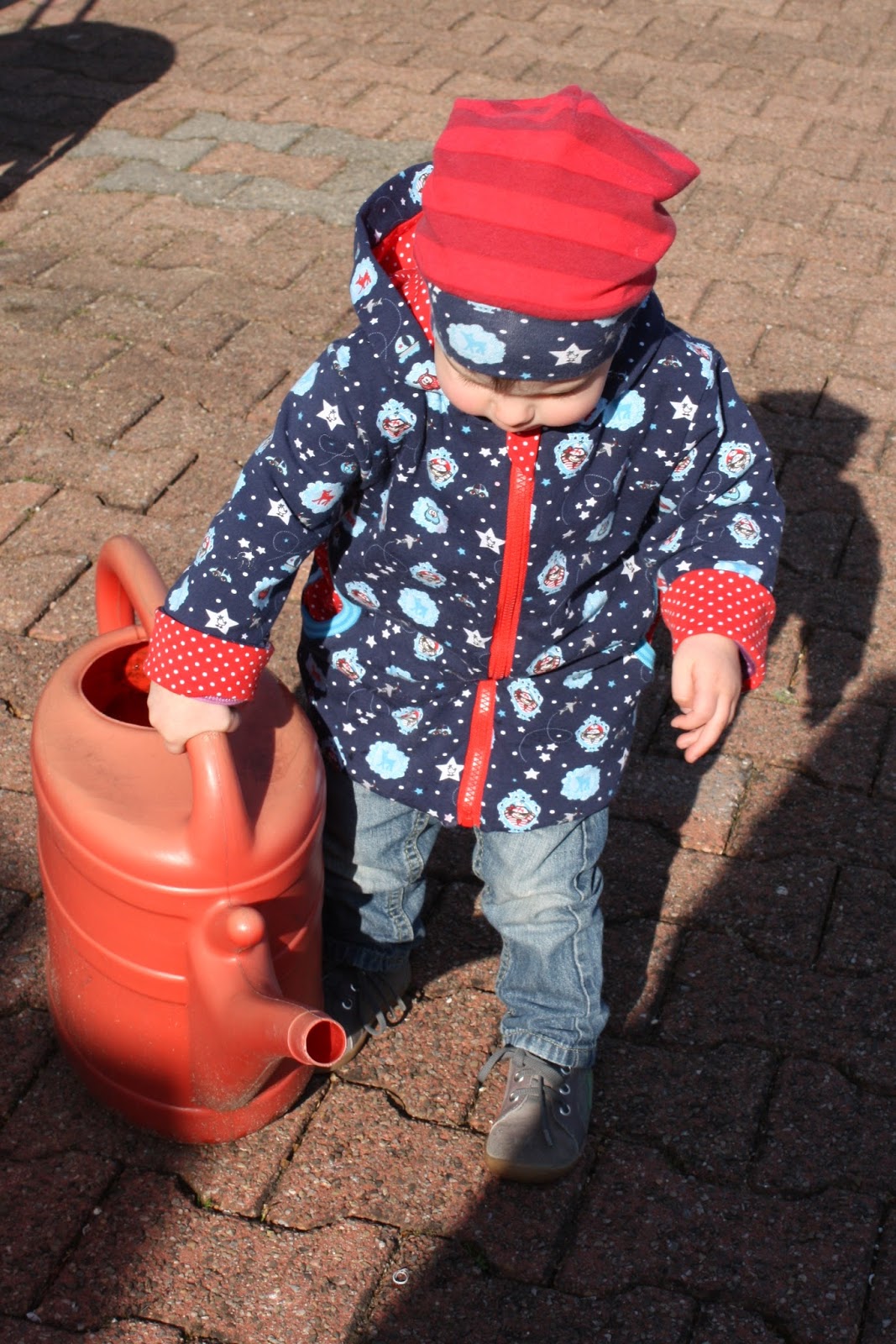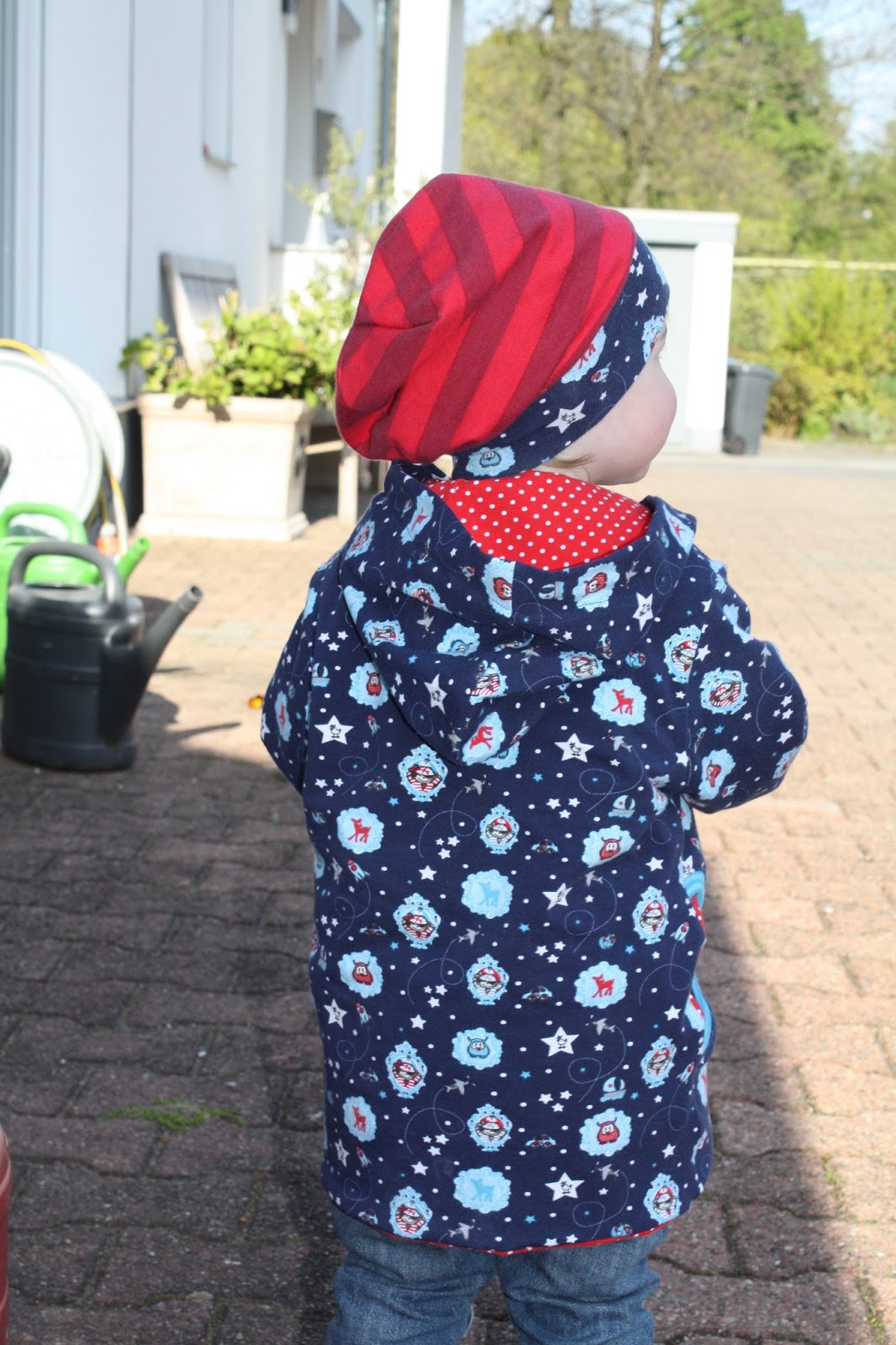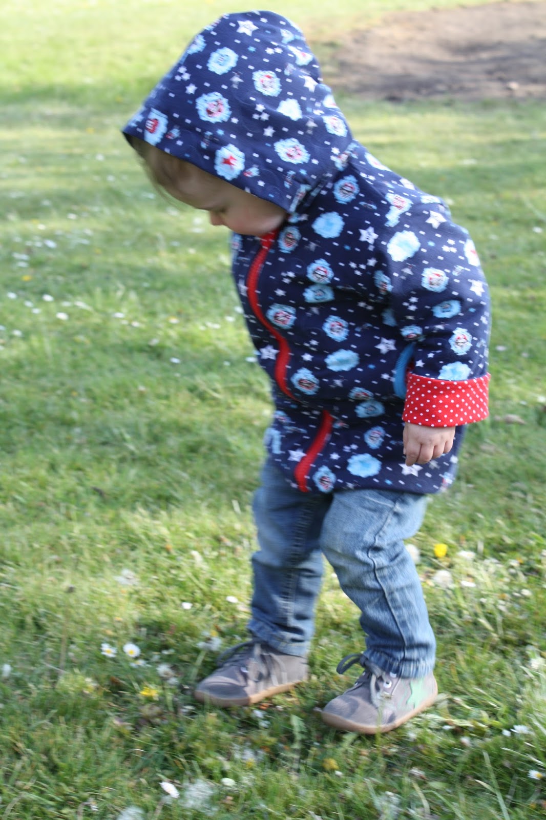 Zum ersten Mal habe ich einen Stoff, den ich bereits schon einmal vernäht habe, noch mal nachgekauft. Aus dem gemusterten dunkelblauen Jersey hatte ich schon mal eine Wendejacke genäht, allerdings habe ich mich da in der Größe vertan und sie passte nicht sehr lange. Da sie mir aber so gut gefiel und ich zufällig auf dem Stoffmarkt den gleichen Stoff nochmal entdeckte, gibt es daraus nun eine weitere Jacke. Aber ganz gleich sollte es dann doch nicht sein und so habe ich für diese den Schnitt E-Book Jacke von Klimperklein verwendet. Außerdem hat sie eine Kapuze, Taschen und statt Druckknöpfen einen Reißverschluß. Diesmal ist sie auch nicht zum Wenden, hat aber ein Futter aus rot weiß gepunteten Jersey.