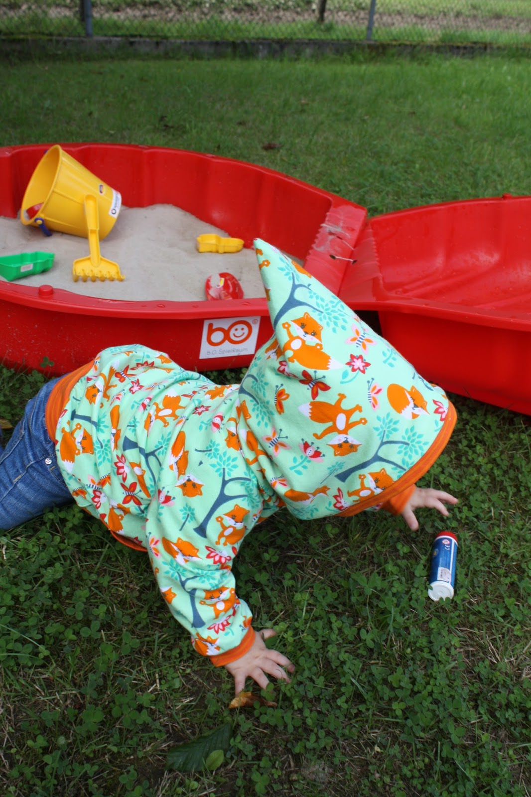 Mit umgeschlagenen Ärmeln ist der Pulli in Größe 86 bereits tragbar, aber schon noch sehr weit. Er wandert nun auch erst einmal schweren Herzens in die Vorratskiste.