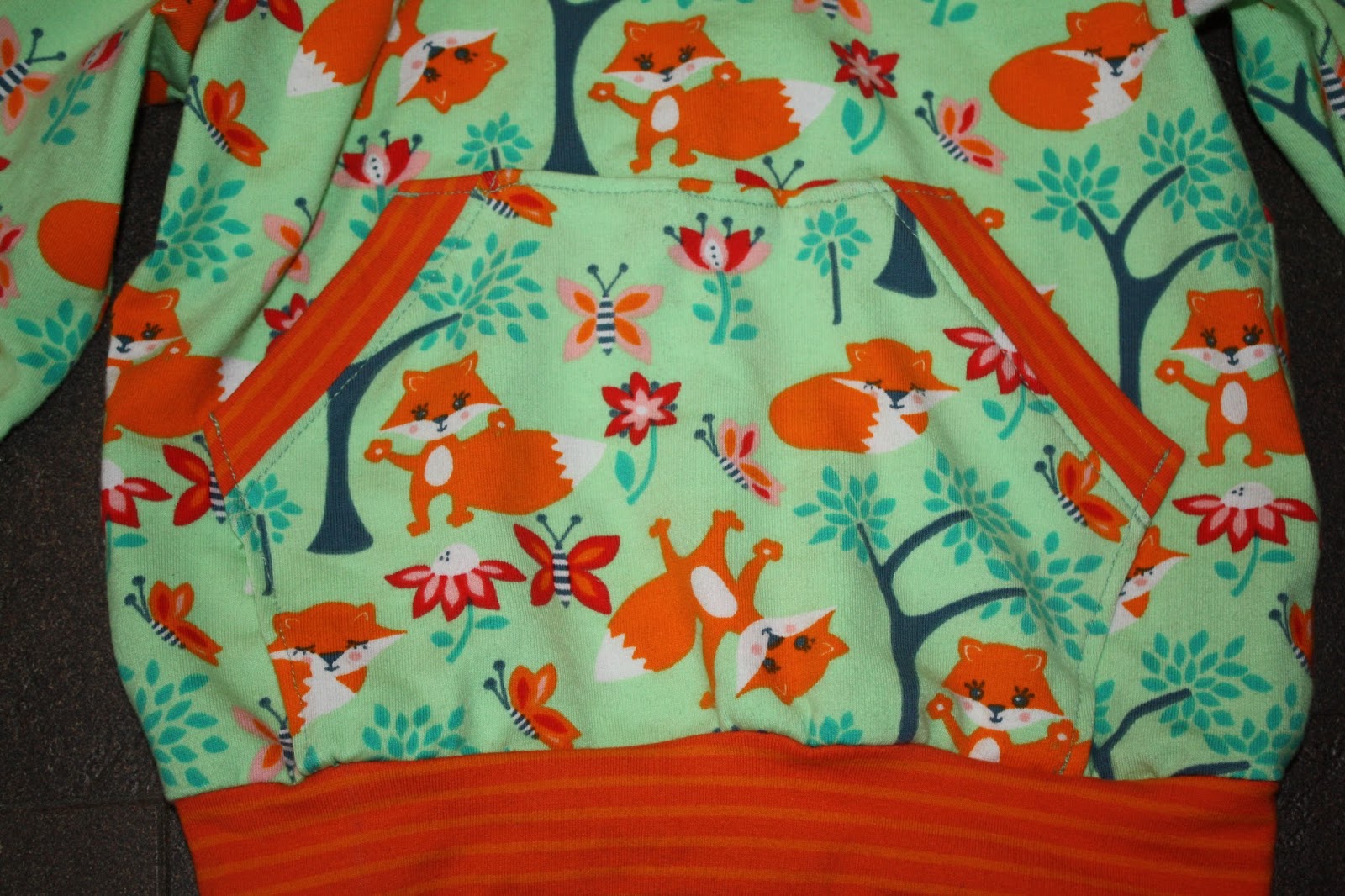 Nach den vielen Geschenken stehen zwar noch weitere auf der to-do-Liste, aber nun war erst mal wieder etwas für Madita dran. Beim letzten Night-Shopping in der Fachkultur habe ich den „Waldtanz“ von Lillestoff im Angebot ergattert und daraus ist ein Kapuzenpulli entstanden. Als Futter für die Kapuze und als Bündchen habe ich einen orange gestreiften Jersey verwendet. Der Schnitt stammt aus dem Buch „Nähen mit Jersey für Babys und Kids- Kinderleicht“ von Pauline Dohmen.