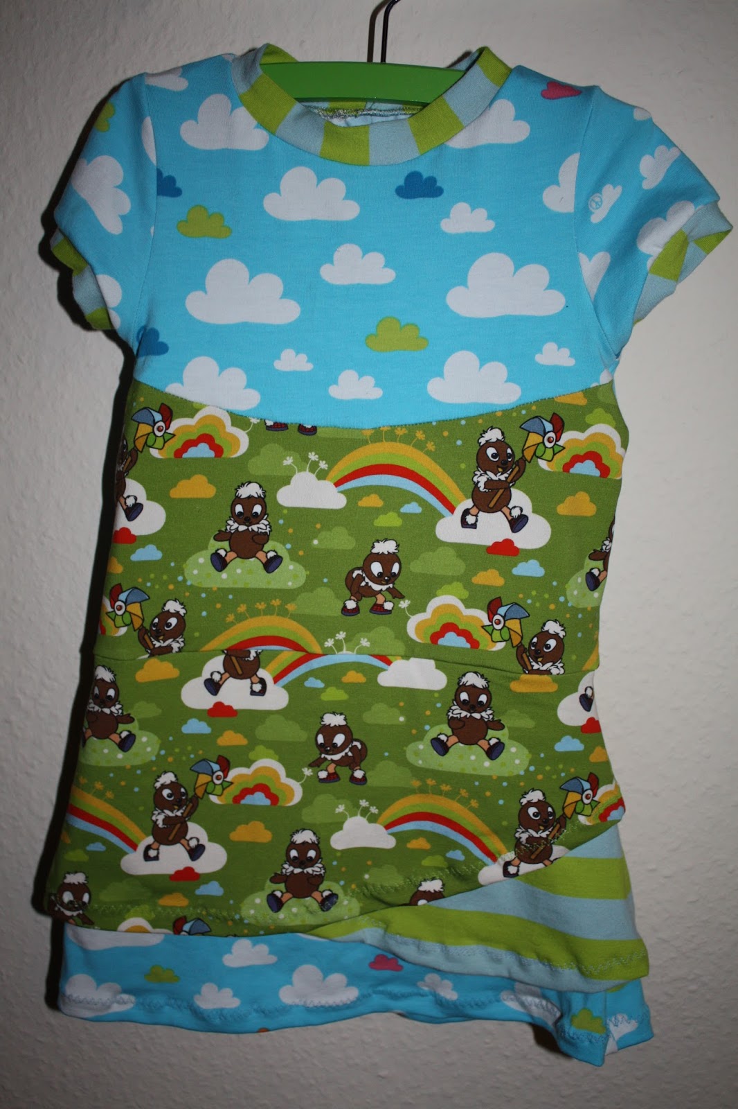 Die Eigenproduktion Pittiplatsch von Stoff und Liebe habe ich mit dem Wolkenjersey Luckysky und breiten grün-blauen Streifen kombiniert.