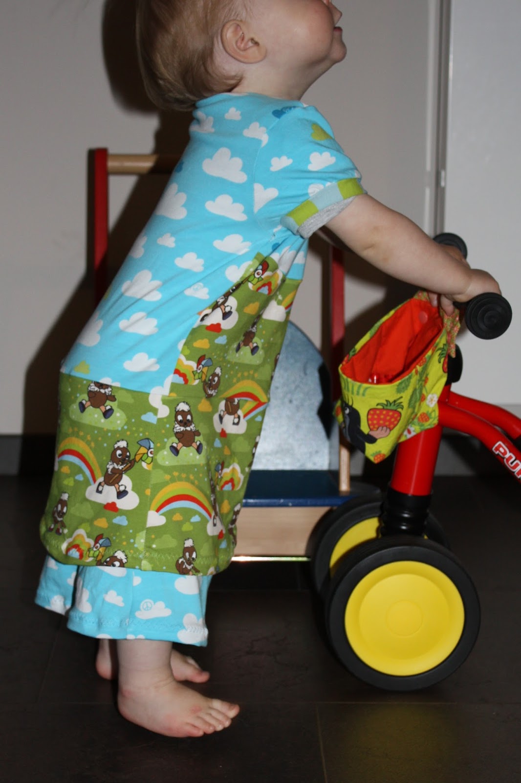 Das erste Carlienchen in Gr. 80/86 kam mir ja im Vergleich zu anderen Sachen in gleicher größer etwas eng vor. Daher habe diesmal schon Größe 92/98 genäht, das ist aber viiiiel zu lang. Wobei die Ärmel auch in der Nummer größer etwas kurz sind, so dass man wieder den Body sieht. Und diesmal habe ich alles genau nach Anleitung gemacht.