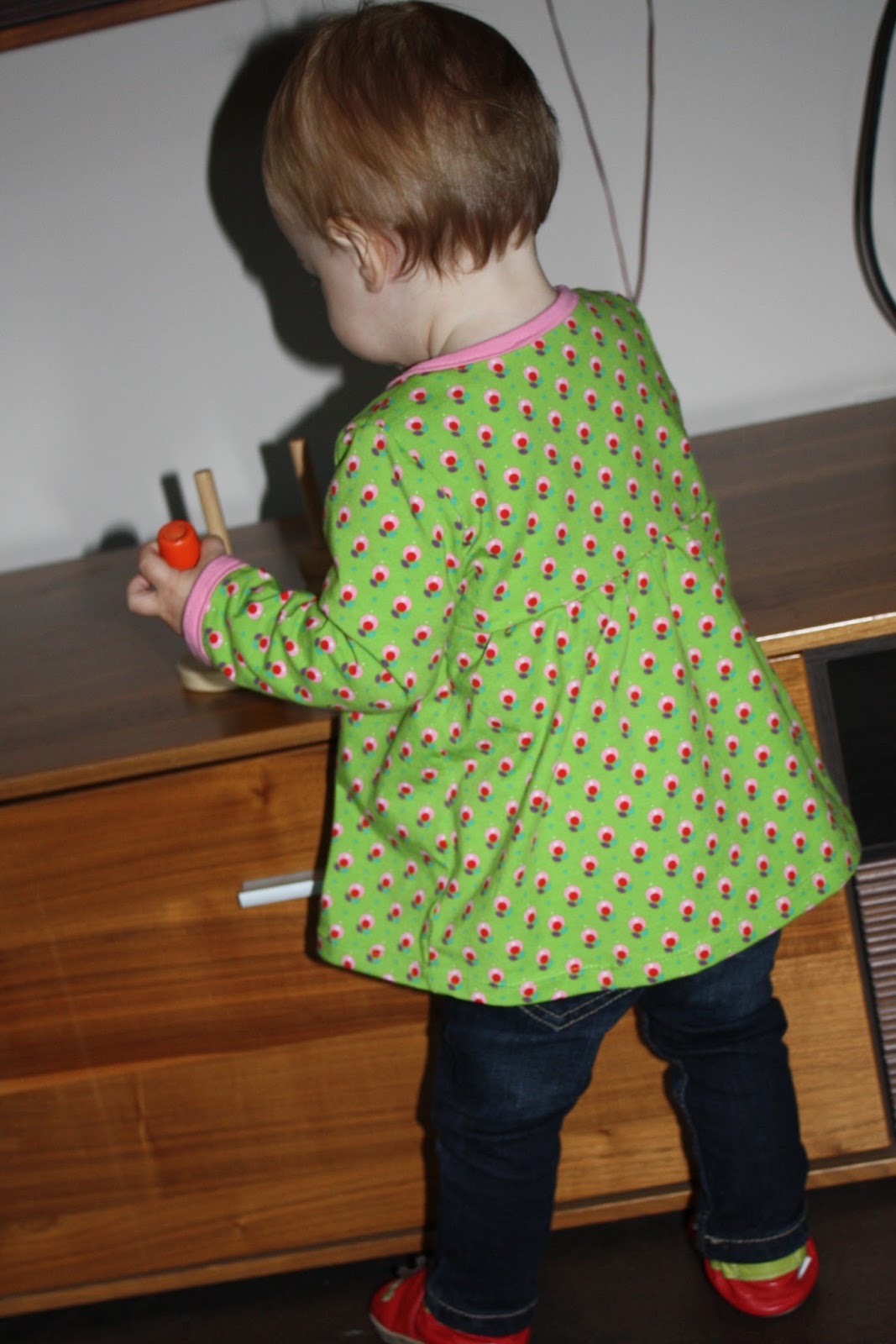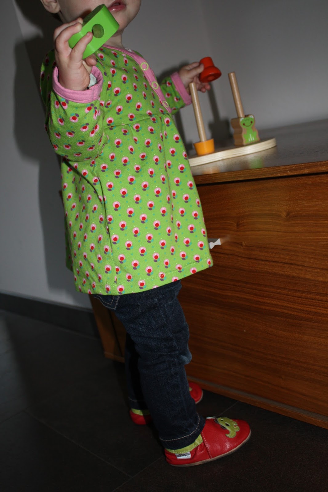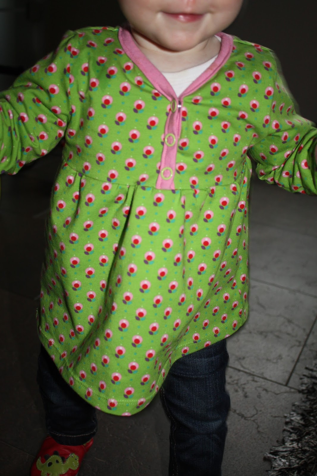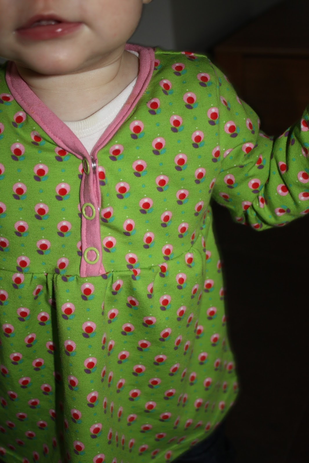 Die Ärmel hatte ich beim Zuschnitt direkt ein klein wenig gekürzt, was gut war, denn so passt es so gerade eben ohne umschlagen. Am Hals könnte die Tunika noch etwas enger sitzen, ansonsten ist Größe 80 perfekt. Vielleicht kann ich die Position der Knöpfe beim nächsten Mal etwas anpassen, damit sie am Hals enger sitzt.