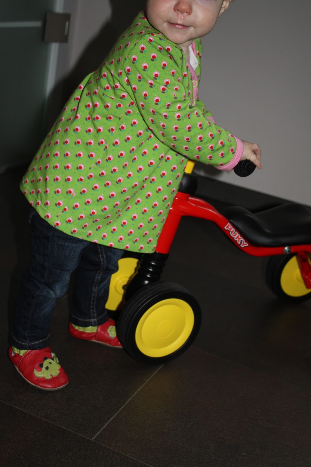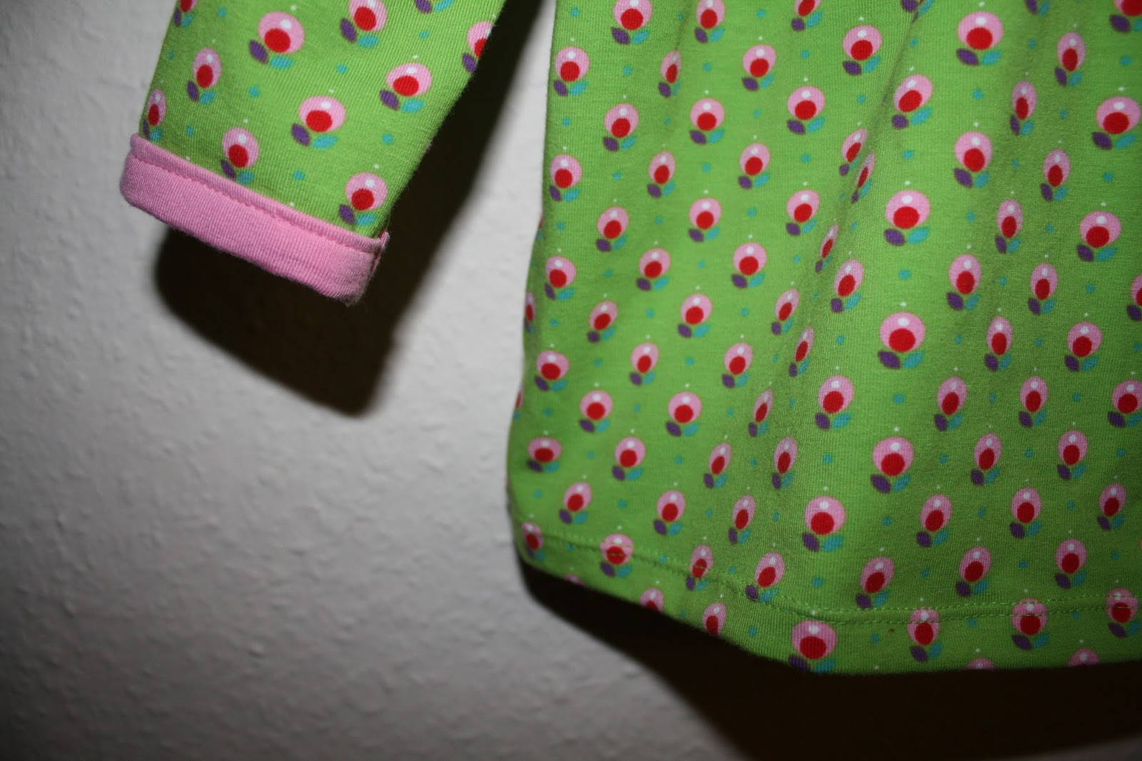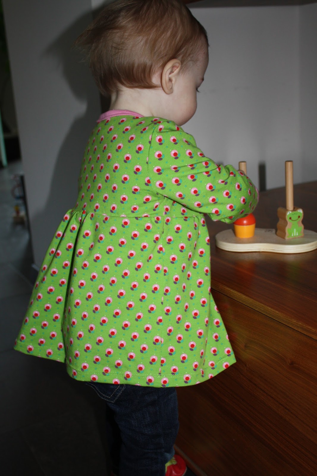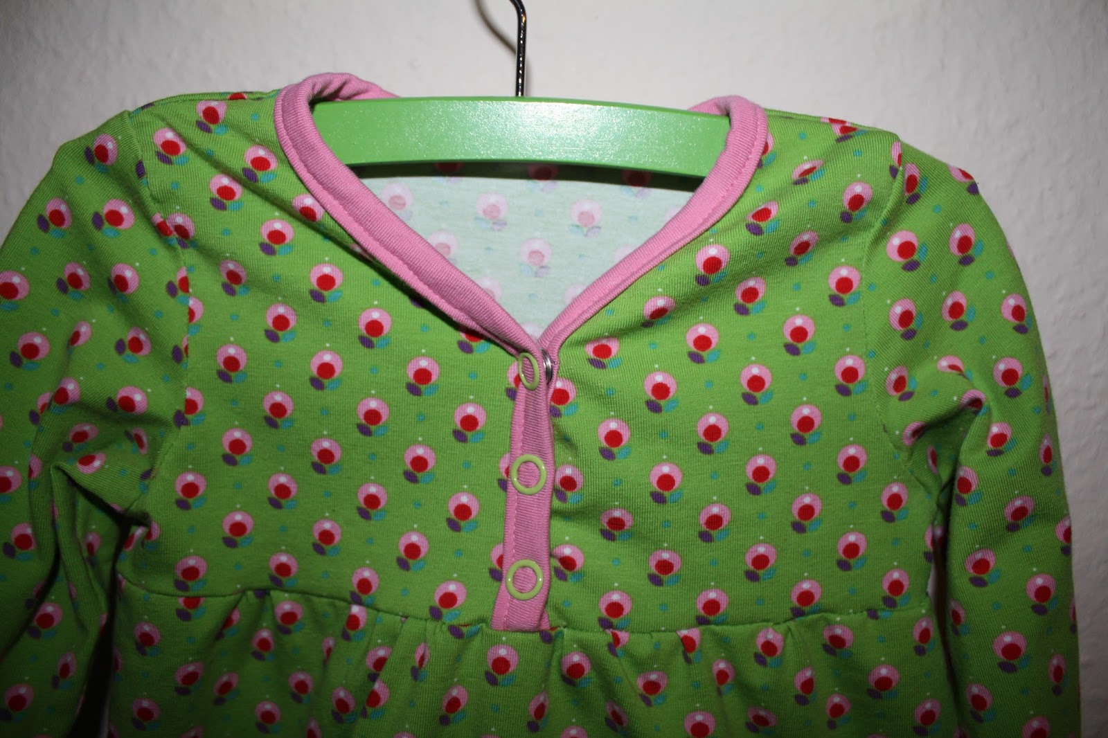 Die Ärmel hatte ich beim Zuschnitt direkt ein klein wenig gekürzt, was gut war, denn so passt es so gerade eben ohne umschlagen. Am Hals könnte die Tunika noch etwas enger sitzen, ansonsten ist Größe 80 perfekt. Vielleicht kann ich die Position der Knöpfe beim nächsten Mal etwas anpassen, damit sie am Hals enger sitzt.