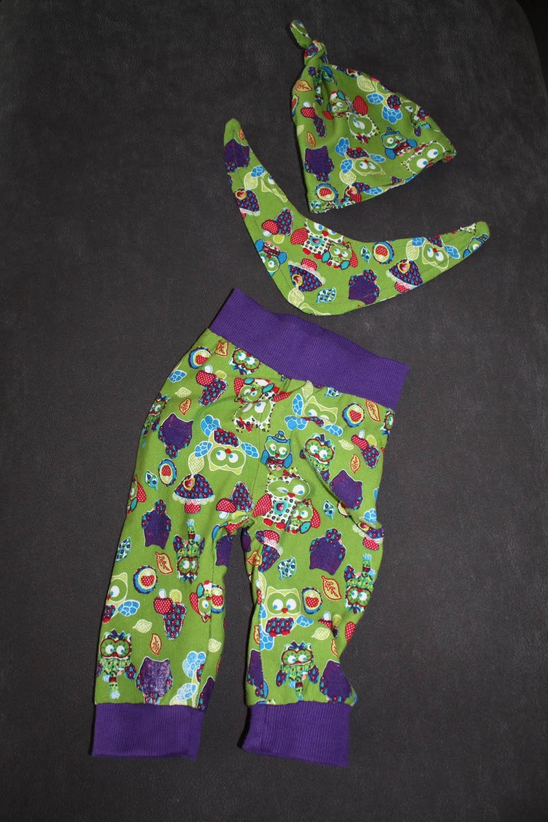 Nach dem ersten Erfolgserlebnis machte ich mich dann nach Maditas Geburt an eine weitere Knotenmütze und Pumphose nach den bekannten Schnitten RAS von Nähfrosch bzw. Krumme Nadel. Und da Madita in der Zwischenzeit regelmäßg ihre Shirts nass hatte, musste dringend ein Halstuch her. Das konnte doch auch nicht so schwierig sein. Und so nähte ich nach dem Schnitt und Anleitung vom Blog Krumme Nadel noch eines kleines Dreieckstuch.