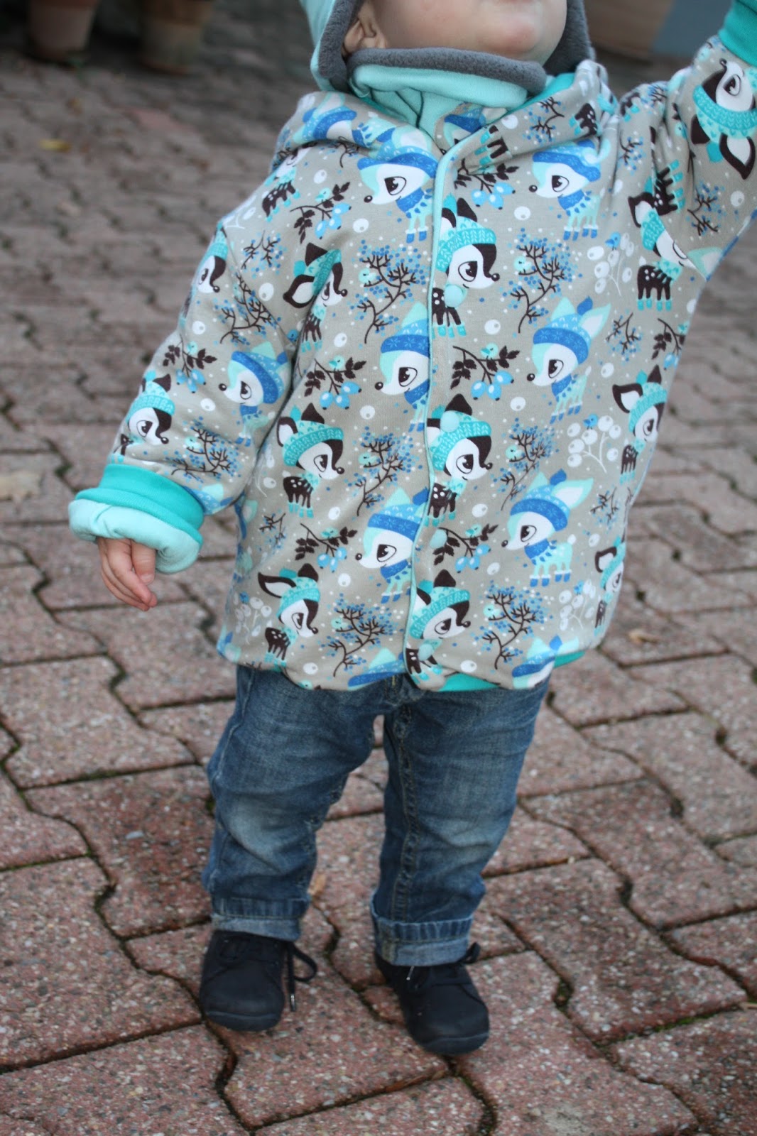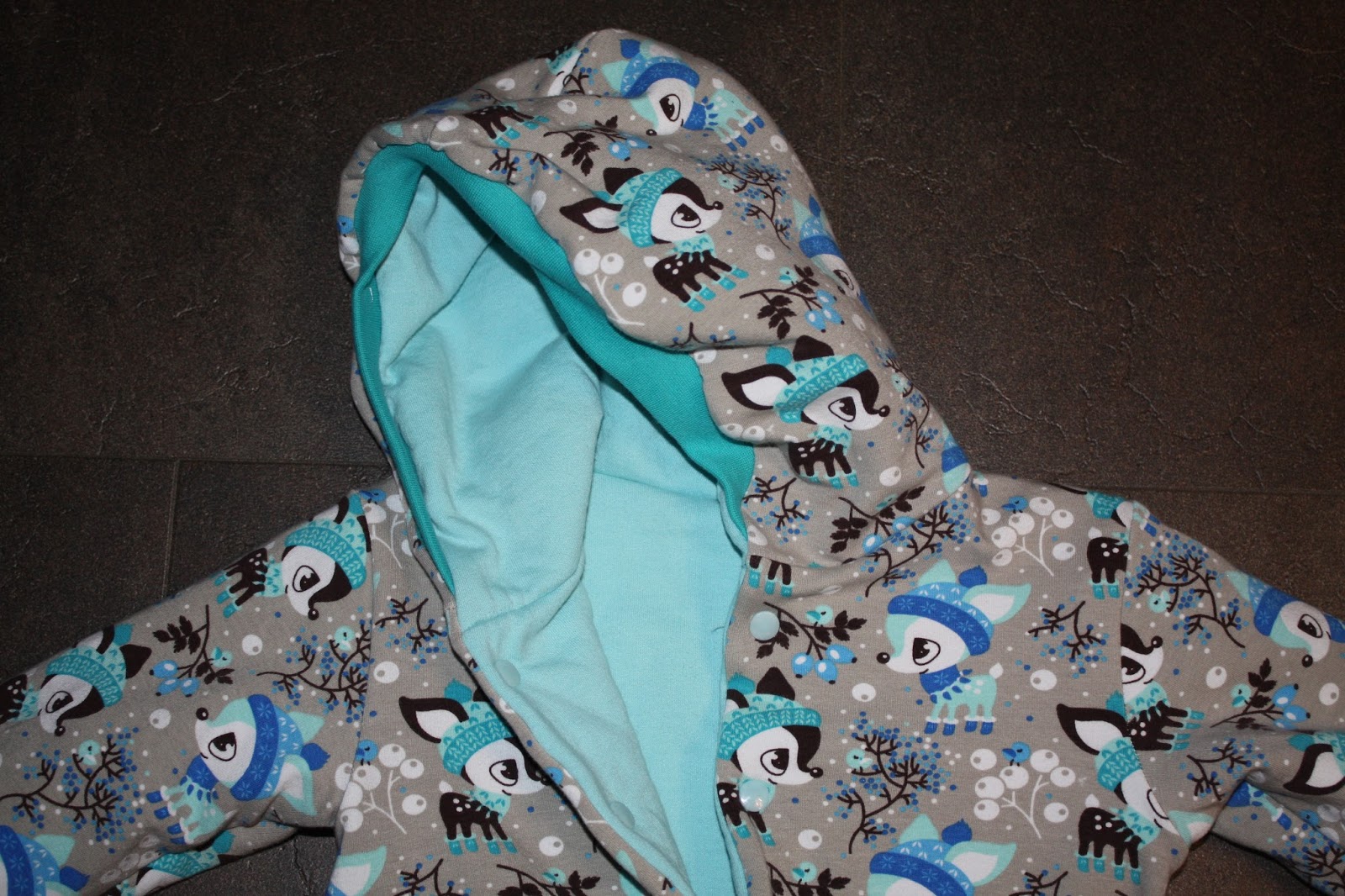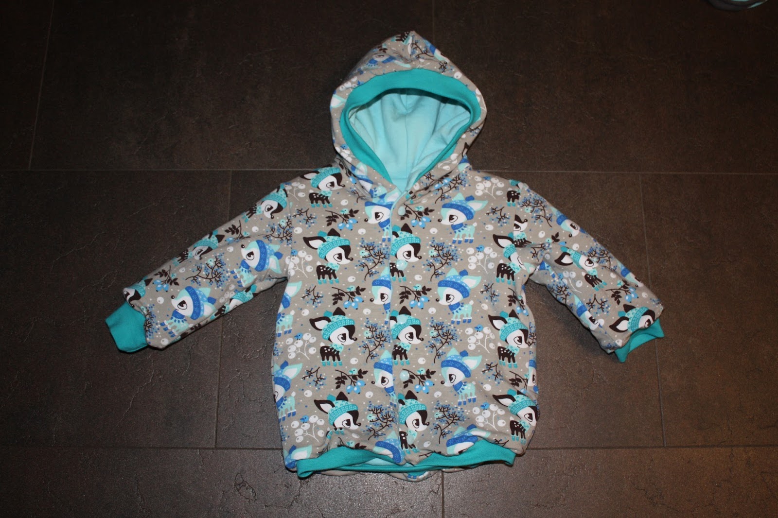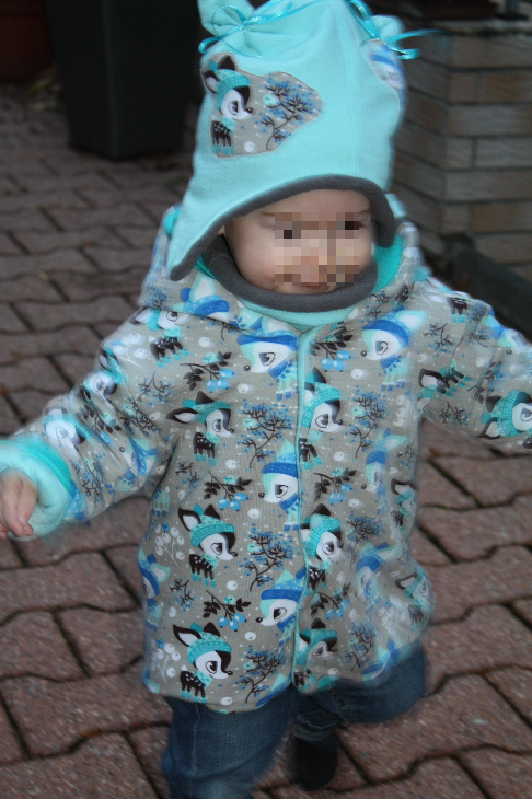 Da die Sommerjacke noch gut passt, habe ich auch die neue Winterversion in Größe 74/80 genäht. Damit wir aber im nächsten Winter nicht das gleiche Problem haben wie mit der Eulenjacke, habe ich sie um ein paar cm verlängert.