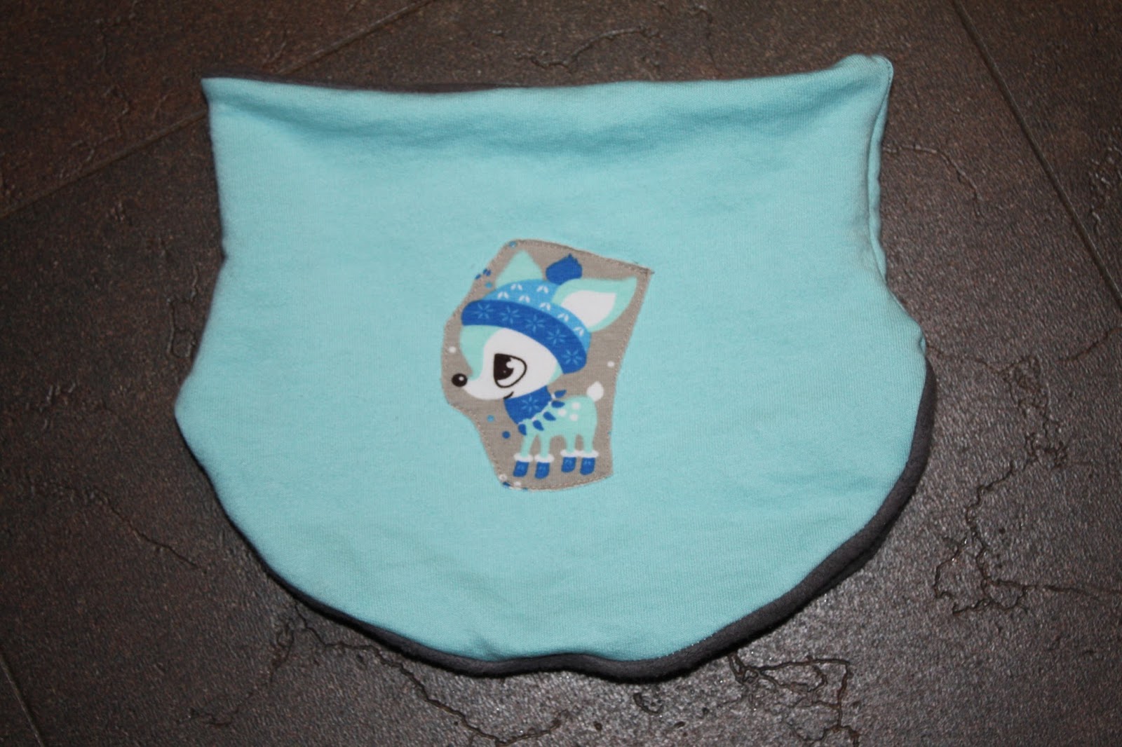 Als Schal habe ich eine Halssocke nach der Anleitung von olilu genäht. Wie schon bei der Mütze habe ich den Futtersweat und Baumwollfleece der Jacke mit einer Applikation des Außenstoffes verwendet.