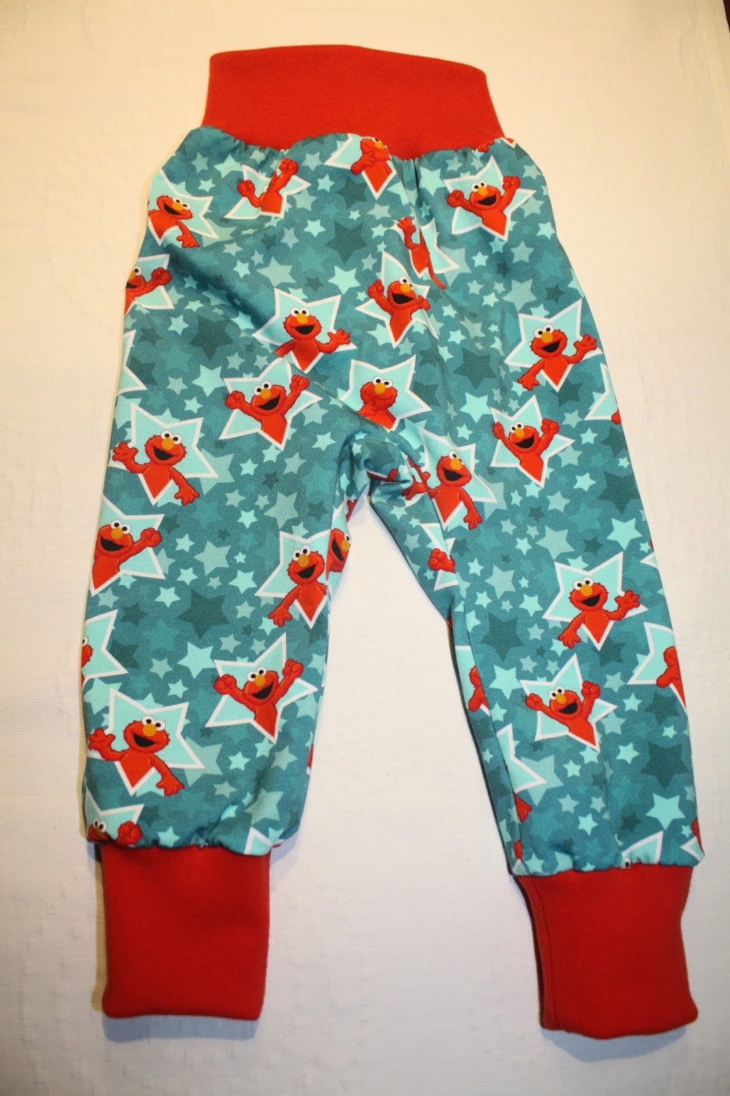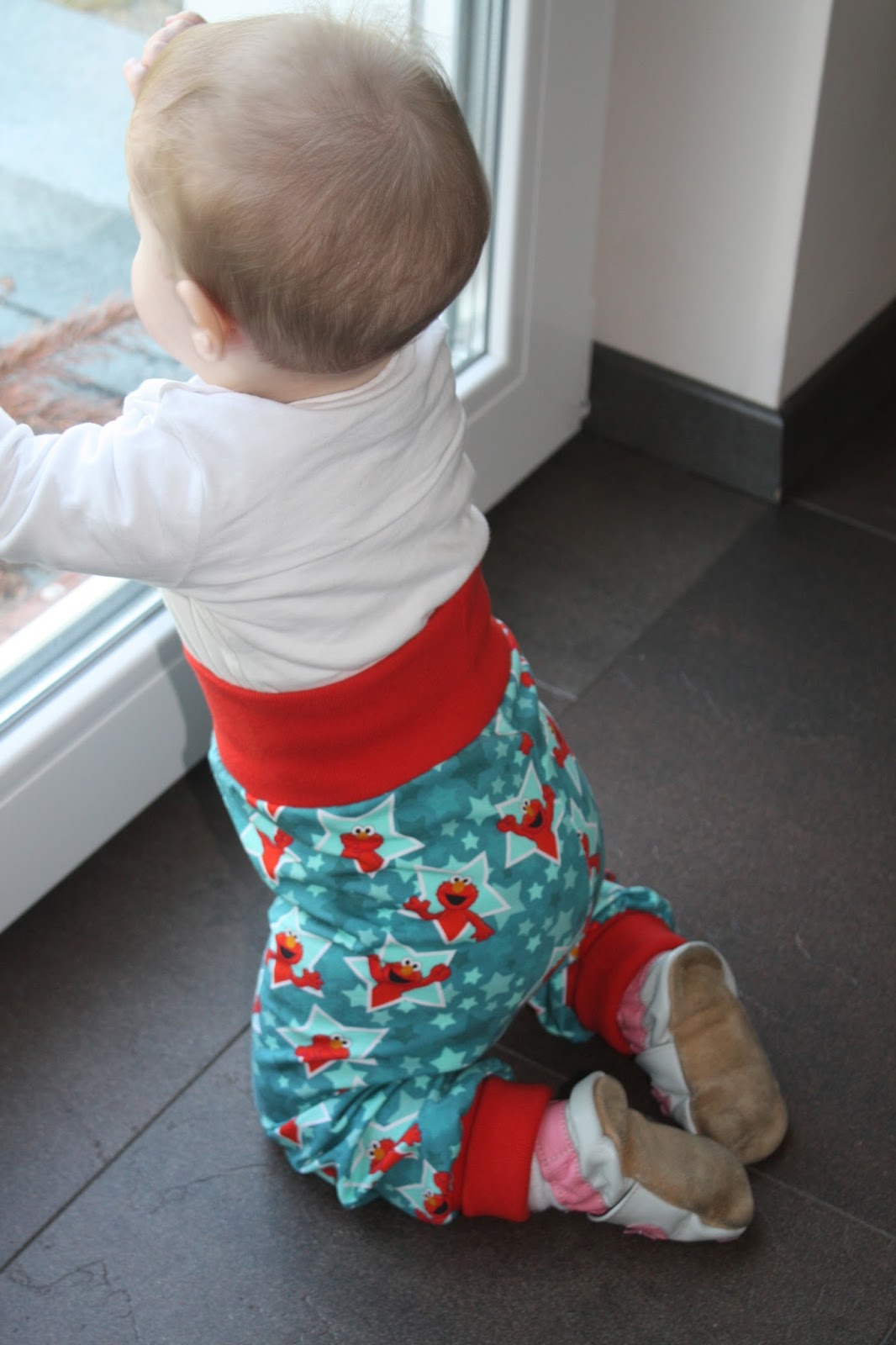 Als erstes habe ich die Elmo-Sterne vernäht und da ja wegen Krabbellöcher in den Hosen gerade das Nähen Neuer im Vordergrund steht, gab es daraus direkt noch eine weitere Pumphose in Größe 74. In dem wunderbaren Stoffladen Fachkultur habe ich sogar genau in dem Rot des Elmos ein passendes Bündchen bekommen.