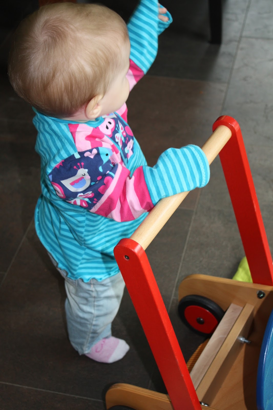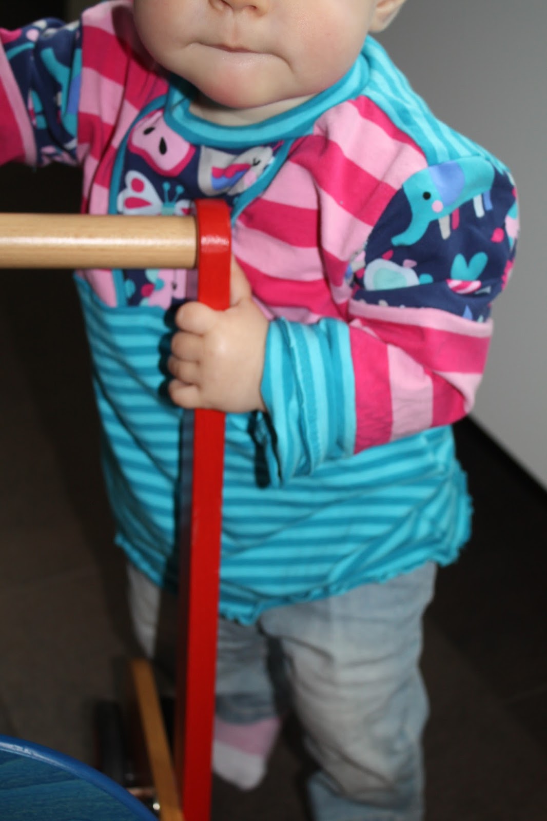 Genäht ist das Shirt für Später in Größe 86, weshalb es nach einmal kurz Probetragen zunächst erst mal in die Vorratskiste wandert. Ich bin nicht sicher, wenn Weite und Gesamtlänge des Shirts passen, ob dann die Ärmel nicht immer noch zu lang sind. Dieses Problem hatten wir ja schon öfter, aber das lässt sich dann ja bei Bedarf schnell ändern.