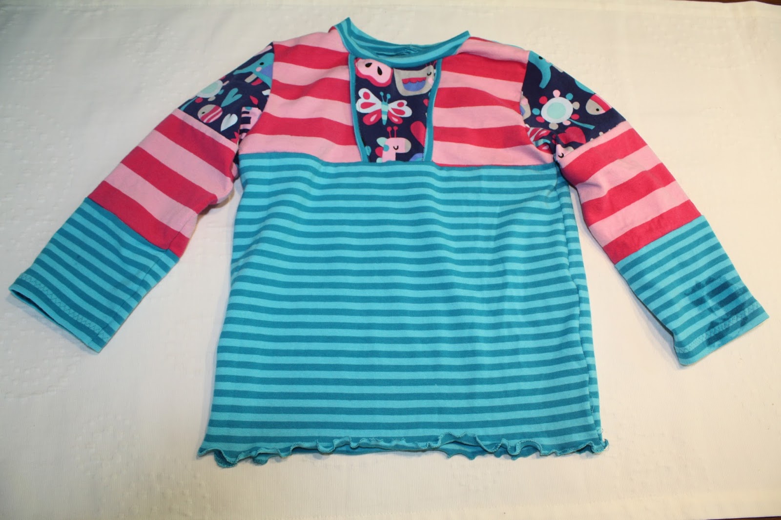 Sowohl die türkisen Streifen wie auch die rosa Streifen hatte ich bereits jeden für sich einmal mit dem Stoff von Little Darling kombiniert. Nun ist also ein drittes Oberteil entstanden, das aus allen drei Stoffen besteht.