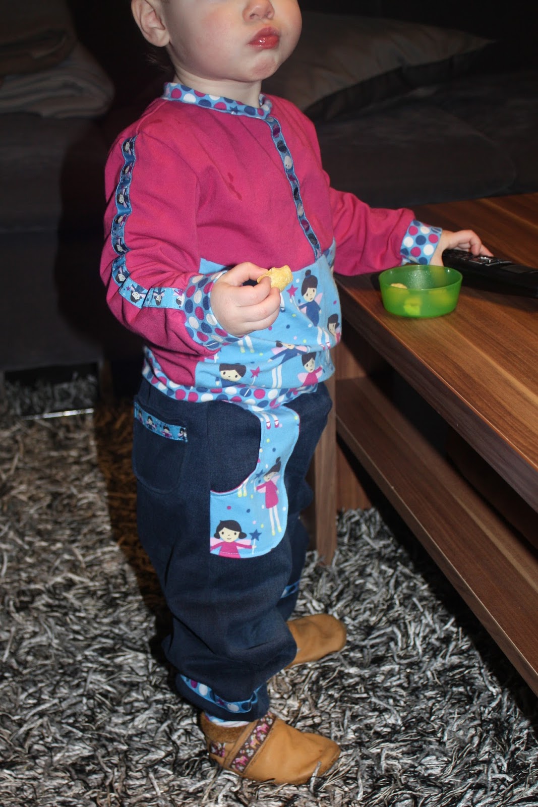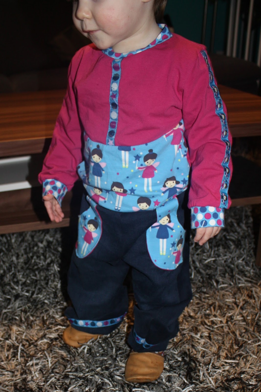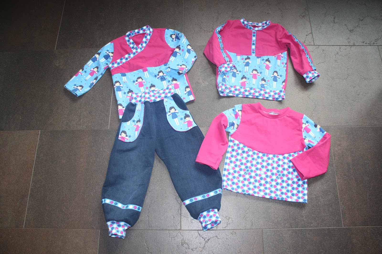 Alles vier Teile sind in Gr. 86 genäht, wobei sie unterschiedlich ausfallen. Vor allem die Hose ist noch sehr reichlich, während die Oberteile schon etwas besser passen.