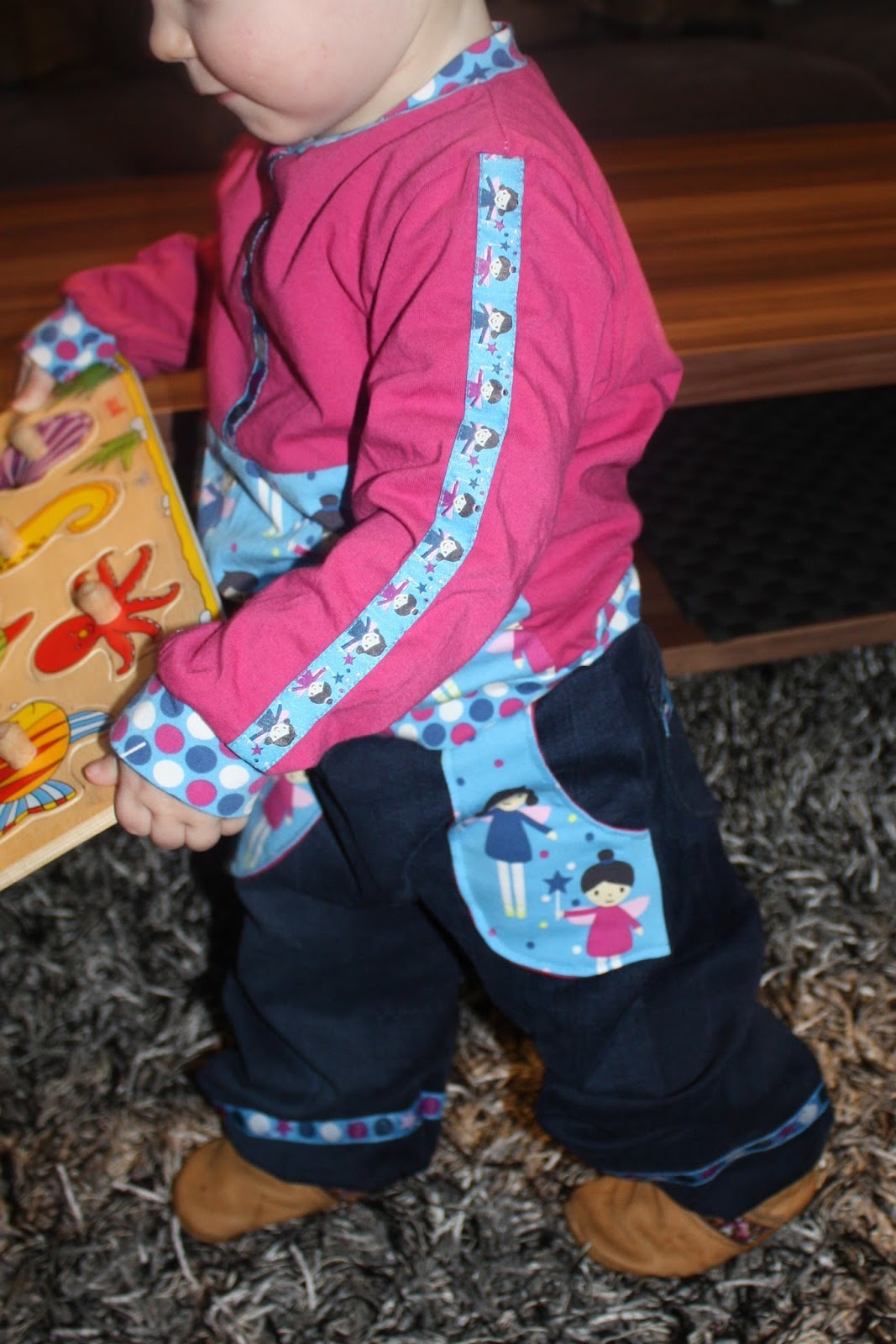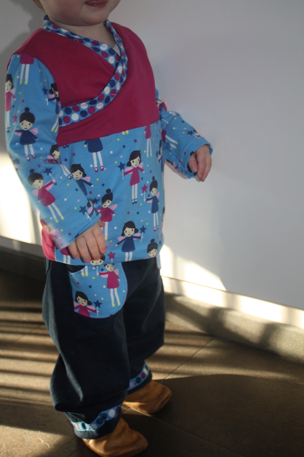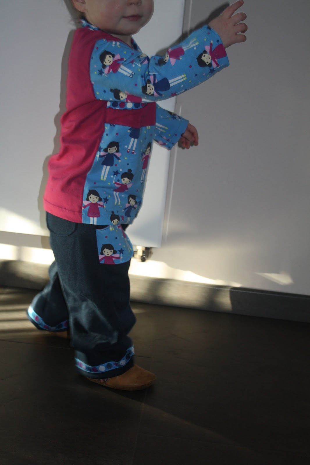 Alles vier Teile sind in Gr. 86 genäht, wobei sie unterschiedlich ausfallen. Vor allem die Hose ist noch sehr reichlich, während die Oberteile schon etwas besser passen.