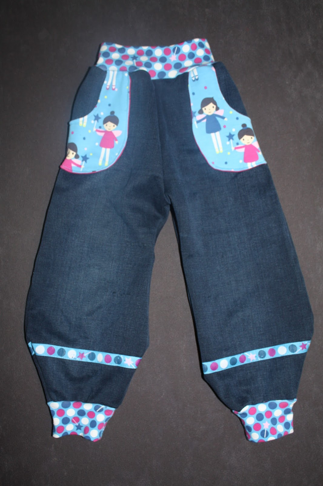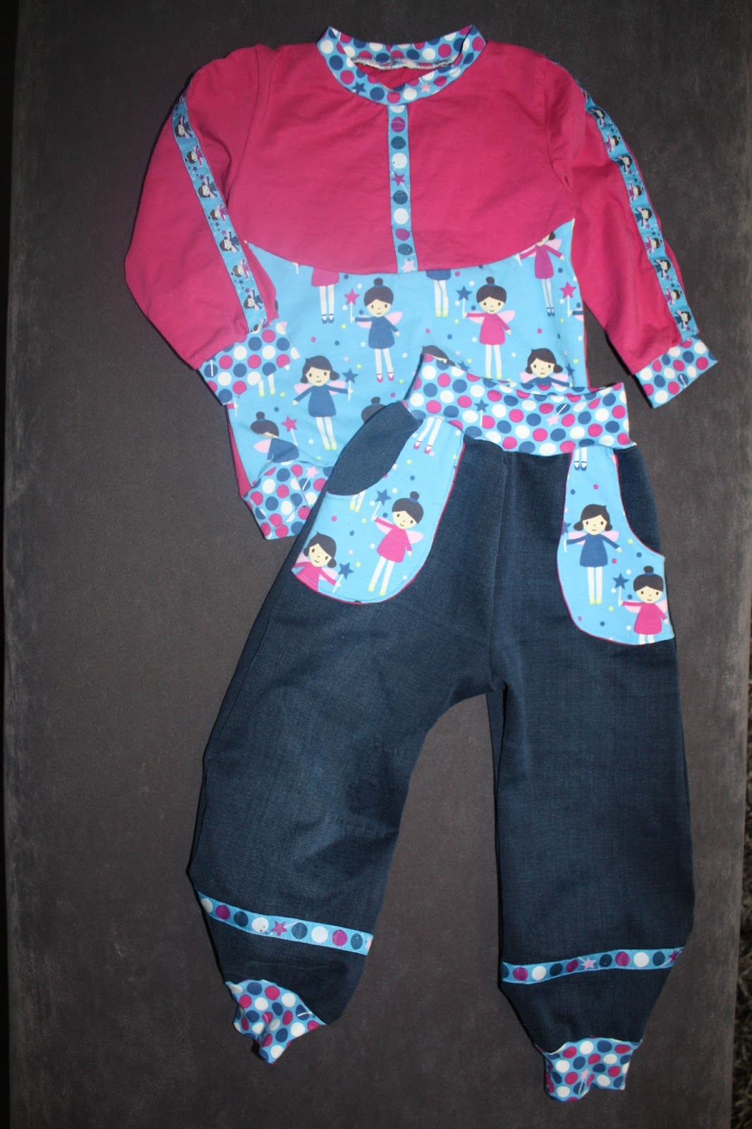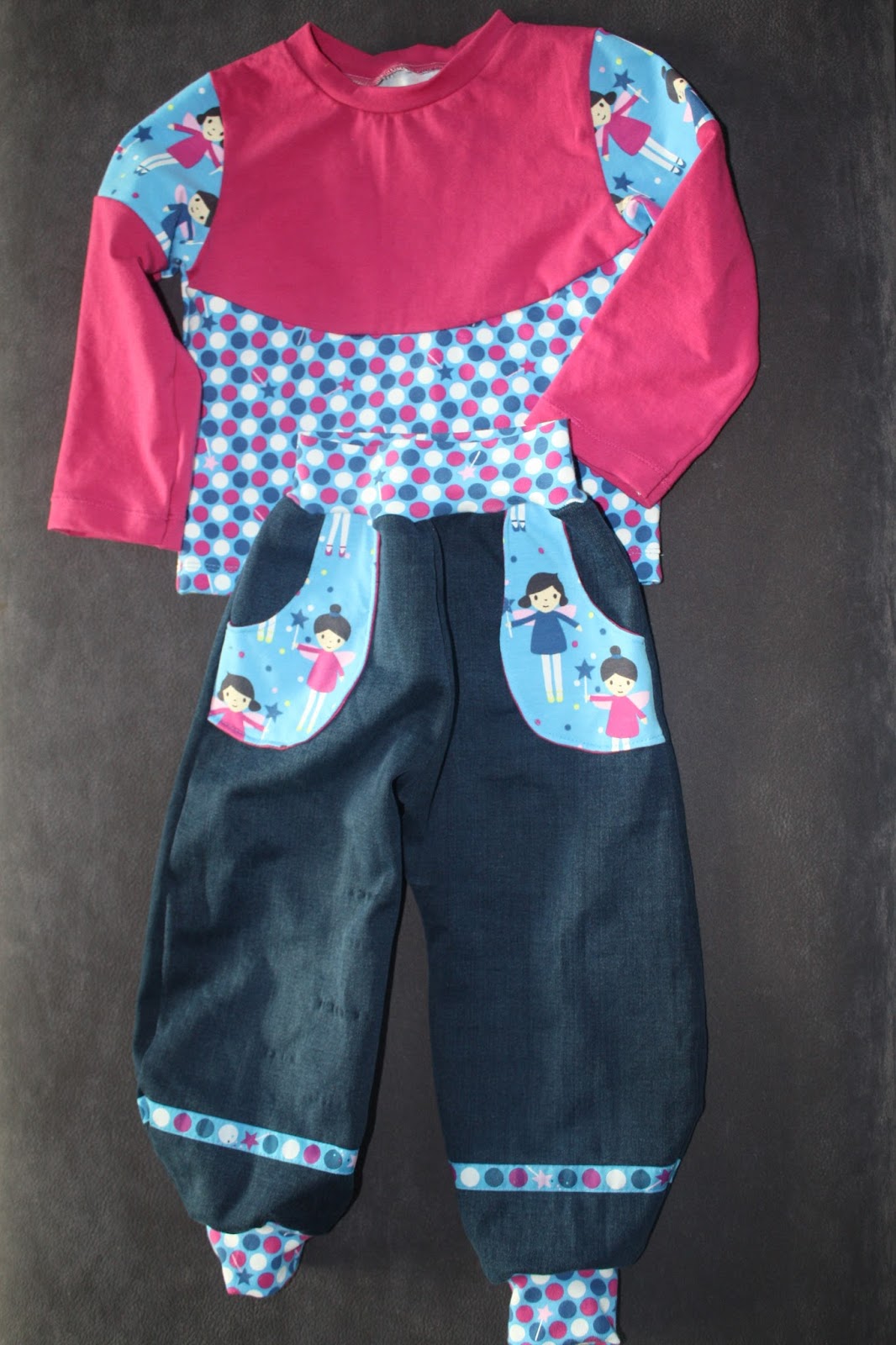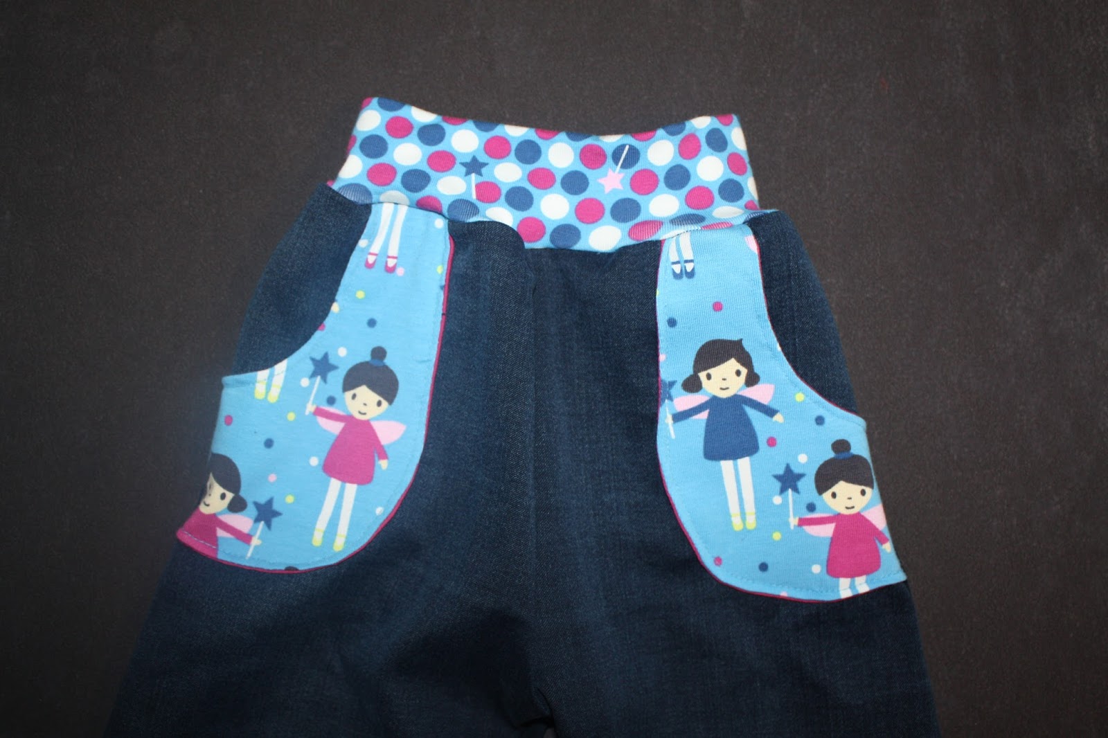 Dieses Feen-Shirt habe ich Madita sehr gern angezogen, nun ist es aber schon länger etwas zu klein. Aber ich hatte noch Stoff übrig, also sollte ein Neues her. Und da ich inzwischen passende Kombis aus Hose und Oberteil so süß finde, wie z.B. das Rotkäppchen-Set, sollte aus den Feen-Resten auch ein Set entstehen. Damit das ganze aber nicht zu bunt bzw. zu gleich aussieht, was dann oft so ein Schlafanzug-Charakter hat, habe ich mich bei der Hose für eine Kombination mit Jeans-Stoff und beim Oberteil für einen einfarbigen Jersey entschieden. Außerdem hatte ich bei Michas Stoffecke das passende Webband entdeckt, was auch Verwendung finden sollte. Und dann habe ich mir noch überlegt, dass auch zwei passende Shirts toll wären, denn Hosen halten bei uns doch oft ein zwei Tage länger als die Oberteile ohne Wäsche aus. Also habe ich fleißig gepuzzelt, welche Schnitte und Stoffe ich nun wie kombinieren kann. Aber ich war sehr erfolgreich und habe sogar zur Hose drei passende Shirts zuschneiden können.