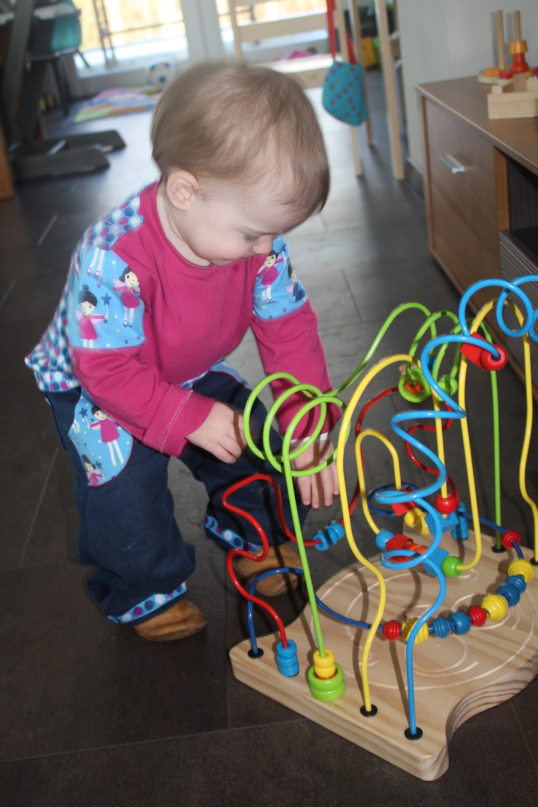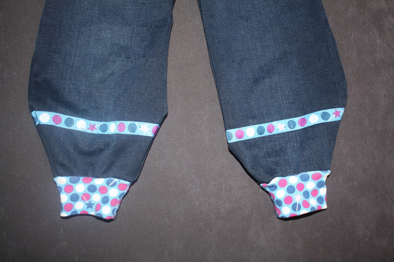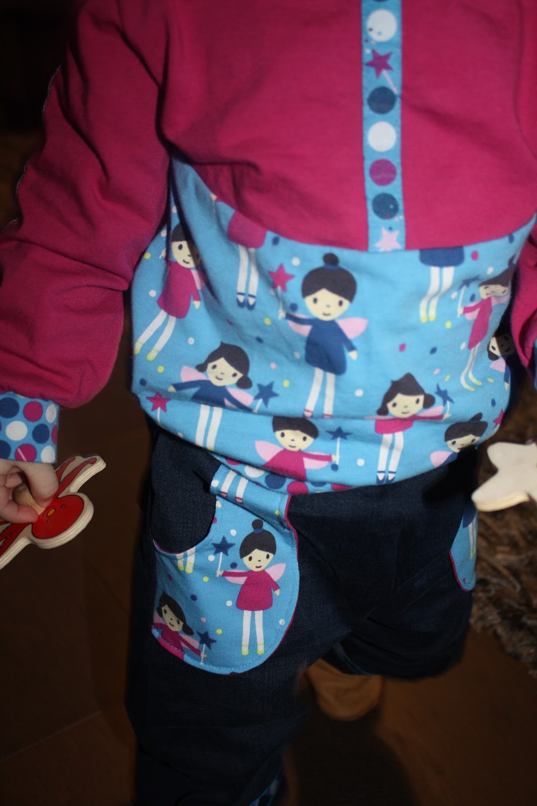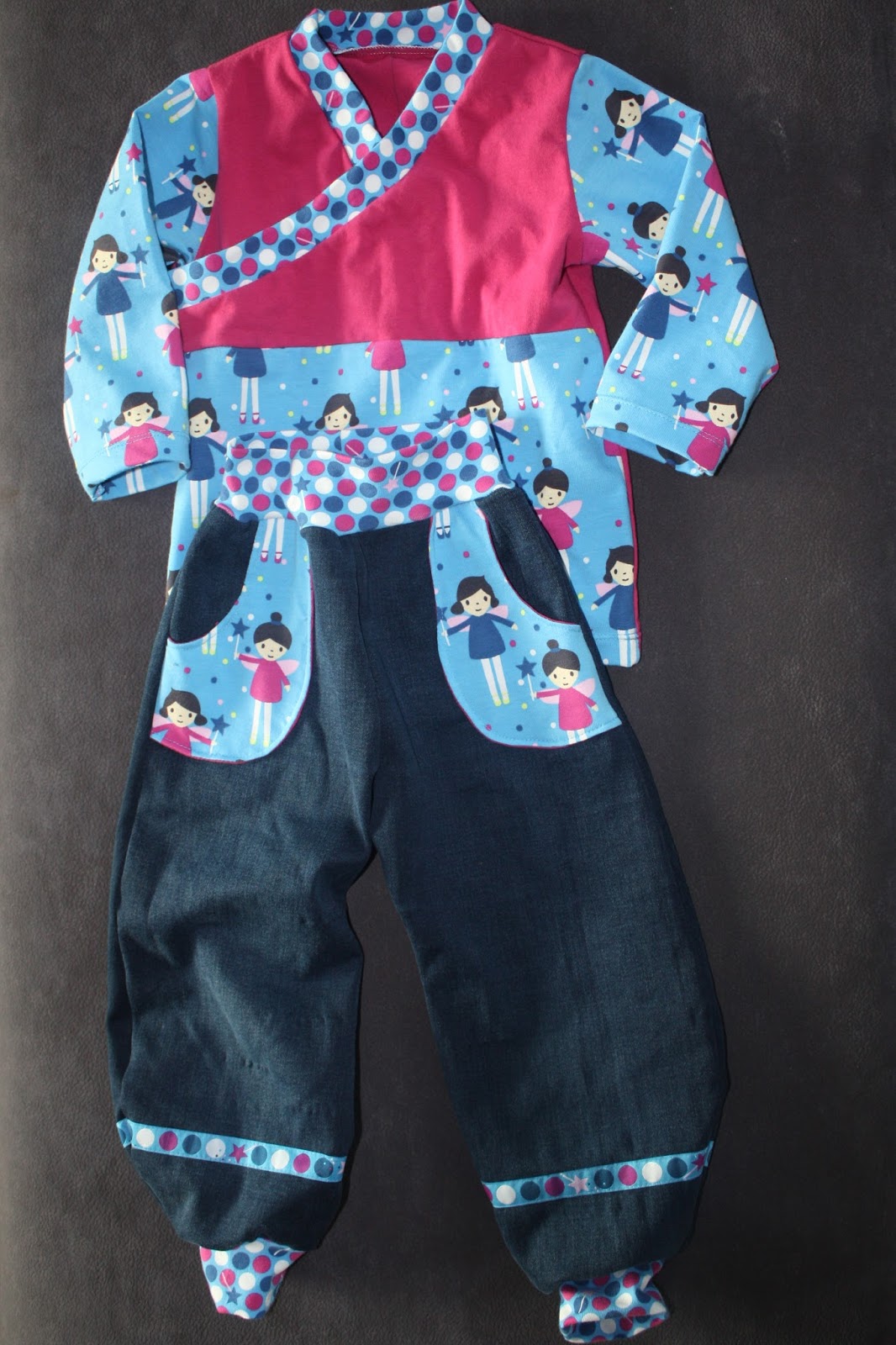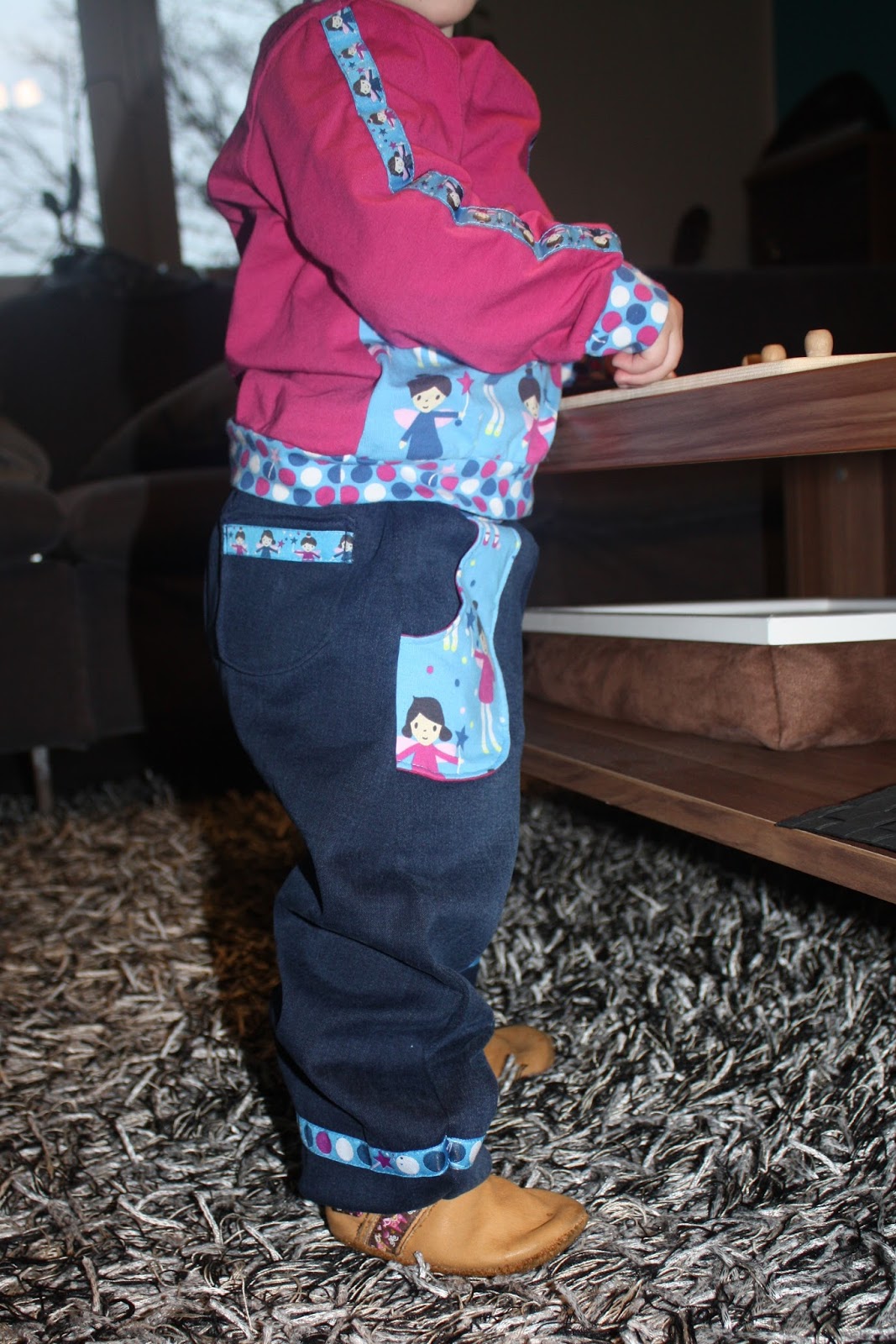 Dieses Feen-Shirt habe ich Madita sehr gern angezogen, nun ist es aber schon länger etwas zu klein. Aber ich hatte noch Stoff übrig, also sollte ein Neues her. Und da ich inzwischen passende Kombis aus Hose und Oberteil so süß finde, wie z.B. das Rotkäppchen-Set, sollte aus den Feen-Resten auch ein Set entstehen. Damit das ganze aber nicht zu bunt bzw. zu gleich aussieht, was dann oft so ein Schlafanzug-Charakter hat, habe ich mich bei der Hose für eine Kombination mit Jeans-Stoff und beim Oberteil für einen einfarbigen Jersey entschieden. Außerdem hatte ich bei Michas Stoffecke das passende Webband entdeckt, was auch Verwendung finden sollte. Und dann habe ich mir noch überlegt, dass auch zwei passende Shirts toll wären, denn Hosen halten bei uns doch oft ein zwei Tage länger als die Oberteile ohne Wäsche aus. Also habe ich fleißig gepuzzelt, welche Schnitte und Stoffe ich nun wie kombinieren kann. Aber ich war sehr erfolgreich und habe sogar zur Hose drei passende Shirts zuschneiden können.