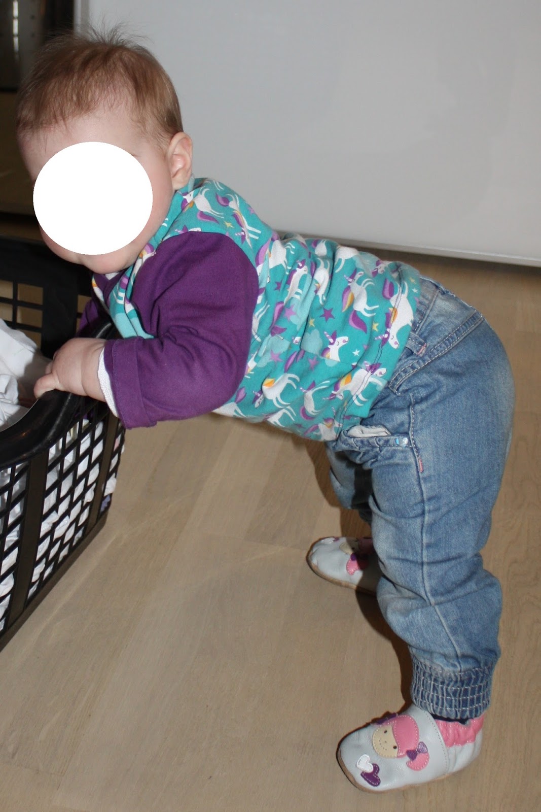 Aus dem schönen Einhörner-Stoff „Lenis Dream“ von Hamburger Liebe ist ein weiteres Langarmshirt nach dem Trotzkopf Schnitt von Schnabelina in Größe 74 entstanden. Der lila Jersey für Ärmel und Bündchen am Hals ist noch ein Rest von der Jacke.