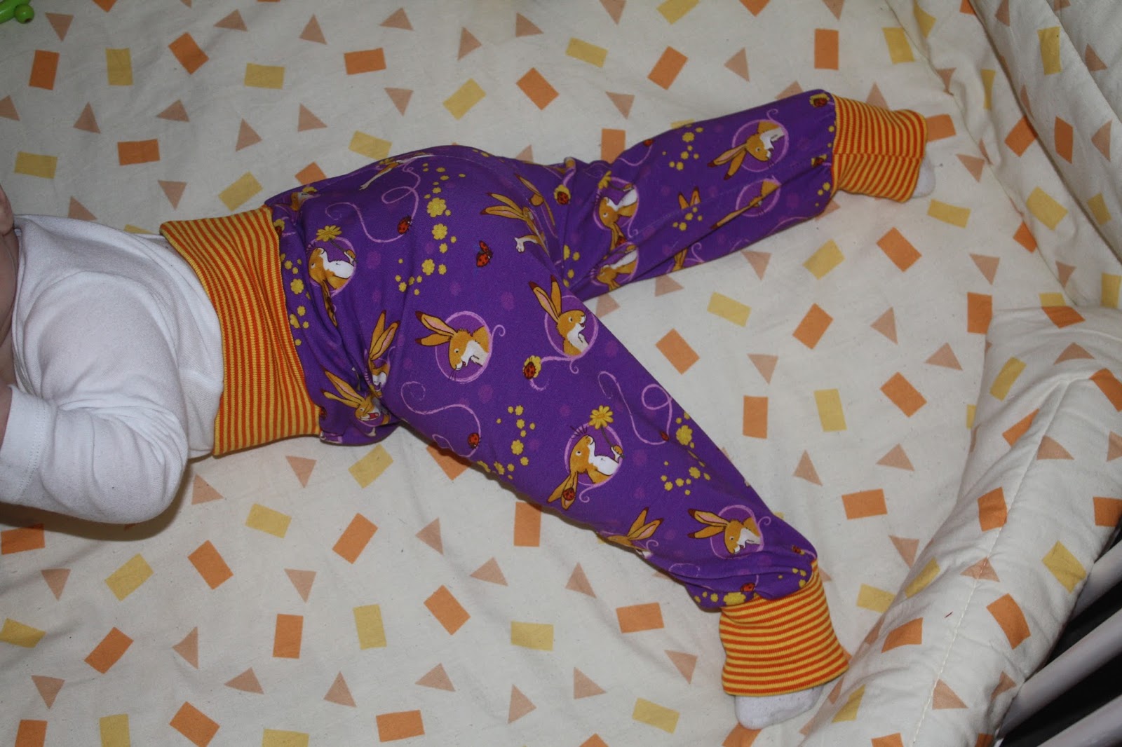 In meinem ersten Stoff und Liebe Paket mit der Eigenproduktion „Weißt du wie lieb ich dich habe“ war auch noch der lila „So lieb“-Stoff. Hier stand immer schon fest, dass daraus mal eine Pumphose wird, also war es nun an der Zeit. Jetzt fehlte nur noch ein passendes Bündchen. Mein erster Gedanke war gelb-orange gestreift dazu. Hier vor Ort habe ich sowas aber nirgendwo gefunden, also habe ich mutig in der Hoffnung, dass die Farben passen bei Michas Stoffecke bestellt. Als das gelb-orang-gestreifte Bündchen hier ankam, passten zwar die Farben, aber ich war mir nicht mehr so sicher, ob mein erster Gedanke die Kombi mit dem lila Stoff nicht doch zu knallig ist. Aber nun war es einmal da und daher wagte ich es. Und ich bin begeistert 🙂 So ein kleiner Streifen wirkt doch anders als das ganze Stück Stoff. Mir gefällt`s.