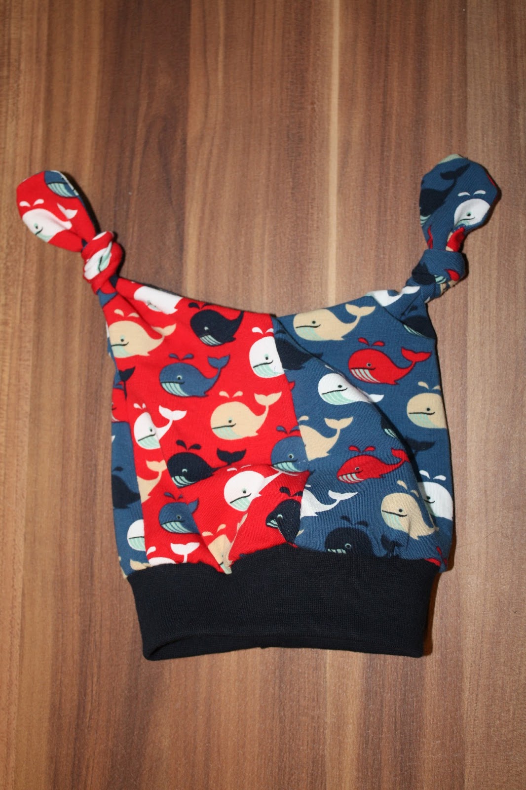 Auch den Schnitt MiniMop von aefflynS habe ich schon mehrfach genäht. Allerdings habe ich diesmal zum ersten Mal zwei verschiedene Stoffe verwendet und irgendwie stand ich damit etwas auf dem Kriegsfuß. Ich dachte man kann die Mütze trotzdem im Stoffbruch zuschneiden und faltet sie dann nur anders, aber nein das geht nicht, dann stehen die Zipfel nach innen. Man braucht bei zwei Stoffen vier einzelne Teile. Auch wenn man etwas schon zig Mal genäht hat, sollte man besonders bei Veränderungen doch noch mal einen Blick in die Anleitung werfen 😉 Also habe ich die Teile auseinander geschnitten, in der Hoffnung, dass die Mütze trotz fehlender Nahtzugabe an der Schnittkante groß genug wird. Aber dem war nicht so. Ich hatte mich eh schwer getan, welche Mützengröße man am besten zu einer 68er Hose nimmt. Maditas kleiner Kopf ist da ja leider kein Maßstab 😉 Auf jeden Fall war die Mütze viel zu klein. Nicht schlimm, bekommt sie irgendwann mal ein anderes Baby. Also alles noch mal neu zugeschnitten, diesmal in Größe 45/46. Dann passten aber beim Zusammenlegen, zwei Teile nicht aufeinander. Ich hatte drei gleiche Teile und nur eins, das spiegelverkehrt war :-O Also noch mal ein Teil neu zugeschnitten und wieder zuammengelegt, nun stellte ich aber fest, dass ich wohl das falsche Teil neu zugeschnitten hatte. Ich hatte zwar jetzt zwei rote und zwei blaue Teile, und auch vier Teile von denen zwei spiegelverkehrt waren, aber es passte ein blaues auf ein rotes Teil :-O Also war die Mütze nicht eine Hälfte rot und die andere blau, sondern die Farben wechselten sich ab. War zwar nicht geplant, aber trotzdem gefällt mir diese Variante.
