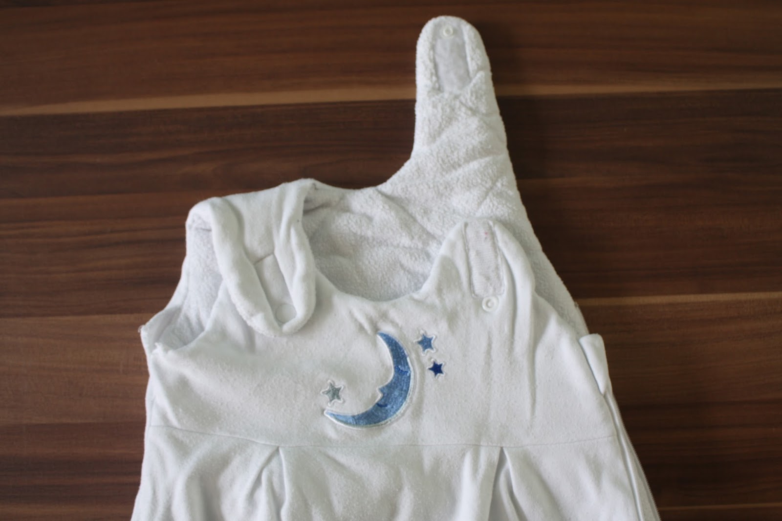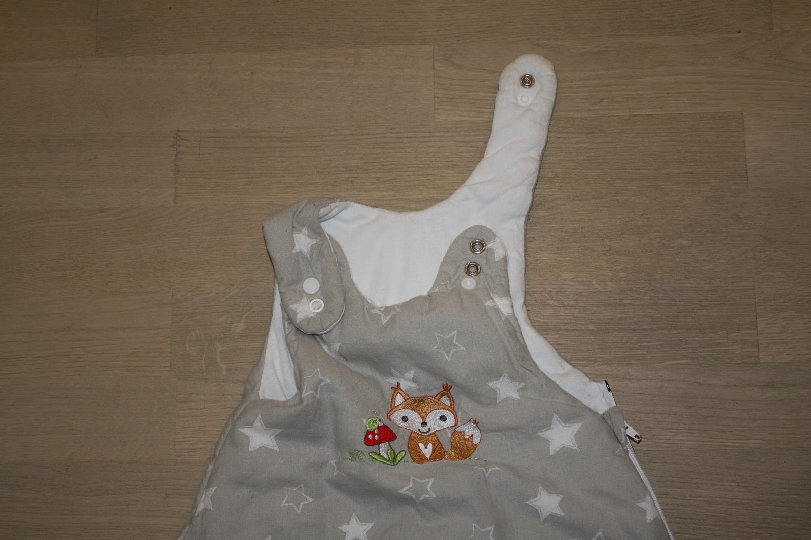 Zur Geburt hatten wir einen Schlafsack mit passendem Innensack in Größe 50/56 geschenkt bekommen und zum Glück passte dieses Model. Außerdem gab es bei der Geburt einen in Größe 62/68 vom Krankenhaus geschenkt, der ebenfalls passte. Dieser hatte allerdings Klettverschlüsse an den Trägern, die Madita irgendwann selbst öffnen konnte. Da habe ich dann einfach zusätzlich Druckknöpfe angebracht und das Problem war behoben.