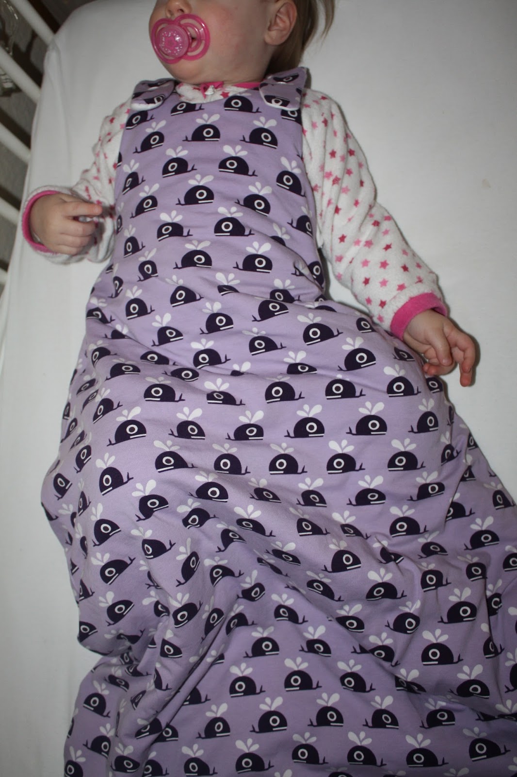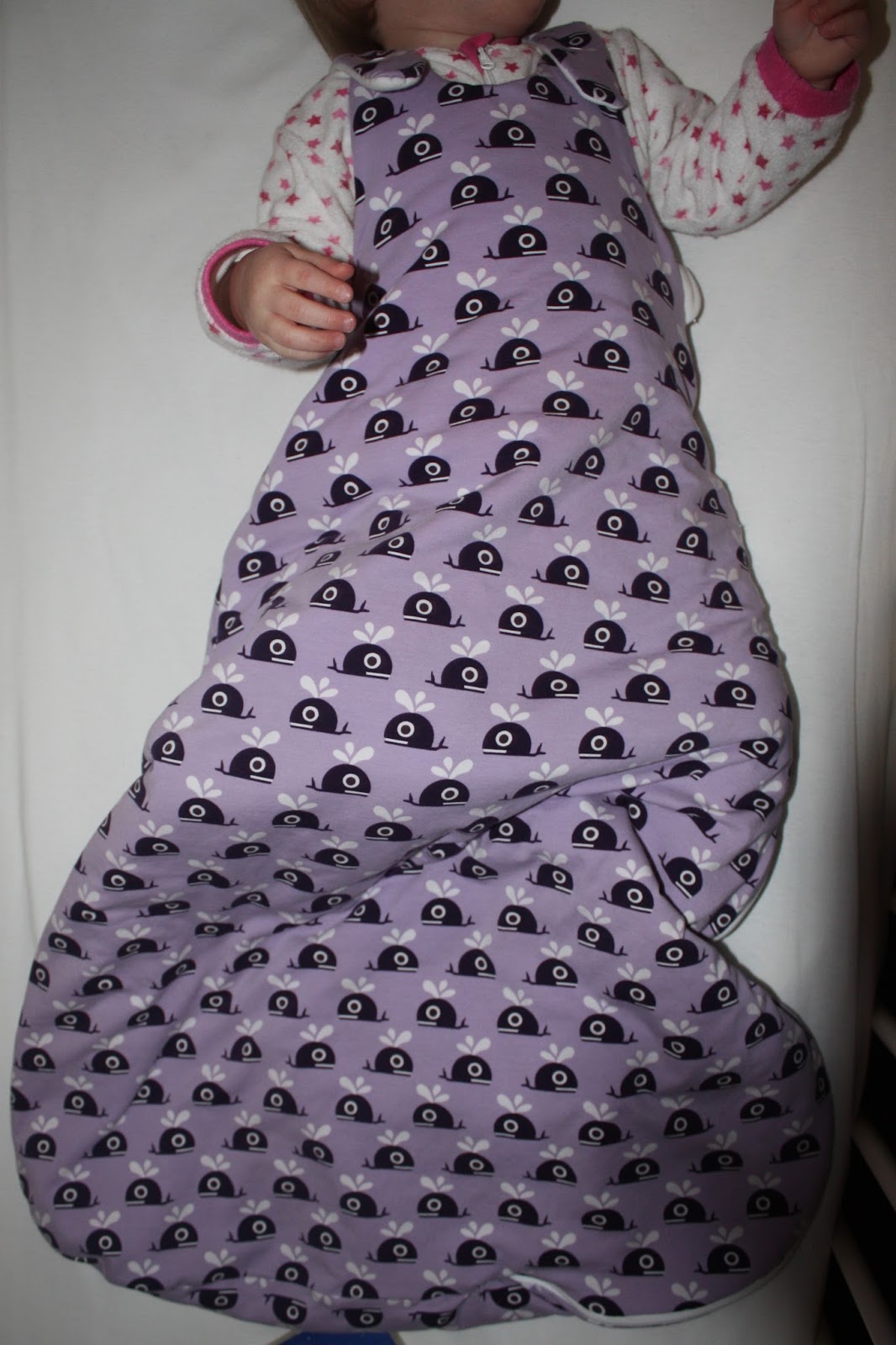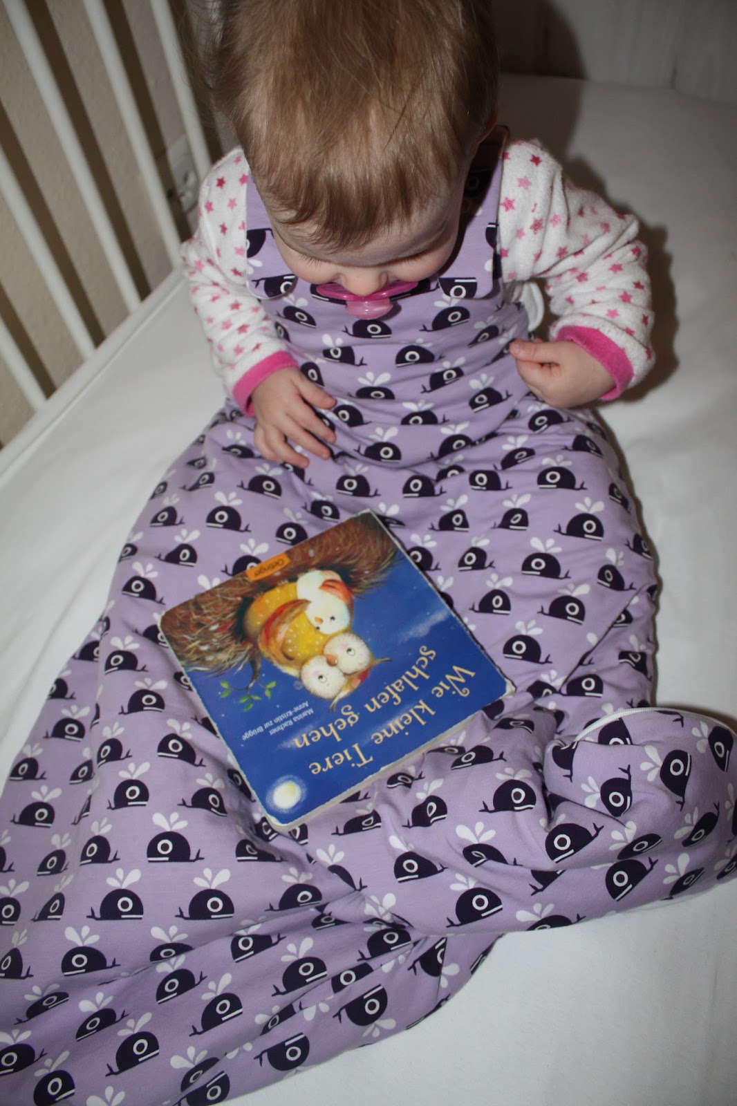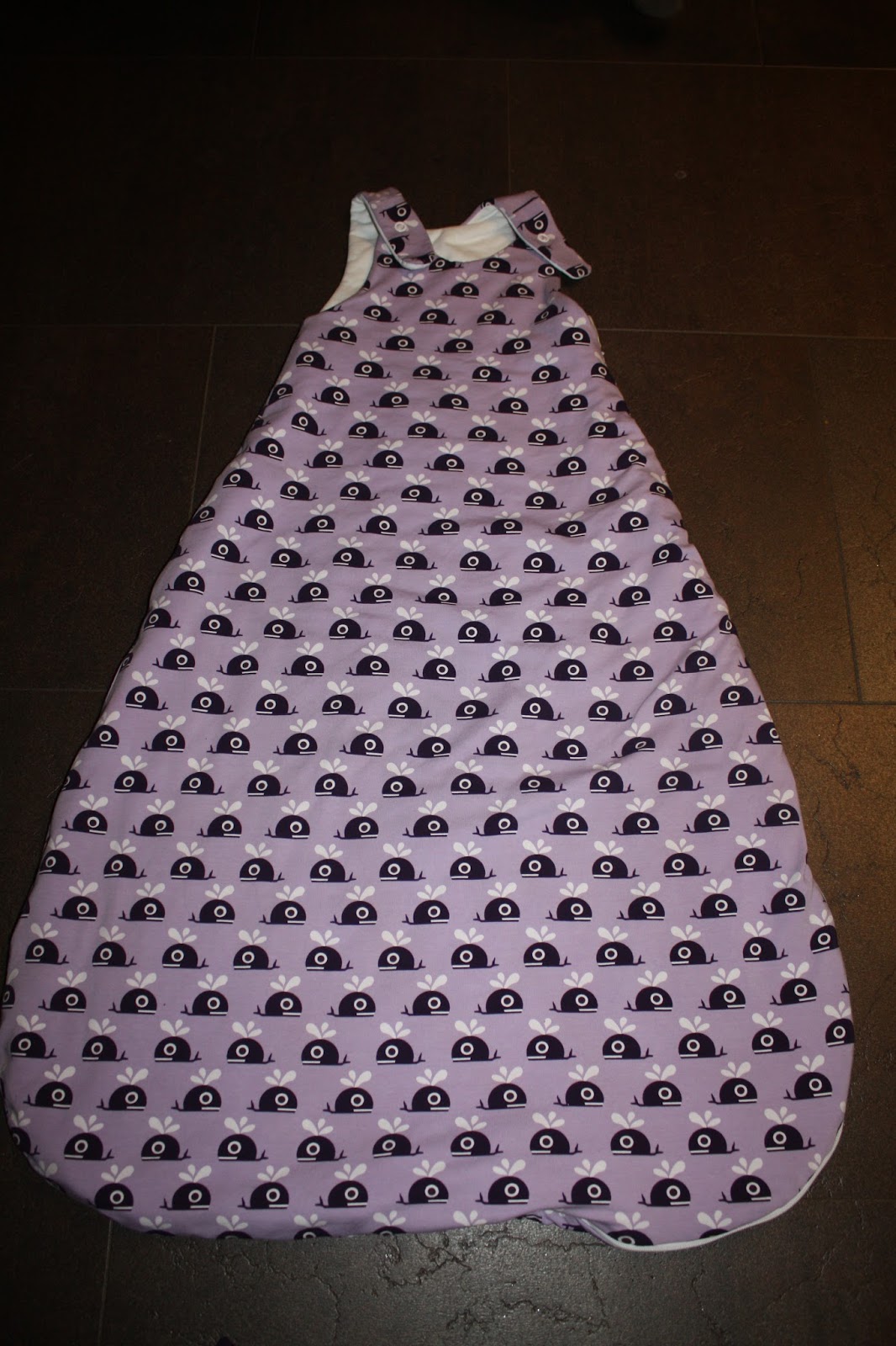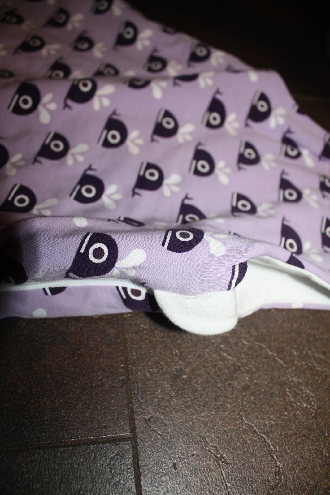 Der zuletzt genähte Schlafsack mit den rosa Walen ist bereits oft im Einsatz, aber da ich aufgrund des Materials mit diesem grauen Schlafsack nicht zufrieden bin, musste noch ein Ersatzschlafsack her. Bei Pattydoo hatte ich einen Schlafsack-Schnitt entdeckt, der meinem selbstentworfenen ähnelt. Da ich meinen entsprechend Maditas aktueller Größe anpassen müsste, dachte ich mir, wäre der gekaufte Schnitt vielleicht eine Alternative. Gesagt -Getan, aber ich musste nach dem Zusammenkleben des Schnittmusters feststellen, dass auch dieser Schnitt so gar nicht für unser zu-kleiner-Kopf-Problem geeignet ist. Also habe ich doch wieder meinen eigenen Schnitt umgewandelt. Beim Nähen habe ich mich aber diesmal nicht an meiner, sondern an der Anleitung von Pattydoo orientiert. Das hat gut geklappt.