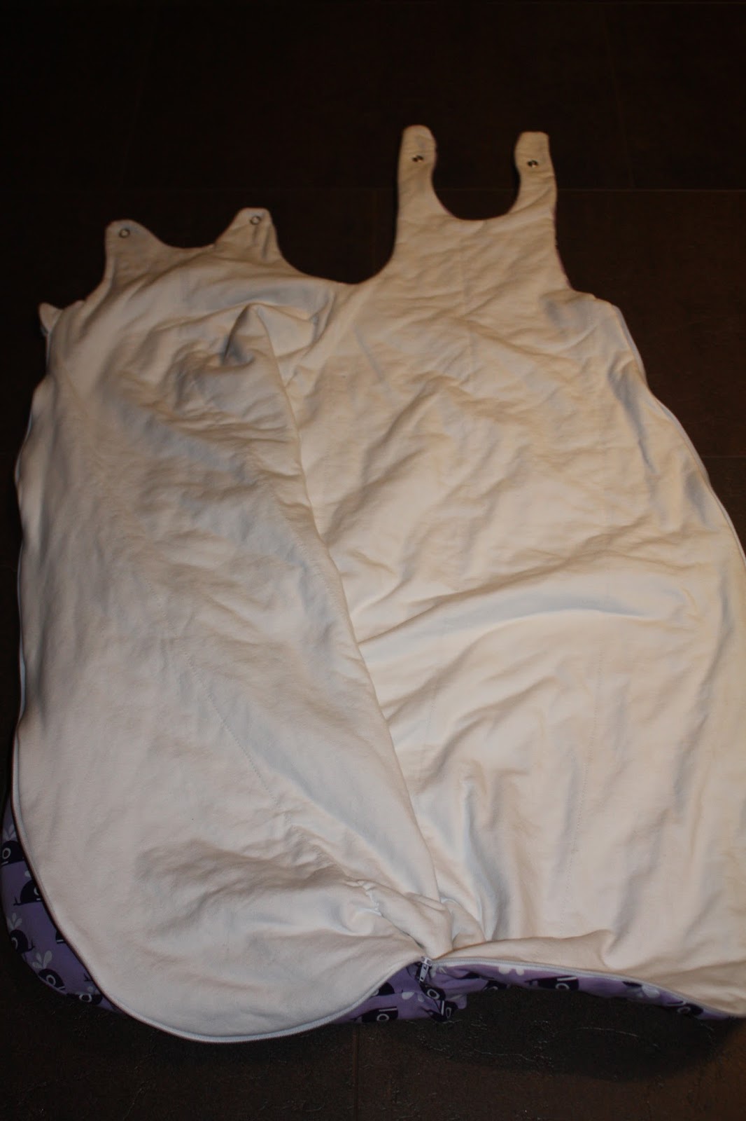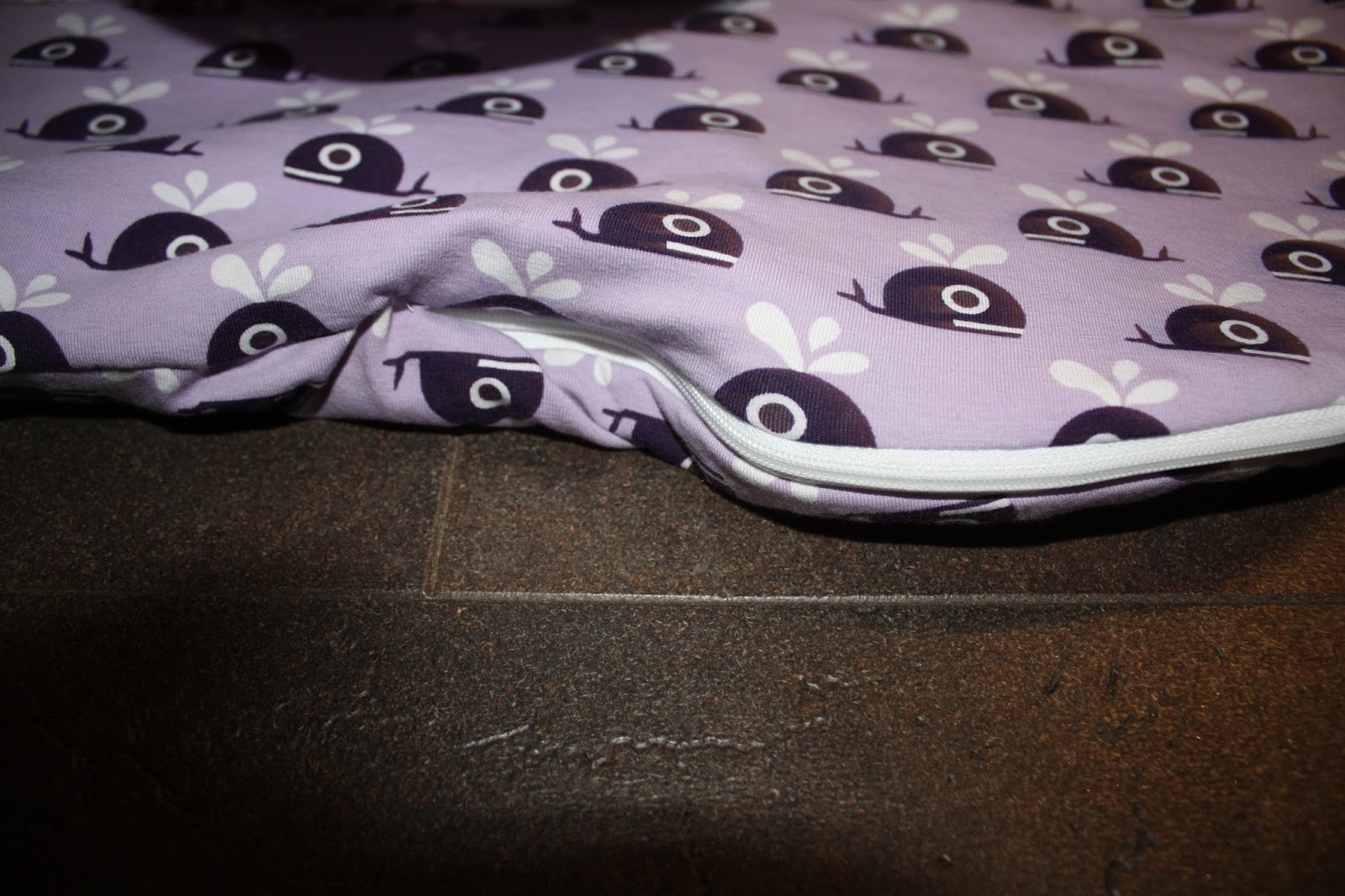Bei meinem eigenen Schnitt habe ich bisher einen geteilten Reißverschluss verwendet, der unter dem Arm beginnend geschlossen wird. Da ich aber leider keinen geteilten Reißverschluss mehr vorrätig hatte, habe ich einen endlos Reißverschluss verwendet und ihn wie bei der Anleitung von Pattydoo angegeben eingenäht. Allerdings bekomme ich den Übergang am Ende nicht ordentlich hin. Sieht zwar nicht so schön aus, aber ich denke die Schlaftauglichkeit wird dadurch nicht beeinträchtigt 😉 Generell gefällt mir ein geteilter Reißverschluss, der am Fußende beginnend geöffnet wird, besser, aber die Endlos-Variante ist natürlich die kostengünstigere.