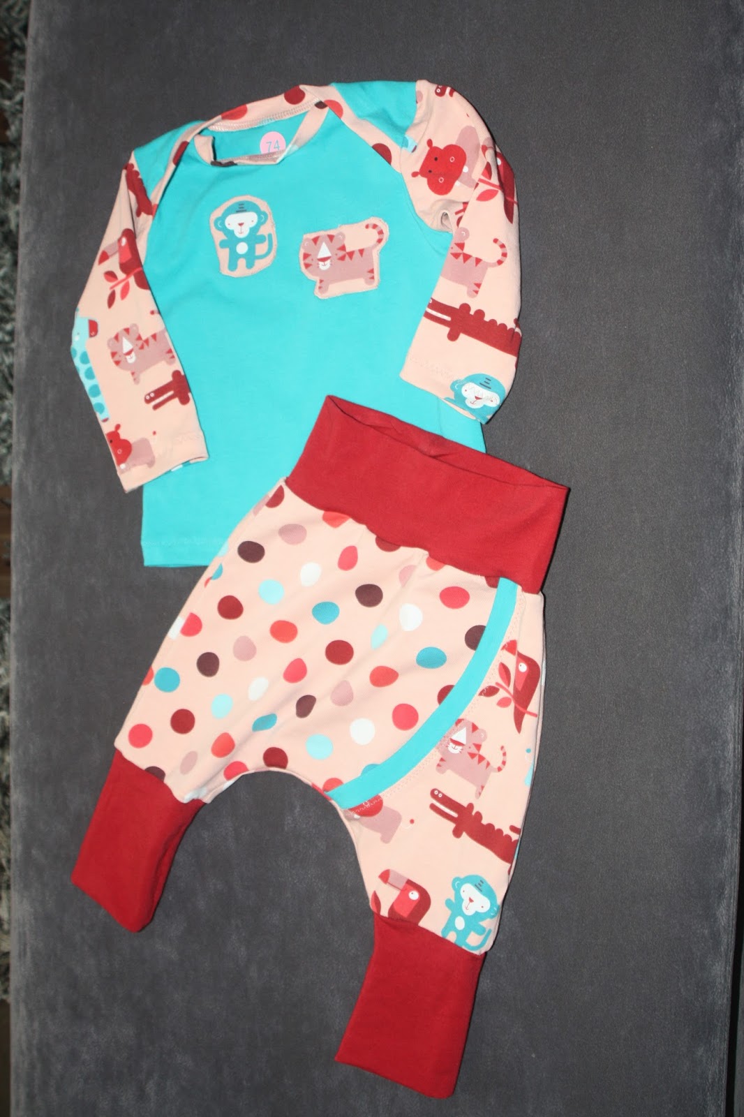 Als Geschenk zur Geburt habe ich ein Set aus Hose nach dem Schnitt Knopfknirps und ein Oberteil nach dem E-Book Babyshirt von Klimperklein genäht.