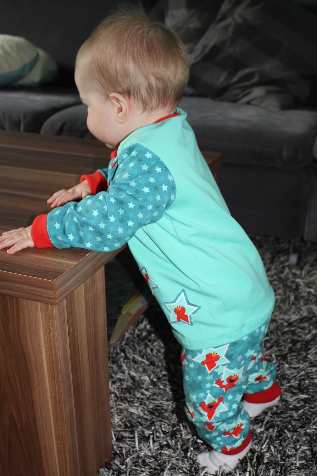 Der Stoff mit den großen Elmo-Sternen und auch der passende Kombistoff mit den kleinen Sternen ist eine Eigenproduktion von Stoff und Liebe. Auf dem holländischen Stoffmarkt in Leverkusen habe ich passend dazu einen einfarbigen Stoff in Mint gefunden.