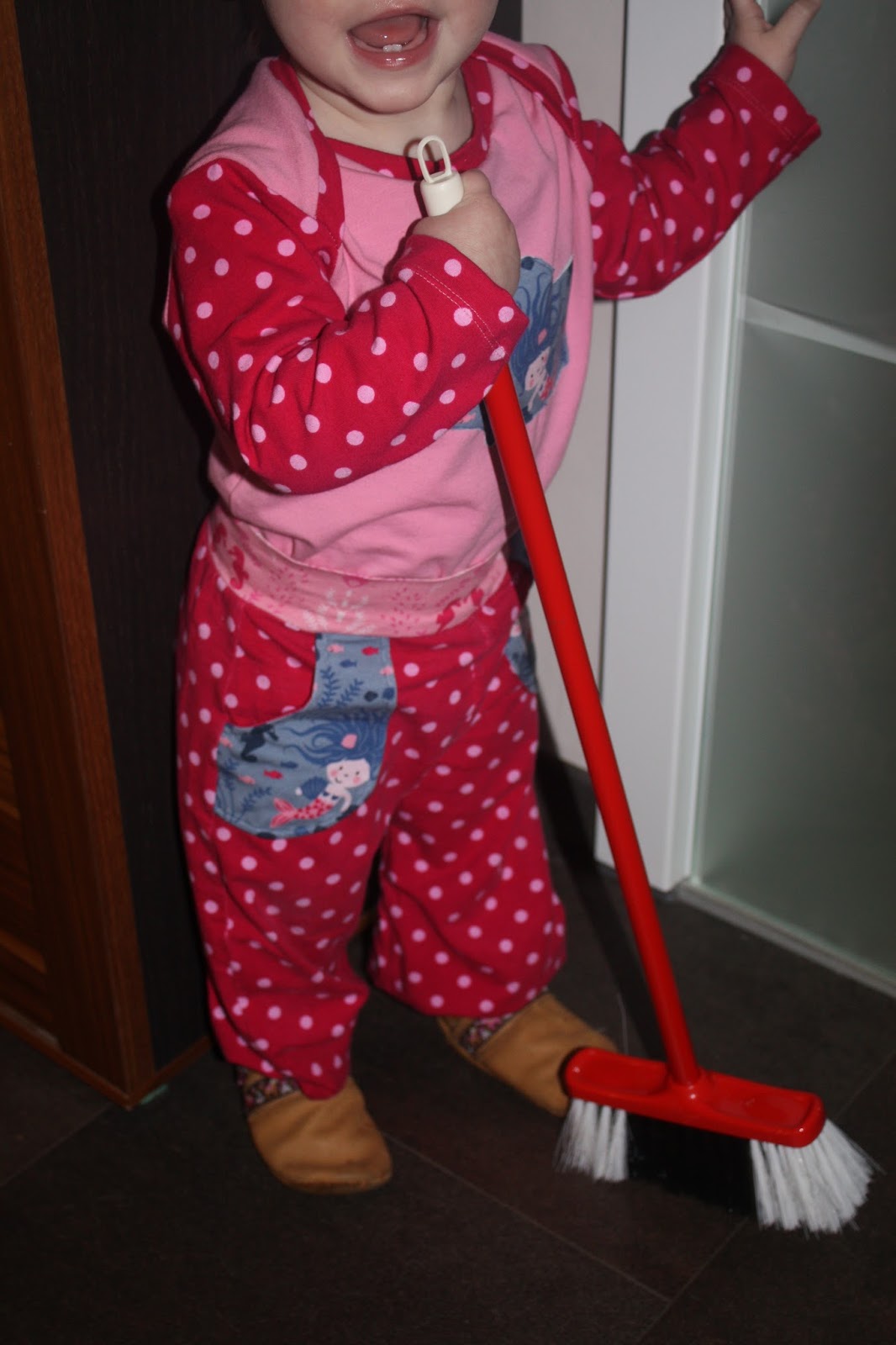 Ich finde es schön, wenn man zu den bunten Hosen auch ein passendes Oberteil hat. Wobei man aufpassen muss, dass es nicht zu gleich oder zu bunt wird, was dann schnell etwas von Schlafanzugcharakter hat. Schon vor Längerem habe ich ein Shirt und eine Hose aus dem Meerjungfrauen und Seepferdchen Stoff von Stoff und Liebe genäht, wobei mir diese beiden Teile nur einzeln gefallen und in Kombination zu viel sind. Also musste ein weiteres Shirt her. Da ich vom Meerjungfrauen-Stoff eh nur noch ein Ministück zum Applizieren übrig hatte, habe ich außer dem pinken Punkte Jersey von der Hose einen einfabigen rosa Jersey gewählt.