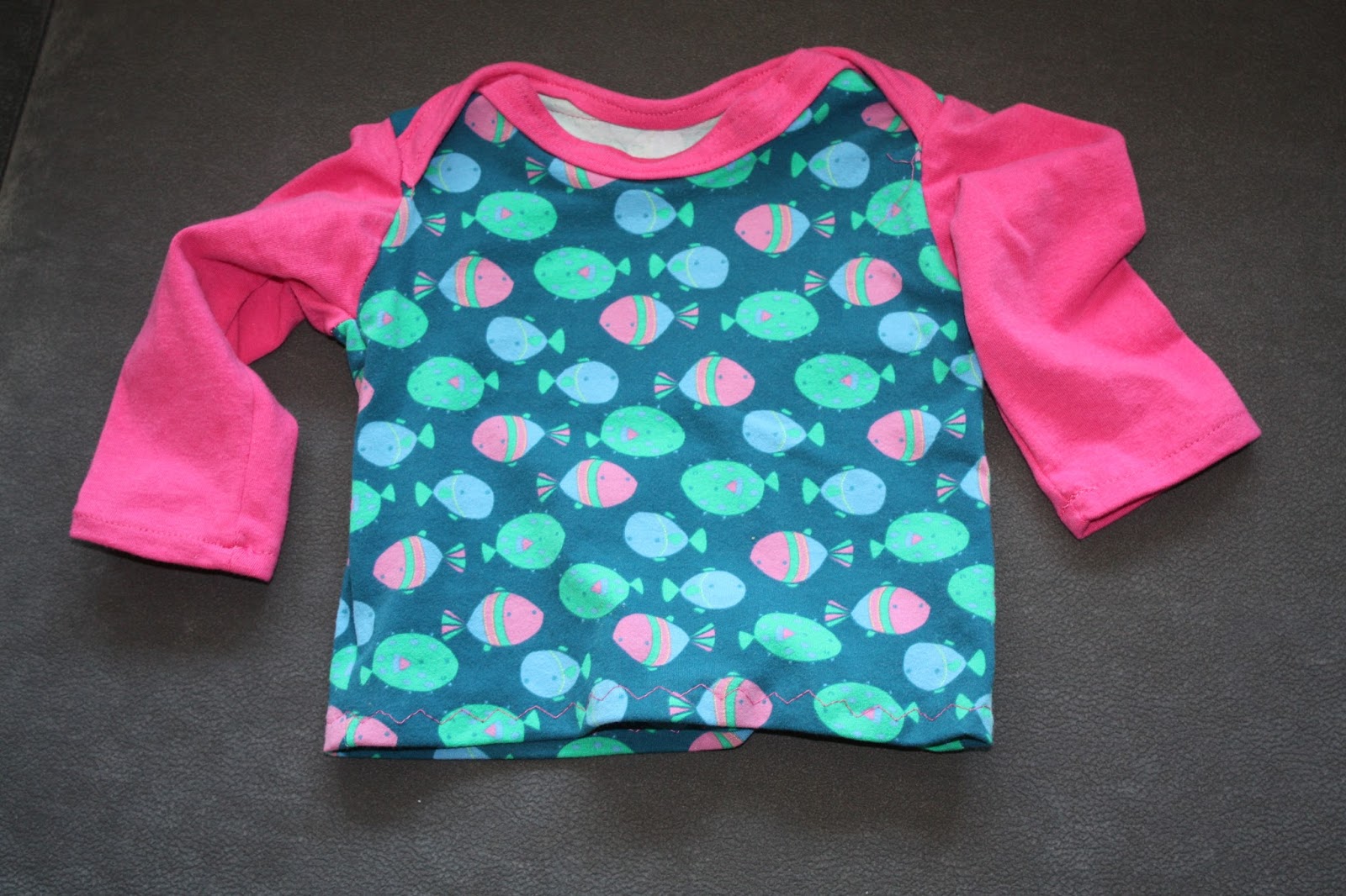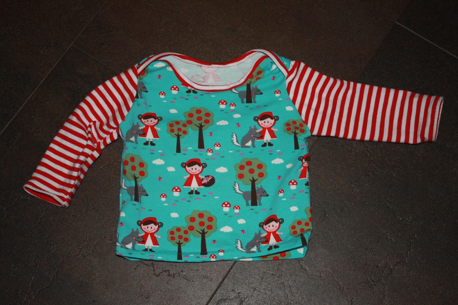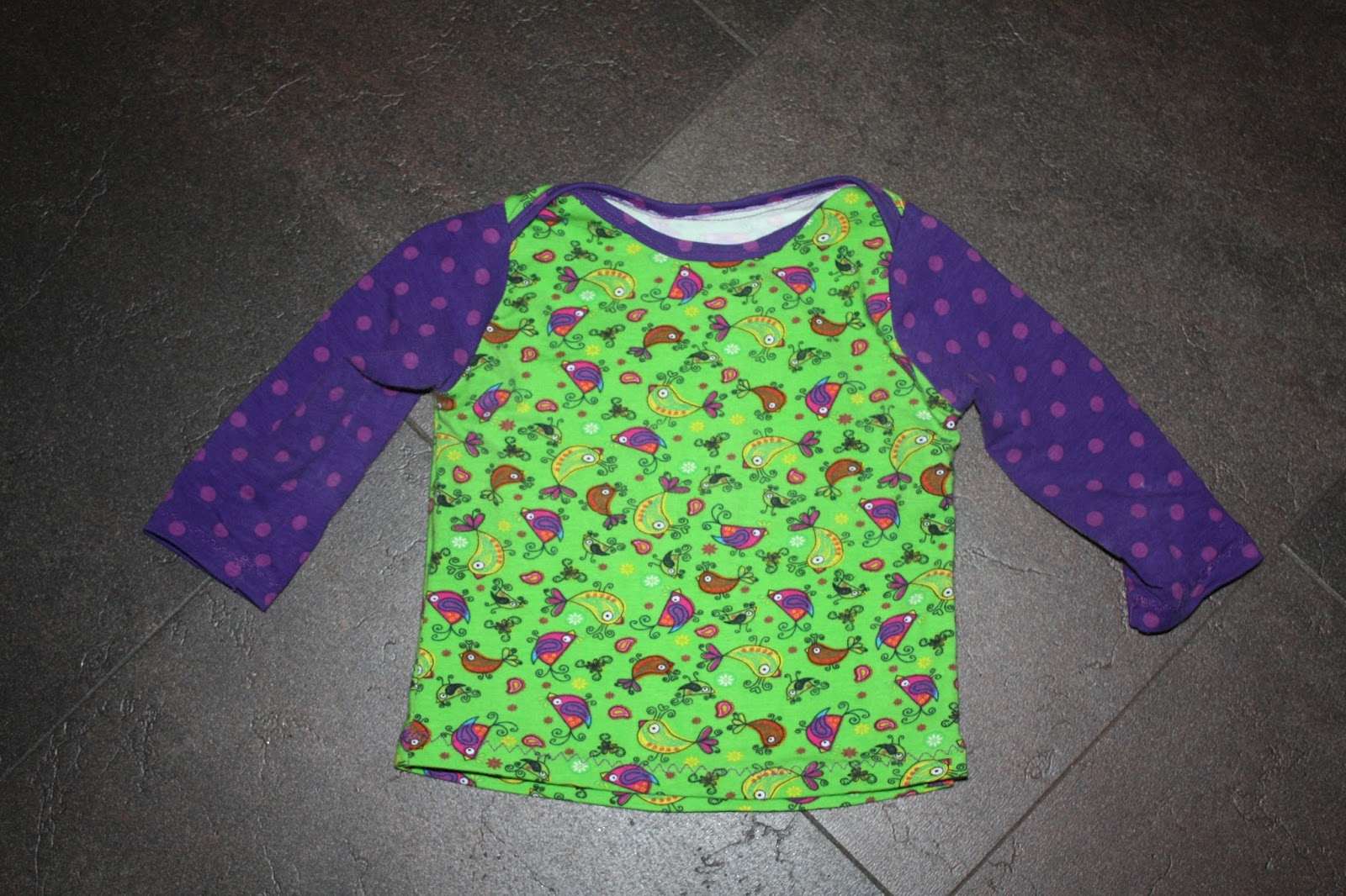 Erst einmal startete ich ein Probeversuch aus Stoffresten, die es sehr günstig im Angebot gab. Leider noch nicht ganz perfekt, denn man sieht das Zusammennähen der Schulter. Da muss ich drauf achten, hier nur in der Nahtzugabe zu nähen. Außerdem fällt das Shirt in Größe 68 im Vergleich zu den gekauften Oberteilen eher kleiner aus. Daher werde ich das nächste lieber schon eine Nummer größer nähen.