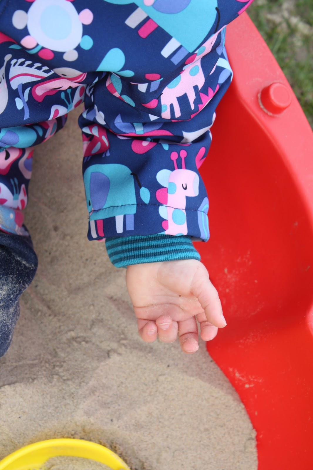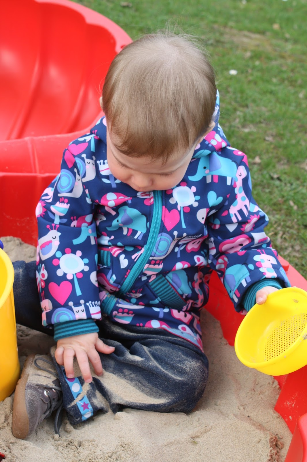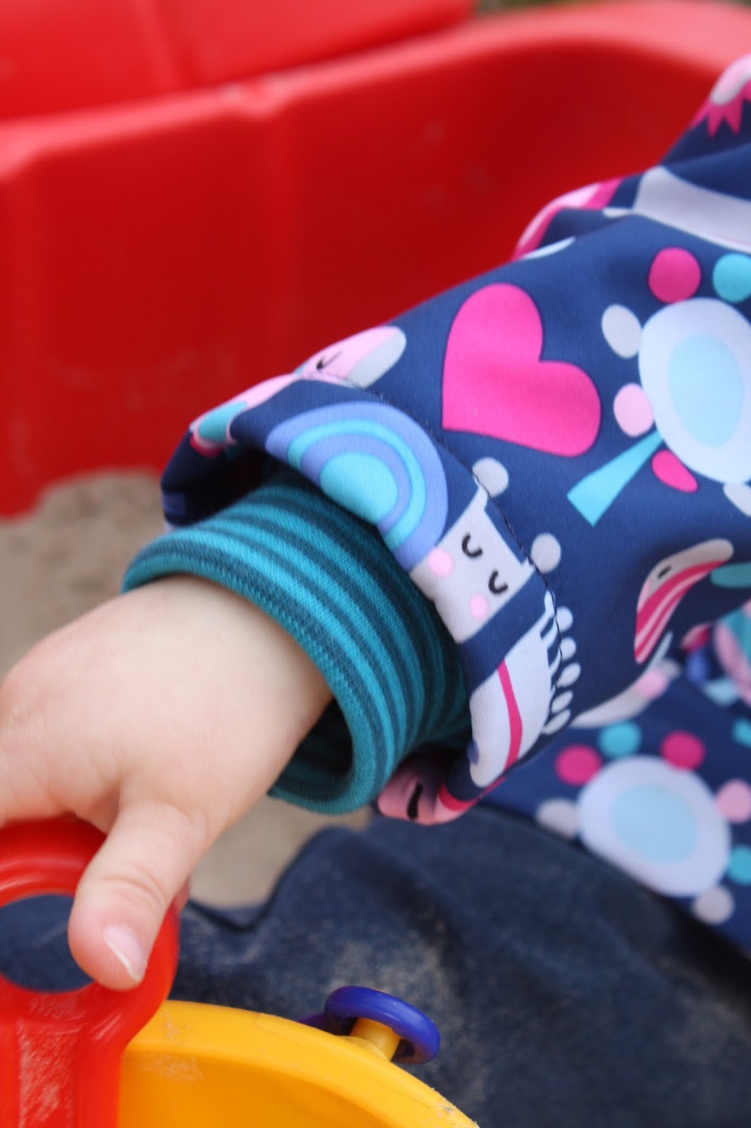 Die Länge ist super, die geht bis über den Po, was ich gerade bei „Regenjacken“ ideal finde. Von der Weite bin ich überrascht. Sie passt super und lässt auch noch ein klein wenig Luft, aber sie hätte nicht enger sein dürfen. Wahnsinn, dass man bei undehnbaren Softshell im Vergleich zum denhbaren Jersey tatsächlich so extrem viel mehr Weite benötigt. Wenn ich von Maditas derzeitigen Größe ausgegangen wäre, hätte die Jacke ja in Größe 92 laut Anleitung reichen müssen, aber das wäre mir zu knapp gewesen.