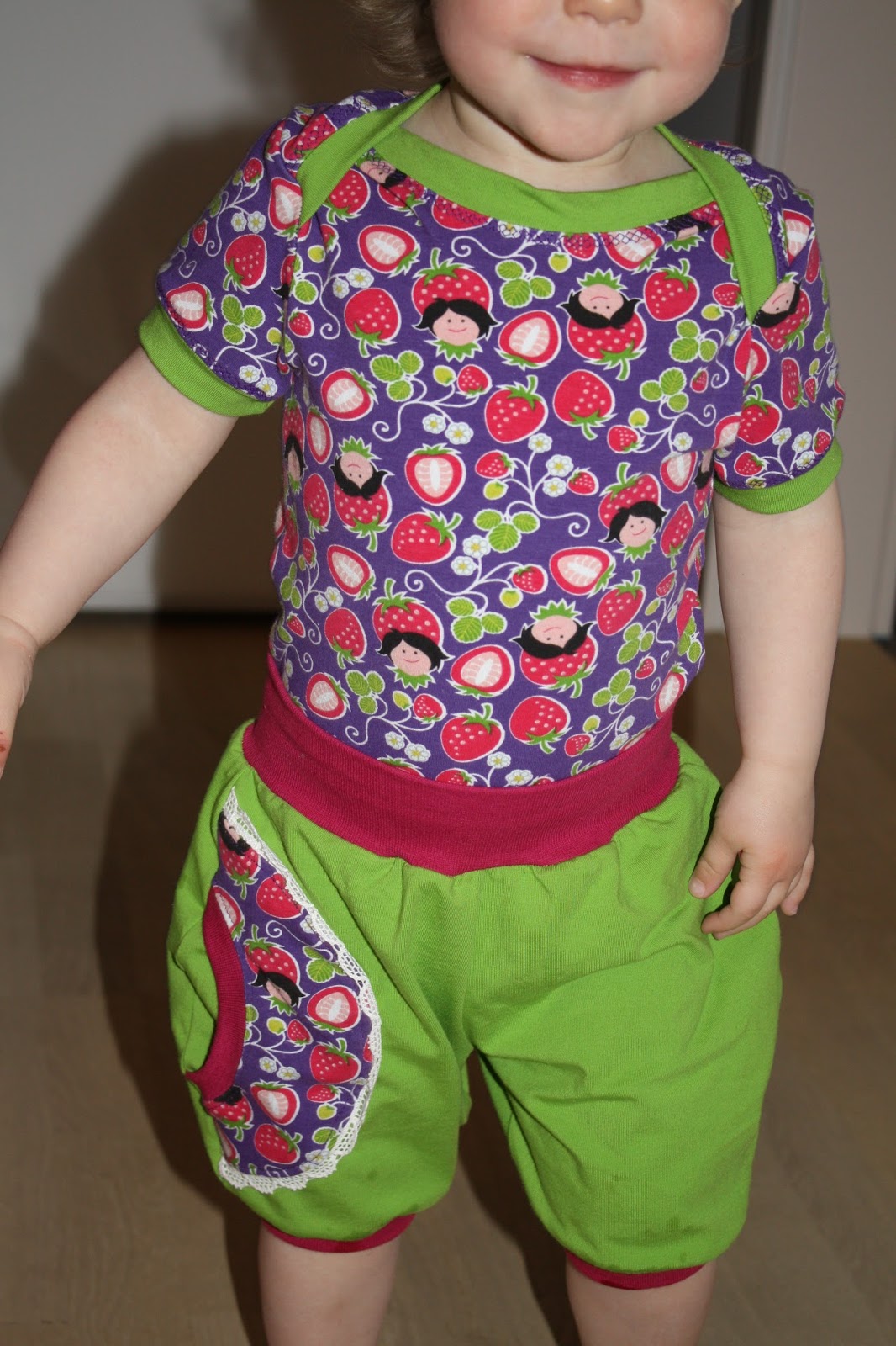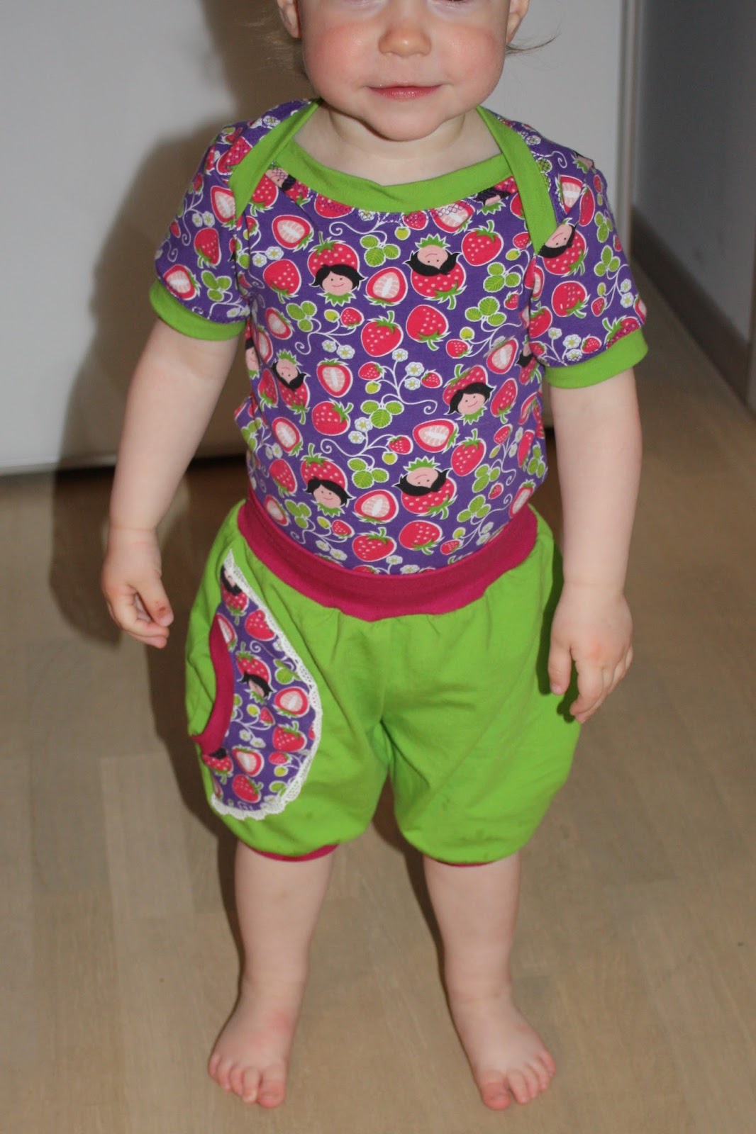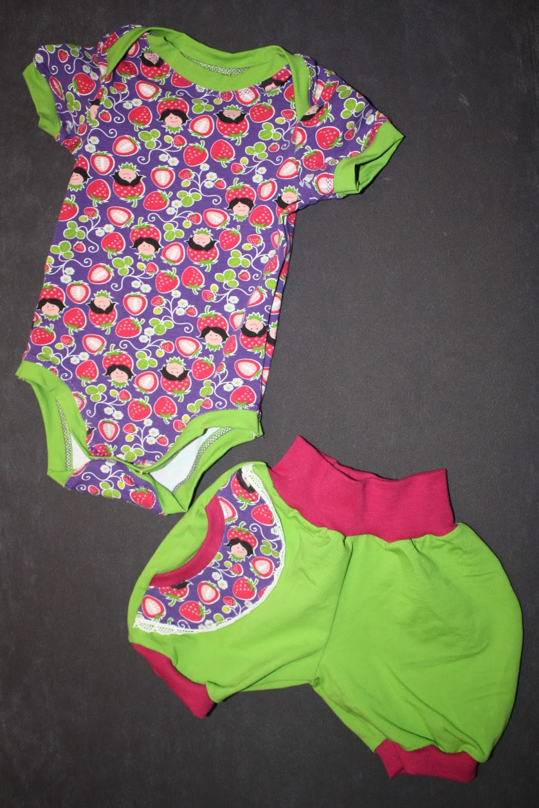 Ich habe ein erstes Sommerset in der nächsten Größe genäht. Dieses besteht aus einem Kurzarm-Body mit amerikanischen Ausschnitt nach dem Schnitt aus dem Buch „Nähen mit Jersey für Babys und Kids – Kinderleicht“ von Pauline Dohmen und aus einer kurzen Hose „Marina“ von MaThiLa.