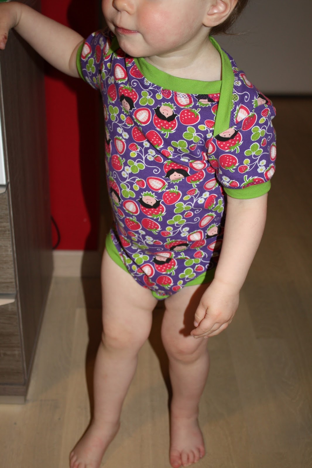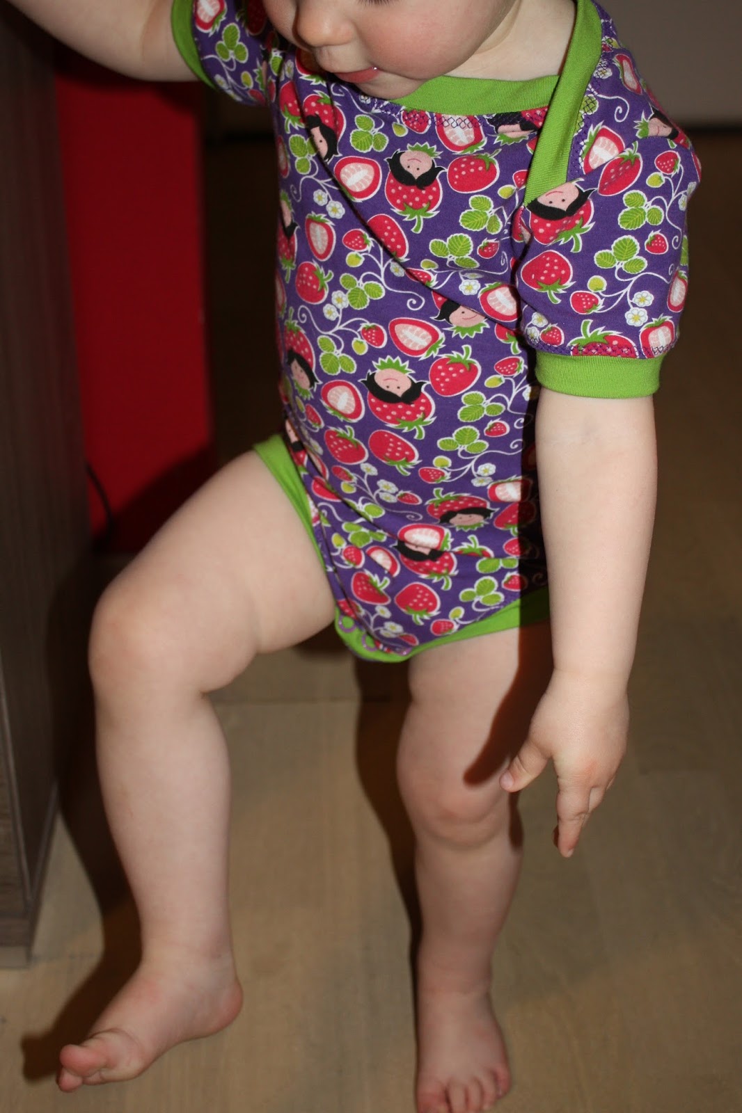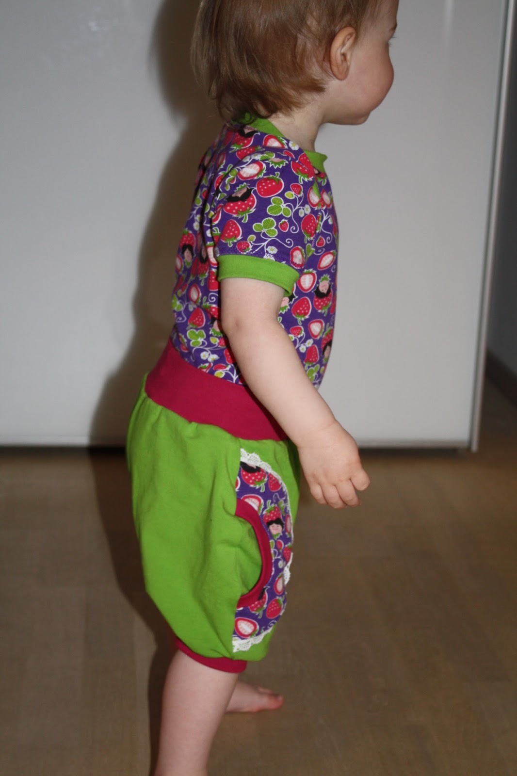 Ich habe ein erstes Sommerset in der nächsten Größe genäht. Dieses besteht aus einem Kurzarm-Body mit amerikanischen Ausschnitt nach dem Schnitt aus dem Buch „Nähen mit Jersey für Babys und Kids – Kinderleicht“ von Pauline Dohmen und aus einer kurzen Hose „Marina“ von MaThiLa.