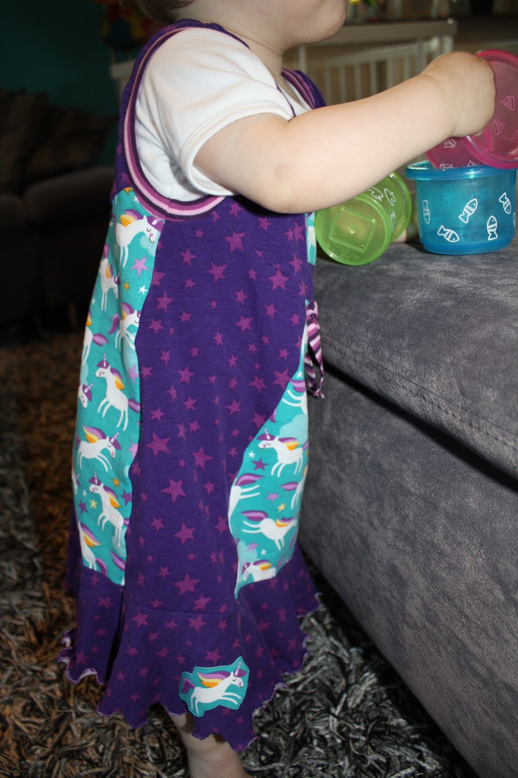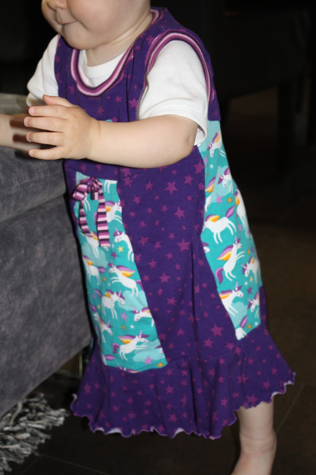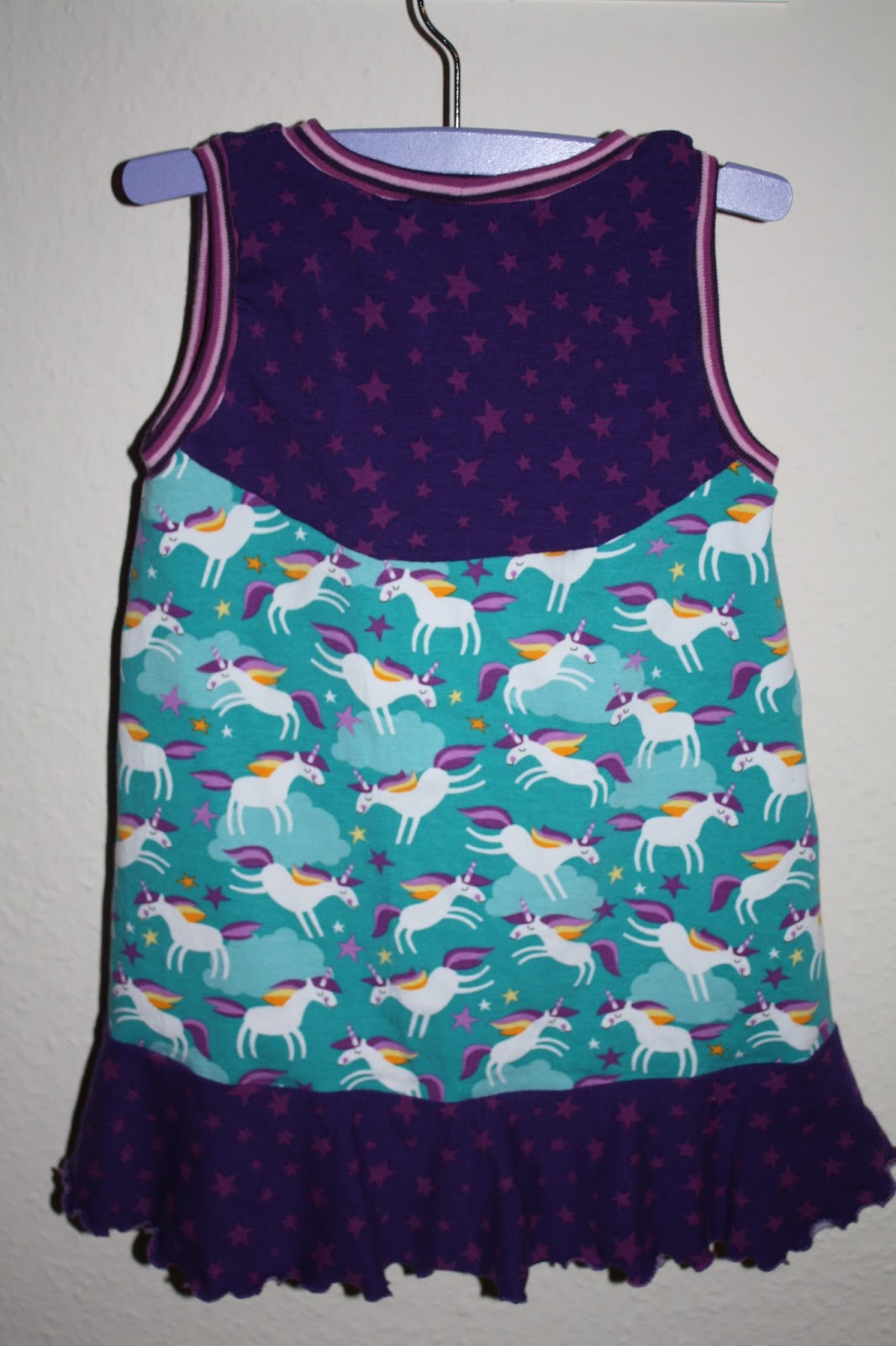 Ein Trägerkleid nach dem Schnitt von Klimperklein in der nächsten Größe ist fertig. Weil ich nicht mehr genug von dem Lenis Dream Stoff hatte, habe ich die Variante mit der oberen Unterteilung gewählt und einen Volant angenäht. Außerdem habe ich aus Stoffmangel das Mittelstück nach eigener Schablone ebenfalls unterteilt. Damit die Vorderseite trotzdem „genug Einhörner“ 😉 hat, gab es noch zwei Applikationen. Dafür habe ich auf die falsche Knopfleiste verzichtet. Als kleine Deko gab es eine Schleife aus Bündchen die mittig mit einem Knopf versehen wurde. Wie schon bei den ersten beiden Kleider habe ich es statt mit einem normalen umgeschlagenen Saum mit einem Wellensaum versehen.