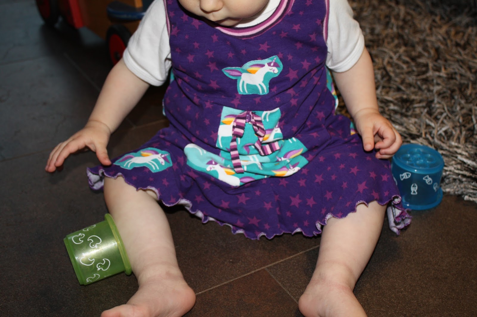 Auf Vorrat ist das Kleid in Größe 86 genäht. Es ist daher im Moment noch sehr lang. Außerdem ist der Halsausschnitt sehr weit. Das Bündchen ist sehr dehnbar und obwohl ich es schon die vorgeschlagenen 10% kürzer gemacht habe, wellt es sich dennoch hinten etwas und steht ab. Angezogen fällt es nicht so auf. Daher werde ich es erst mal so lassen und noch mal schauen, wenn Madita in die Größe reingewachsen ist. Sollte es dann immer noch zu weit sein, kann ich es dann wieder abtrennen und kürzen.