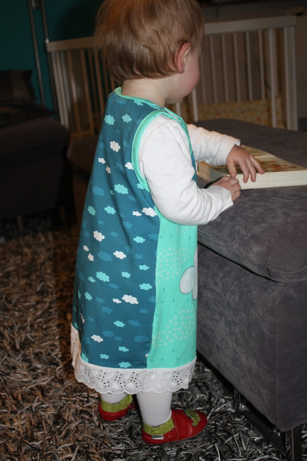 Da ich den Schnitt in Größe 86 ja nicht zum ersten Mal genäht habe, war klar, dass das Kleid schon tragbar, aber noch sehr reichlich ist.